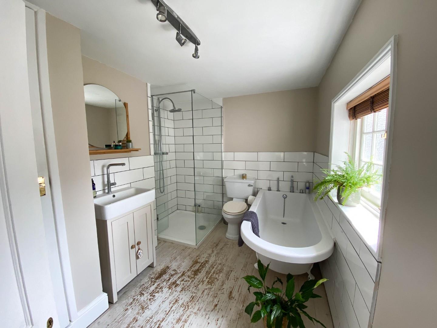 Upstairs there are two large double bedrooms, both with fitted storage cupboards and a luxury family bathroom, boasting both walk-in shower and a roll-top claw-foot bath.