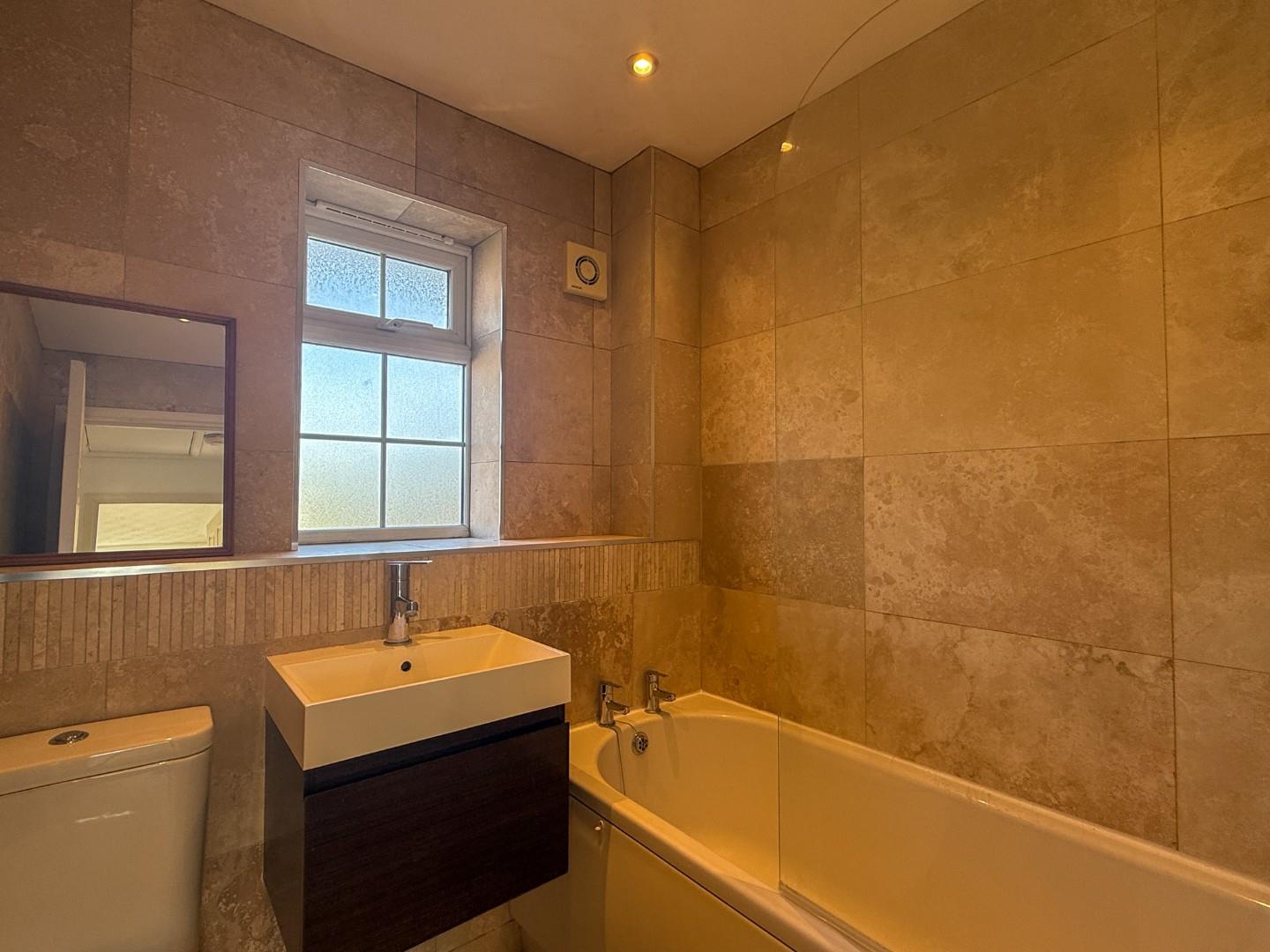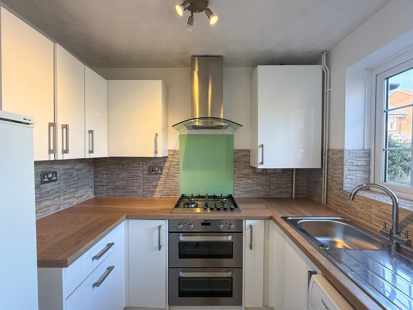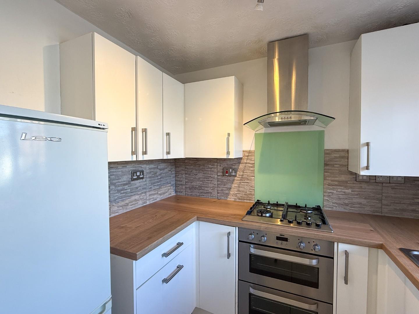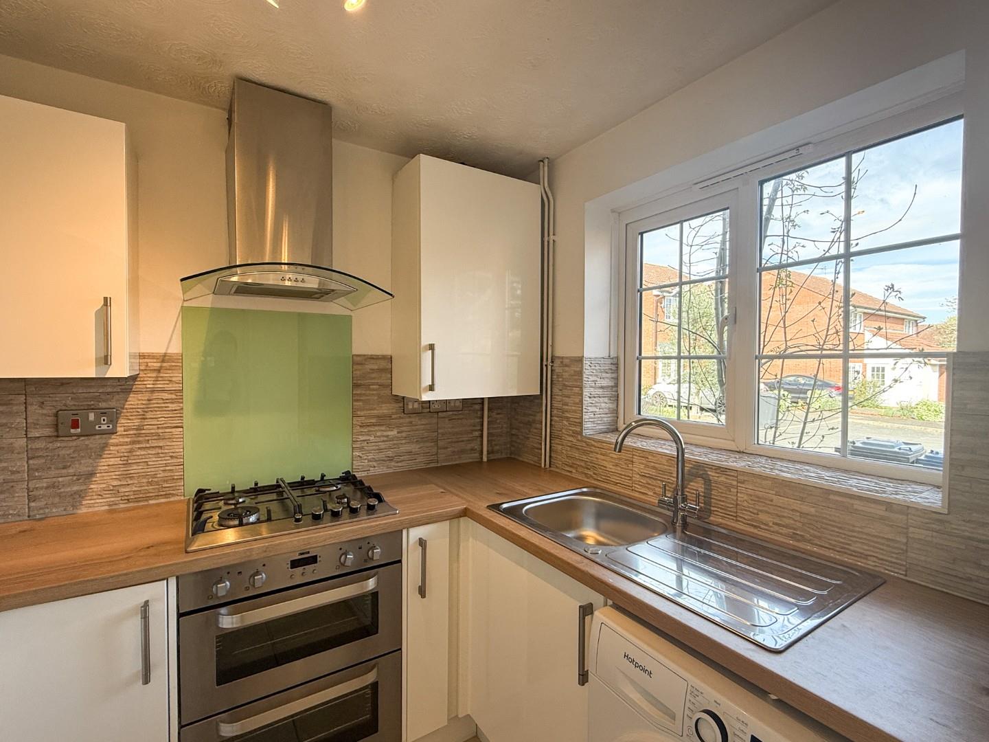 The property comprises a well-equipped kitchen complete with built-in oven, hob, fridge freezer, and washing machine, along with a bright reception room and a convenient downstairs WC. Upstairs, there are two spacious double bedrooms and a modern family bathroom featuring a bath with overhead shower, WC, and basin. To the rear, the property benefits from an enclosed garden, providing an excellent outdoor space, as well as allocated off-road parking.