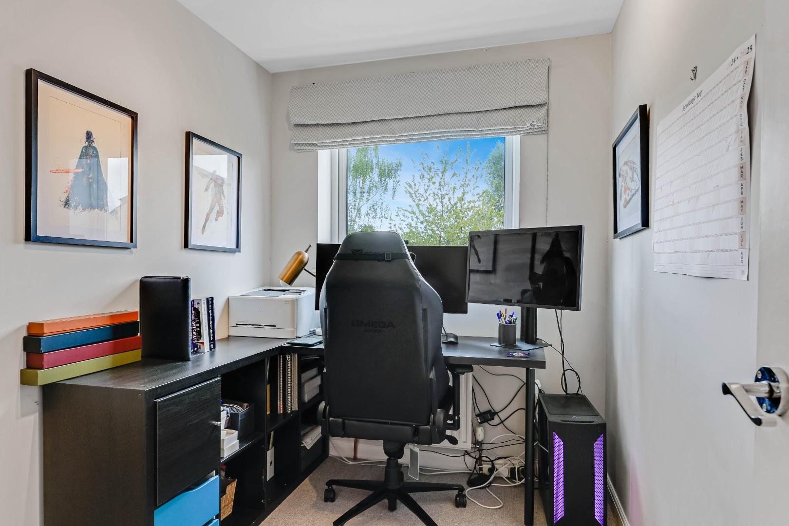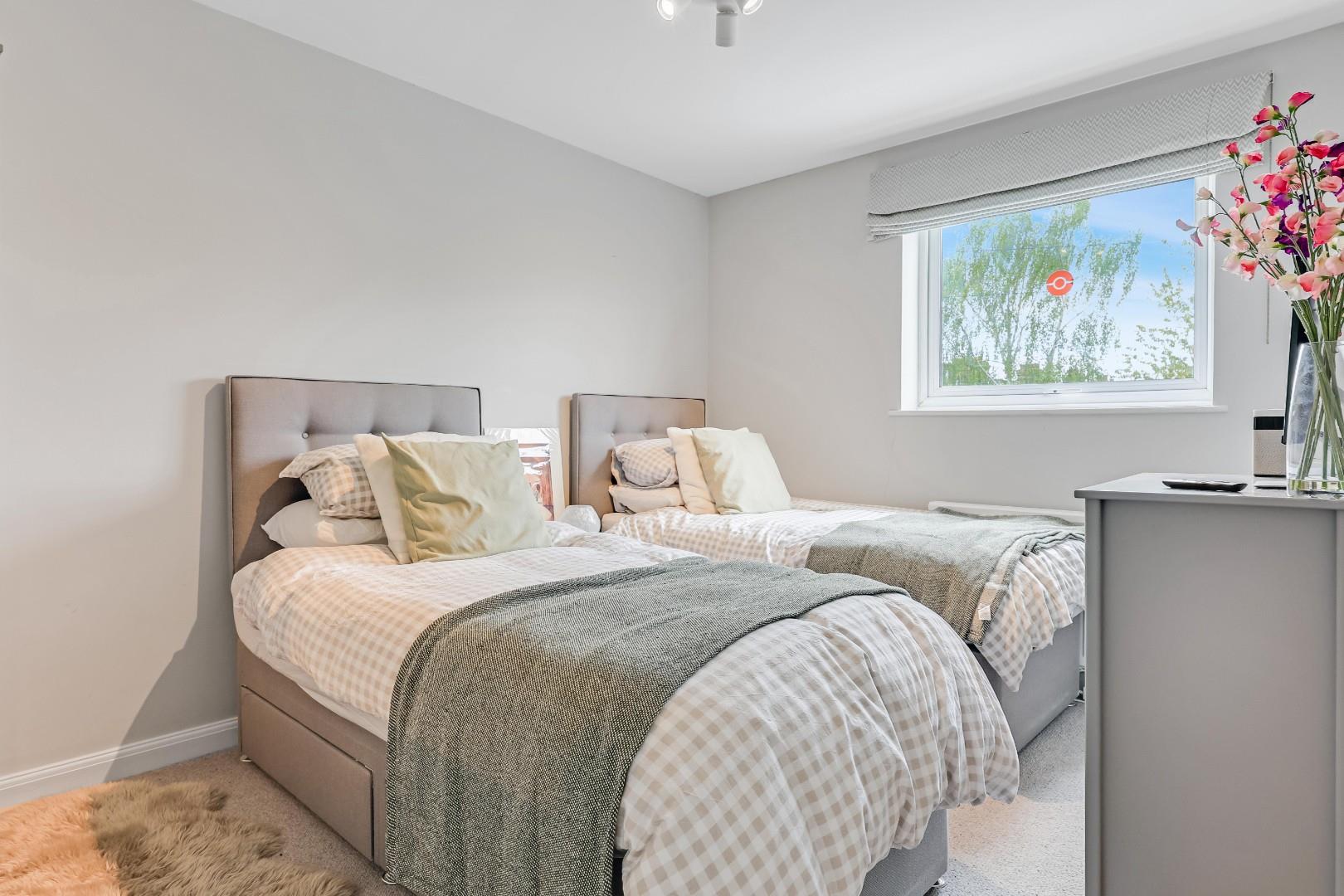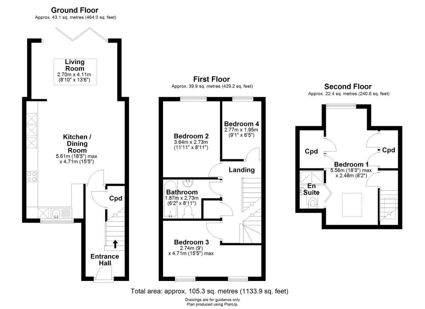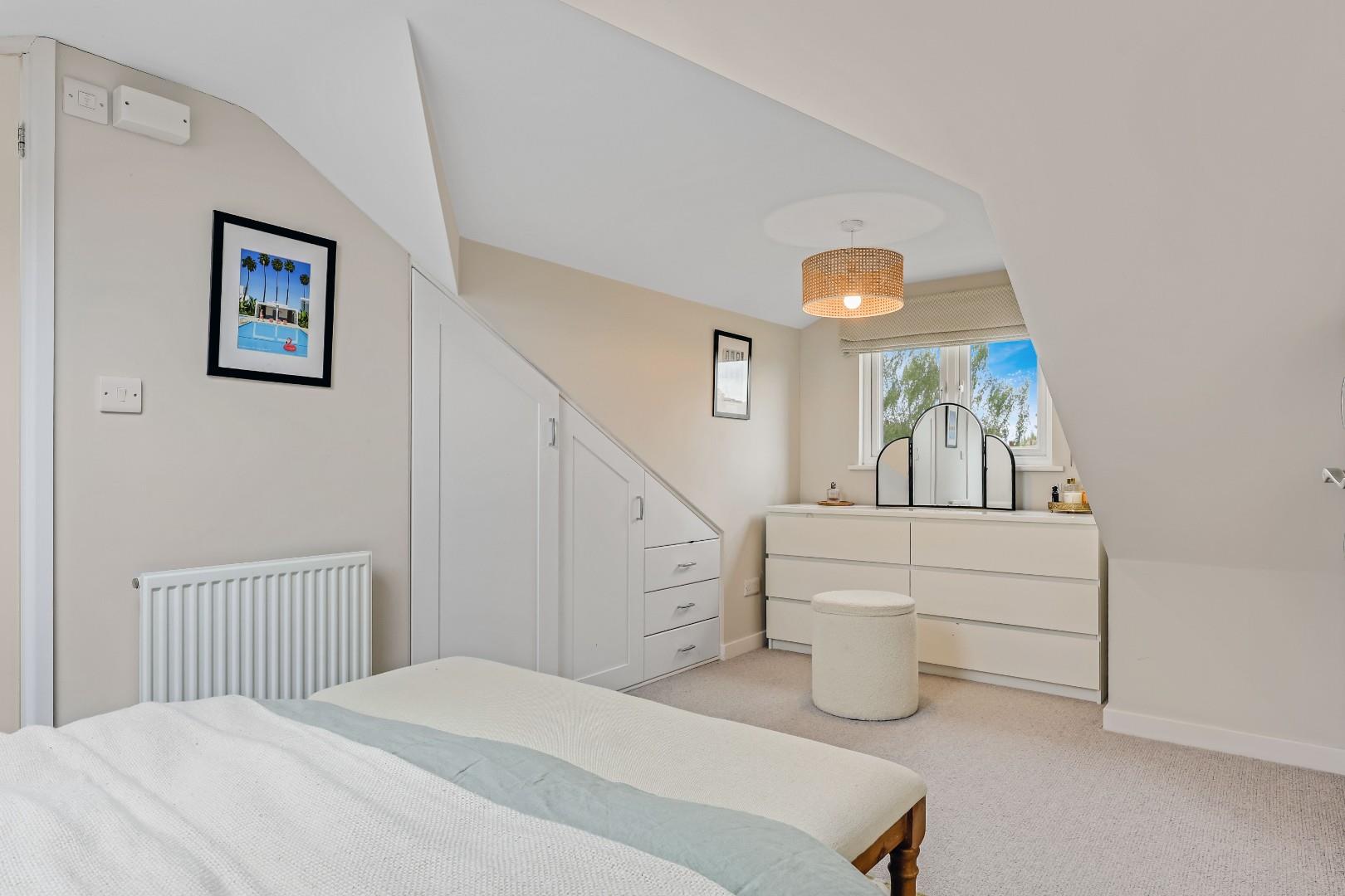 Upstairs, the first-floor landing leads to three bedrooms and a refitted bathroom suite. A staircase leads to a large second floor principal bedroom with an ensuite shower room and a generous built-in storage/hanging space.