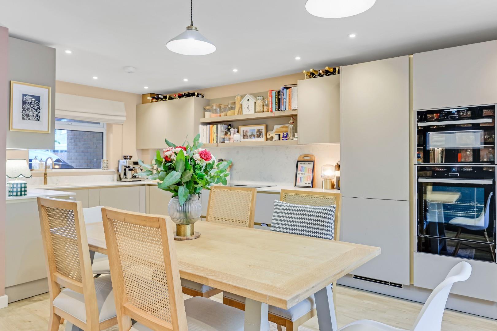 The accommodation comprises a reception hall with a concealed understairs storage cupboard, leading to an impressive reception space with access to and views of the garden. This generous open plan space enjoys a high degree of natural light and offers a well-equipped and well-designed modern kitchen with a full range of integrated appliances and quartz working surfaces. A large rustic dresser enhances the dining space and provides additional storage solutions. A full width sitting area with a large sky lantern and bifold doors completes this space.