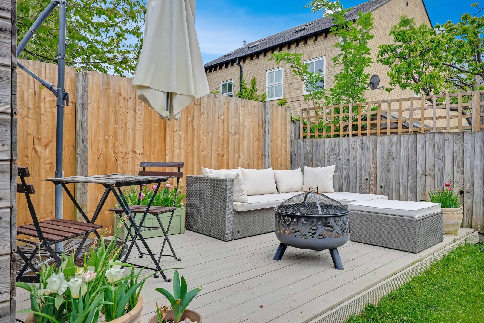 The rear garden is private and fully enclosed with gated pedestrian access. The garden was recently landscaped and provides two decked seating areas, a lawn with well-stocked borders of colourful and scented plants and flowers and a useful timber storage shed.