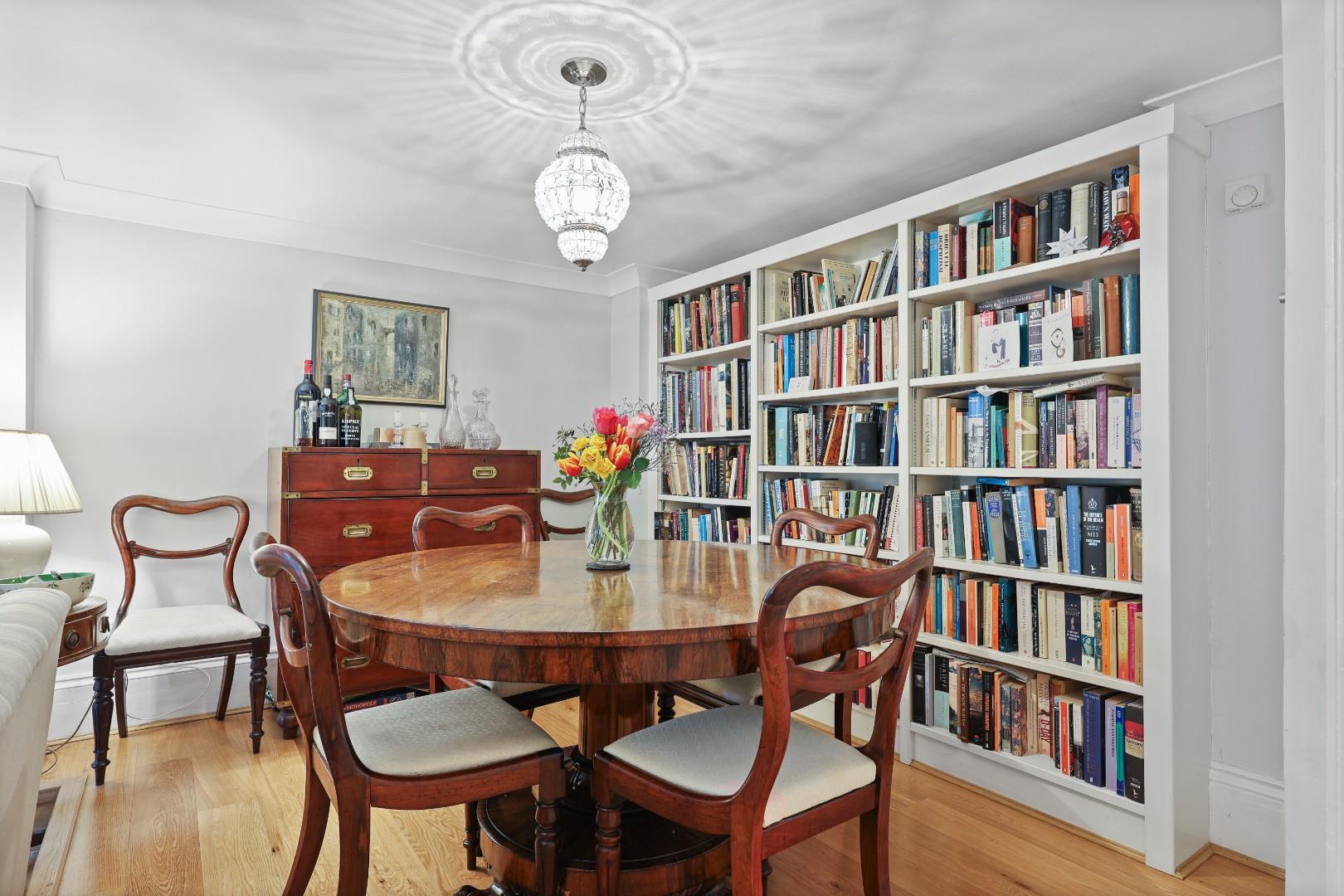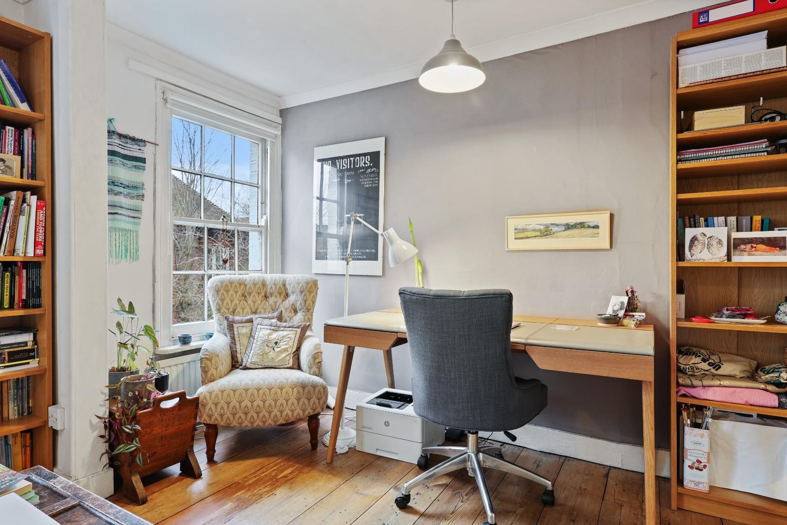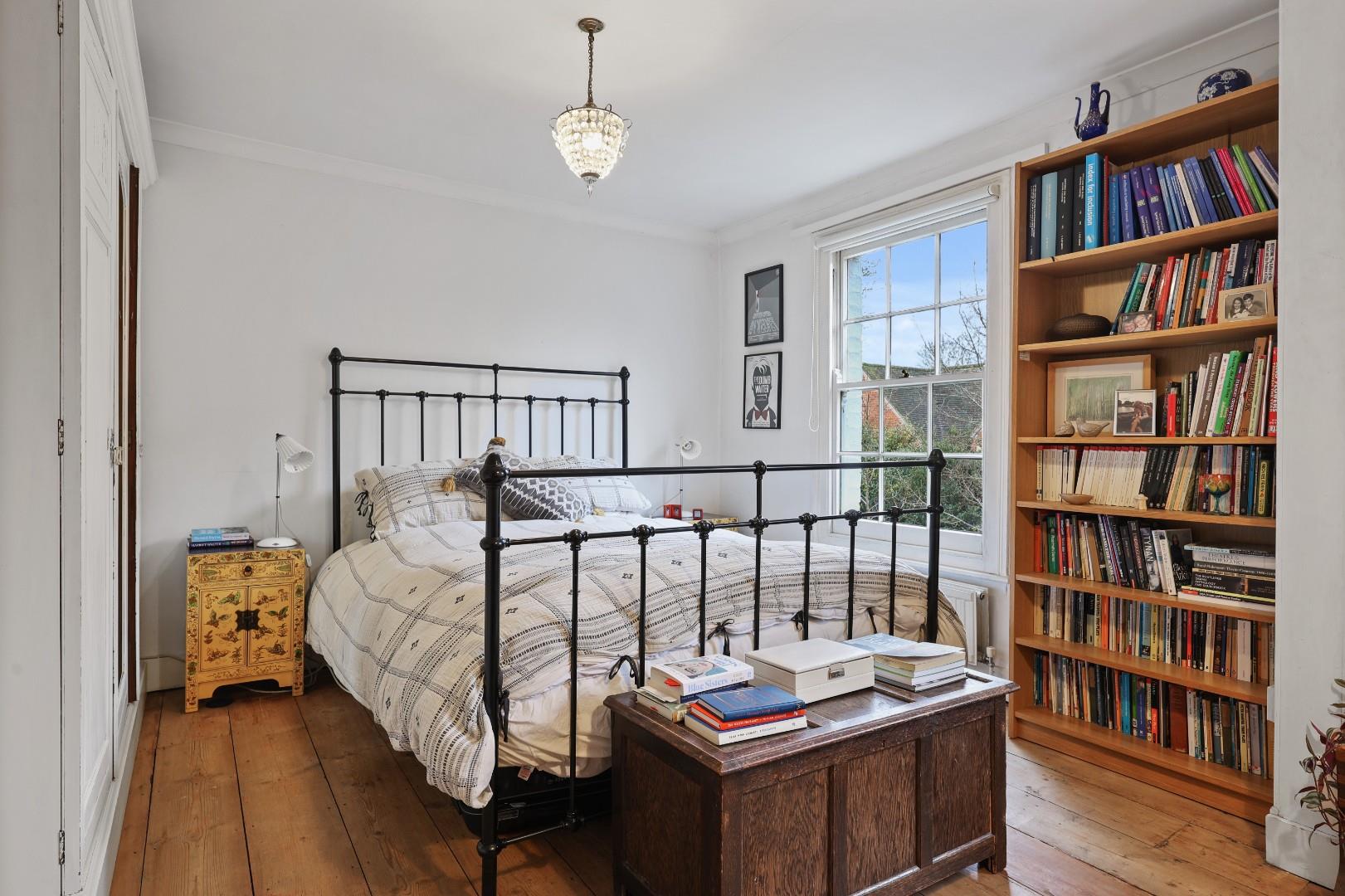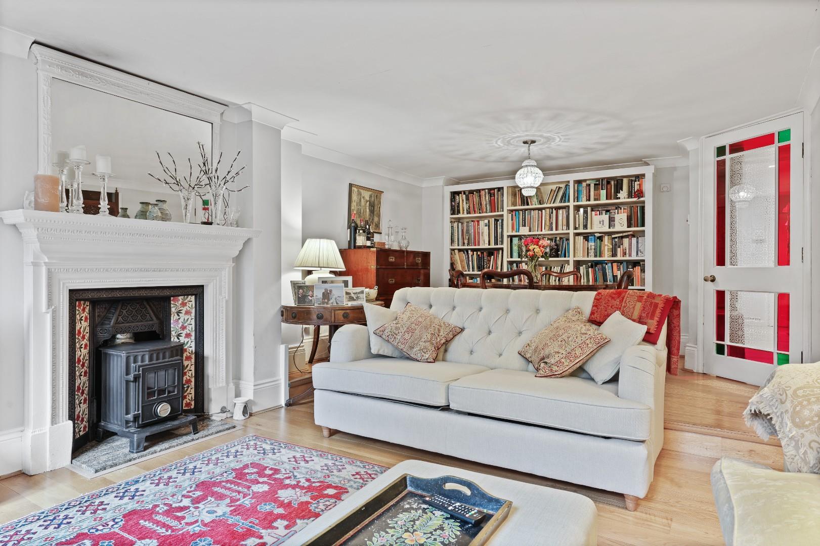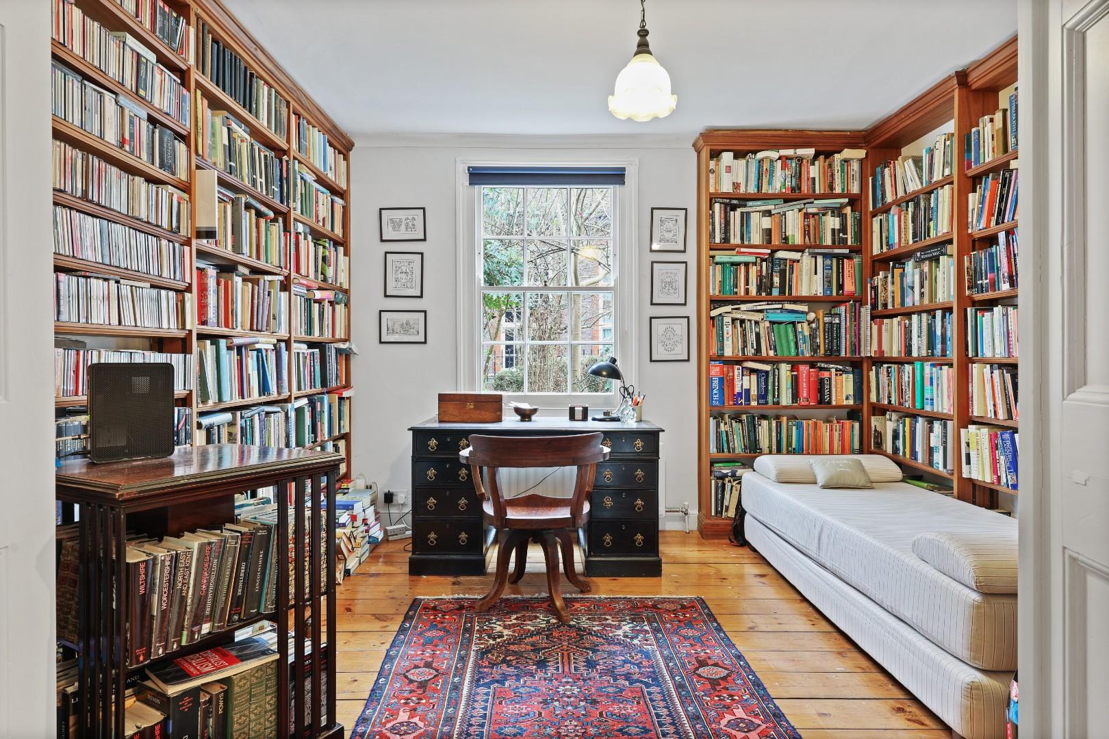 The accommodation comprises a reception hall with a staircase leading to the upper floors and the lower ground floor level. The ground floor reception room widens to the rear and has two glazed, double French doors with Juliet balconies overlooking the rear gardens and wall-mounted book shelving. Folding doors from this room open into a charming bedroom/study with a tall sash window and extensive book shelving.