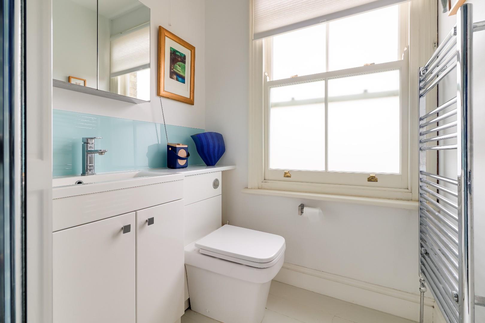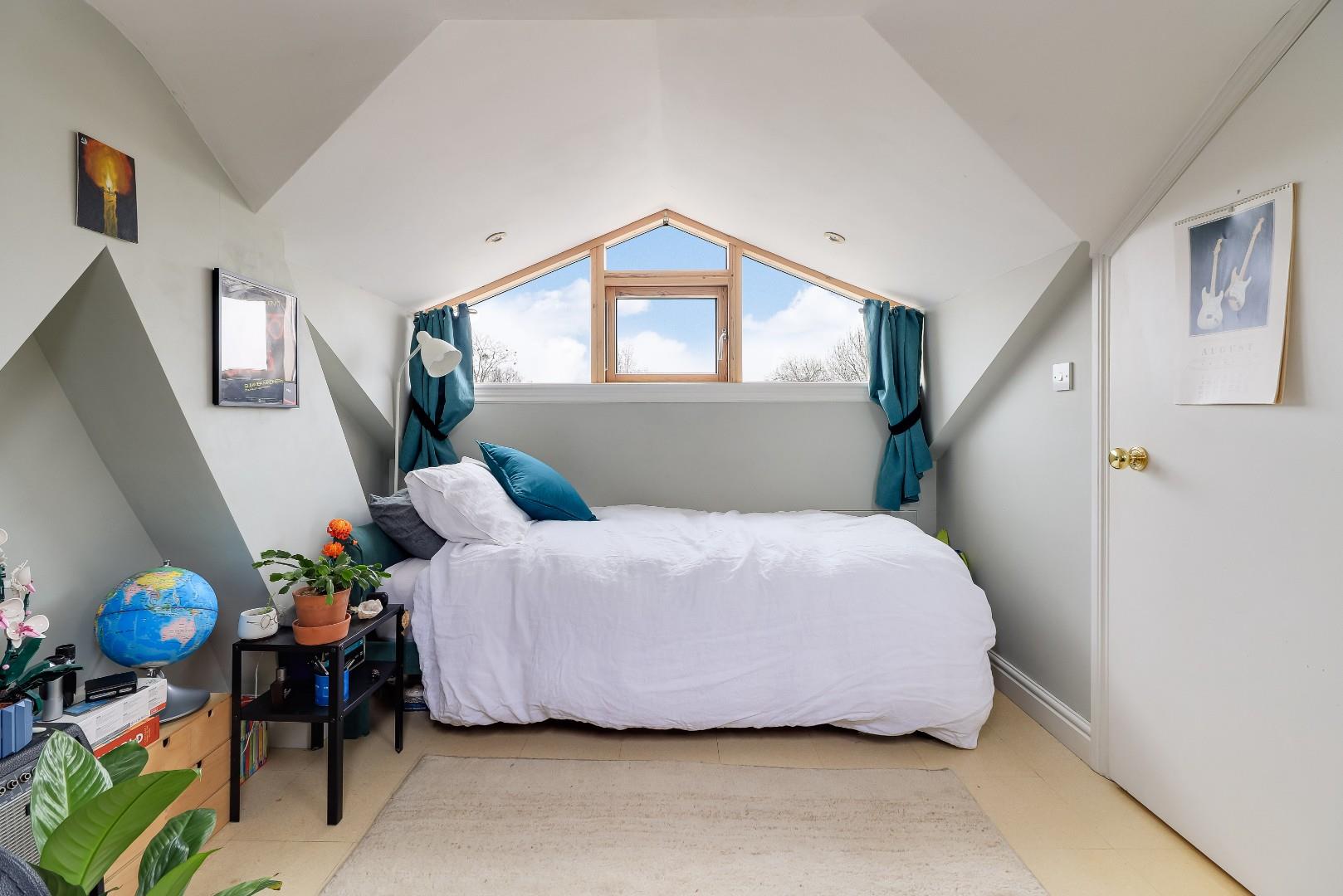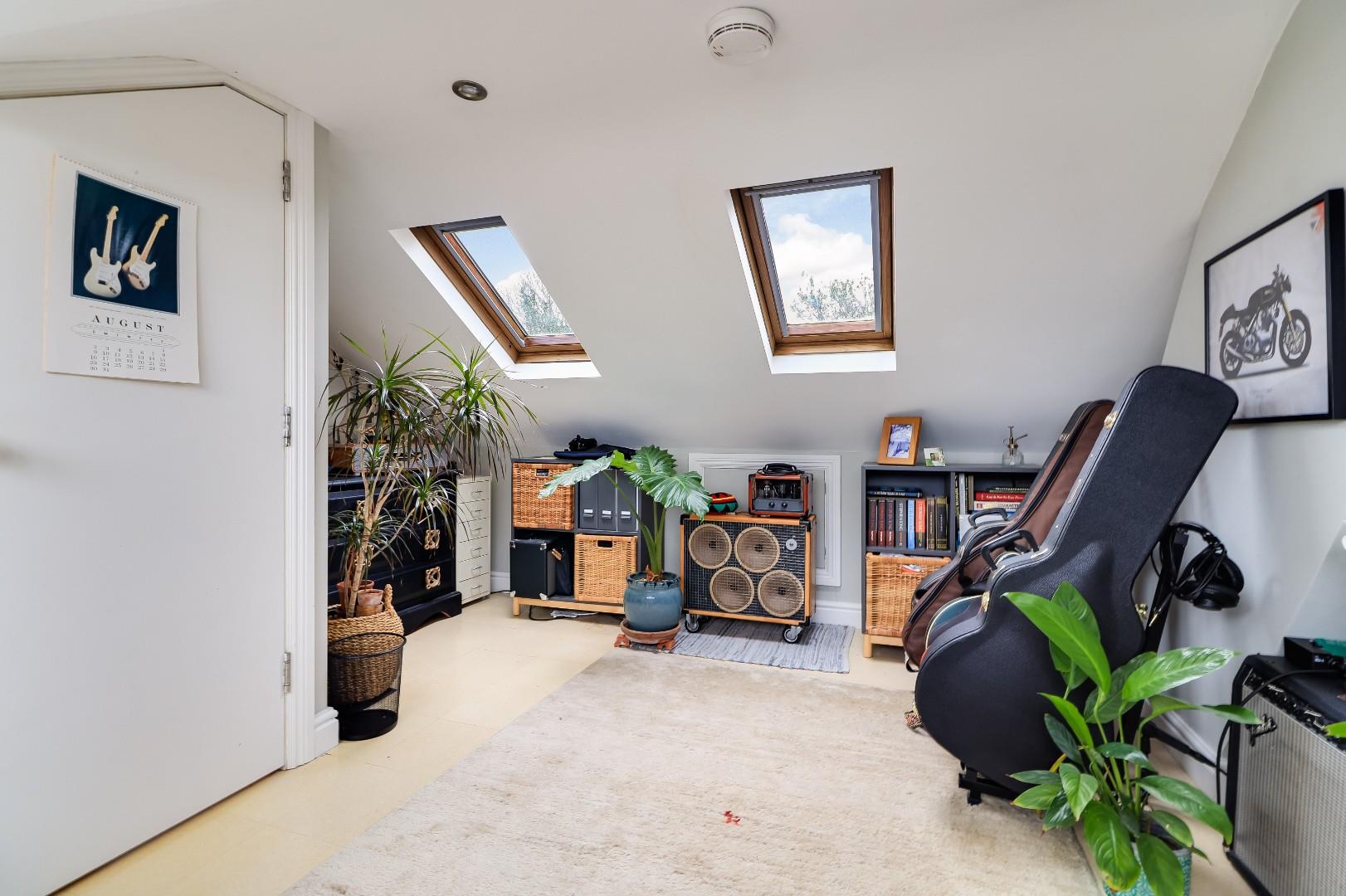 To the first floor is a large landing area with an airing cupboard, off the landing is a large master bedroom with a sash window towards the front as well as a fitted shelved cupboard to the side of the chimney stack. Completing the first floor is a family shower room with a low-level WC, sink with vanity unit below, a heated towel rail and a large walk-in shower. To the second floor is the converted attic space which has been converted into a bedroom. The attic room is ideal for a teenager or as a guest room with a feature pitched wooden window overlooking the rear garden and two Velux windows drawing in further light. The feature window is 'Rationel’ composite powder coated aluminum and timber. The sash windows in the property are made from hardwood timber, double glazed, 'heritage' windows made by a local craftsman.