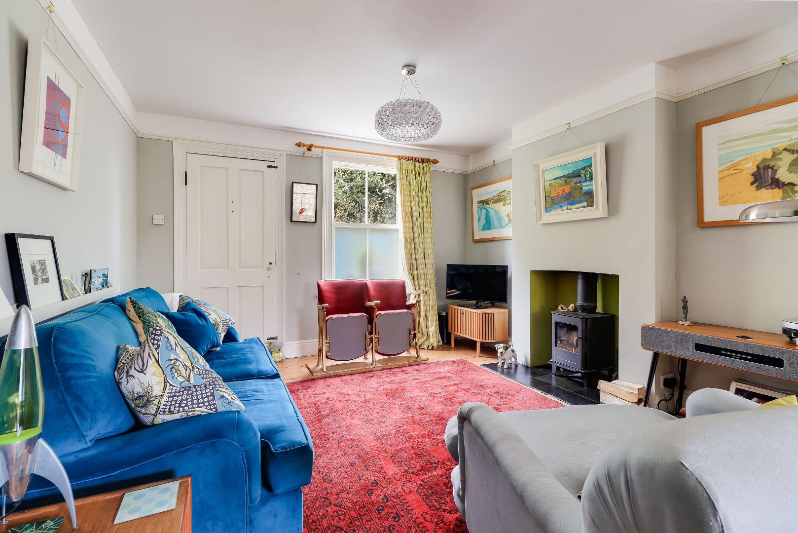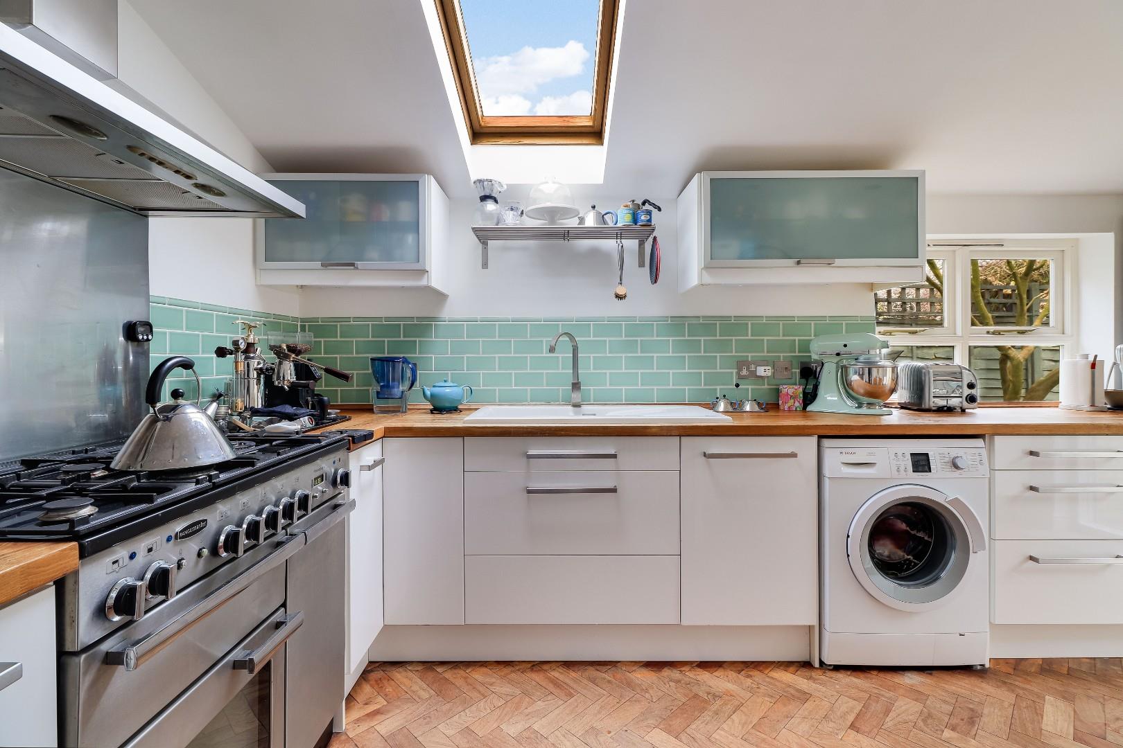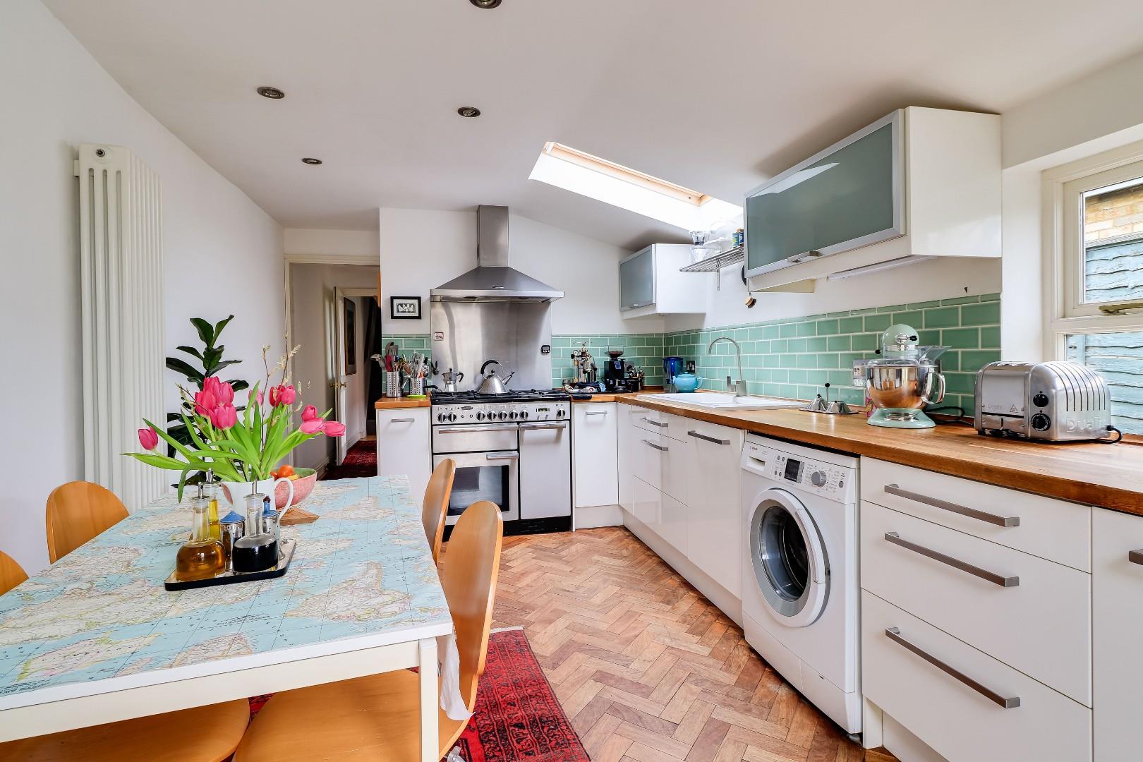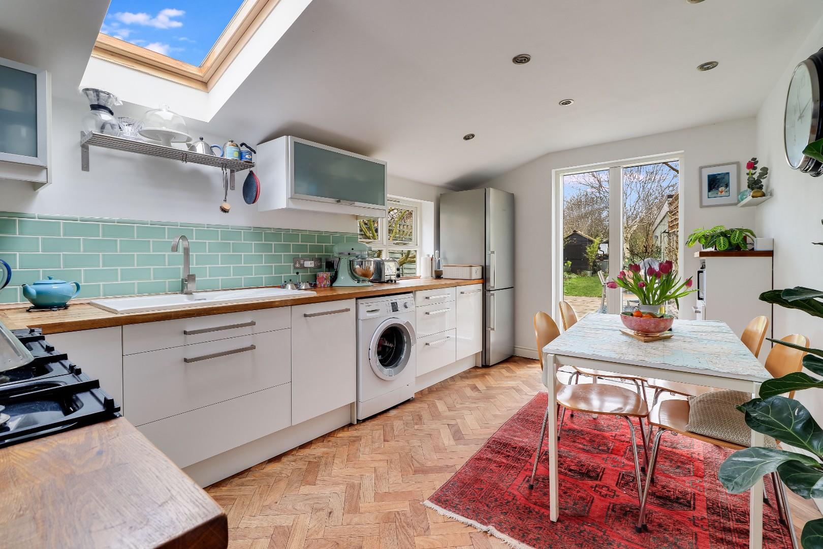 To the ground floor the property comprises a rear lobby which the current owner uses as the main entrance to the property. There is an open plan Living/Dining room, which was previously two separate reception spaces, and which has a Morsø multifuel stove. There is a study which could also be used as a bedroom, and to the rear of the property is a stunning kitchen/breakfast room with herringbone parquet wood flooring, French doors open onto the patio and a Velux window all contribute to large levels of natural light flooding the kitchen. The kitchen benefits from feature tiles splash back, storage at both base level and eye level, a large oak work surface, a ceramic sink with drainer and space for white goods. The french doors and rear door are all Velfac composite powder-coated aluminium and timber, for ease of maintenance.