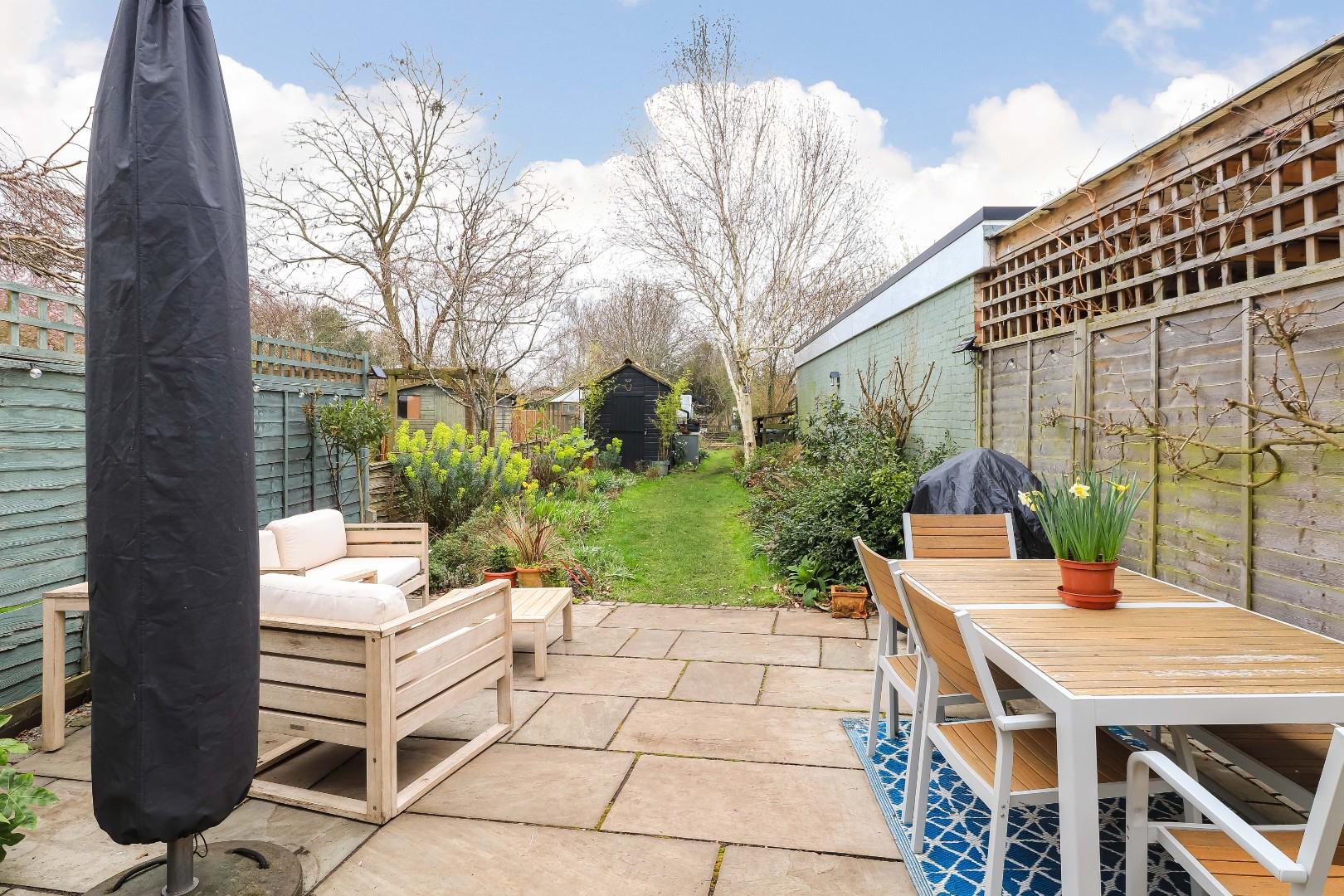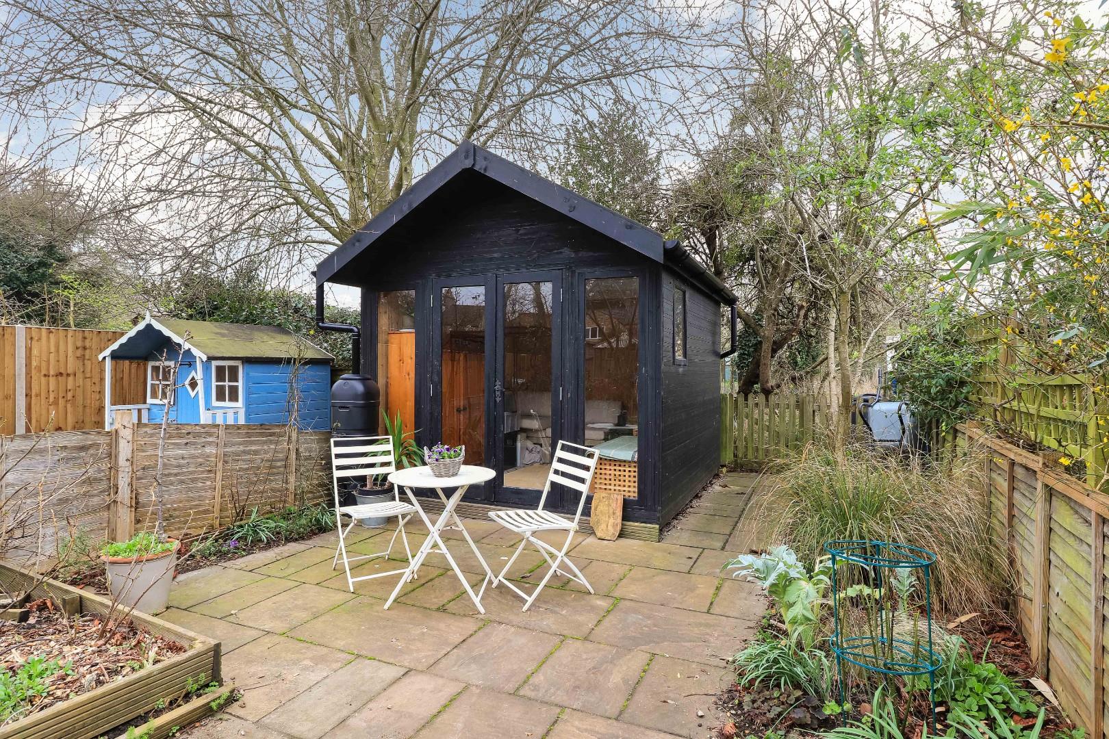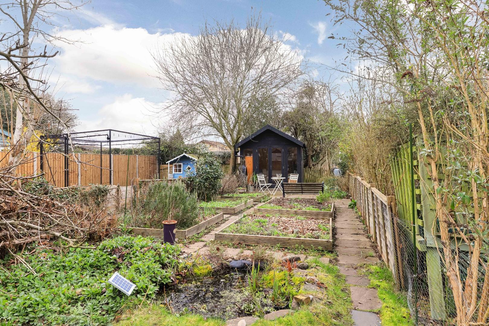 Externally, the sizeable rear garden, which is approaching 100ft in length, is split into three parts. Off the kitchen breakfast room is a large patio area ideal for alfresco dining in the warmer months of the year and benefitting from ample space for an array of patio furniture. To the middle of the garden is a large lawn area with herbaceous borders and a mature silver birch tree and a green house. To the far end of the garden is a mature plot with raised vegetable beds, a small nature pond and a patio off the timber-built summer house.
