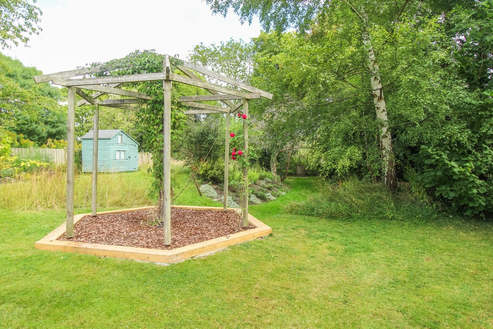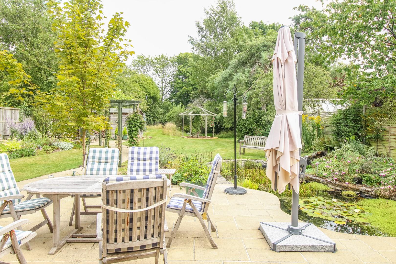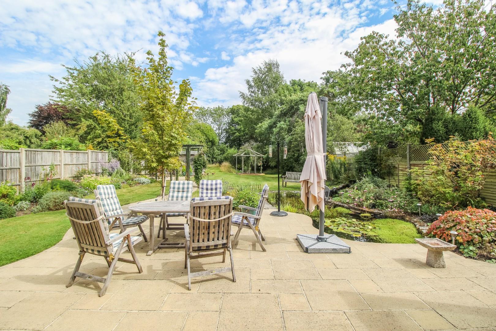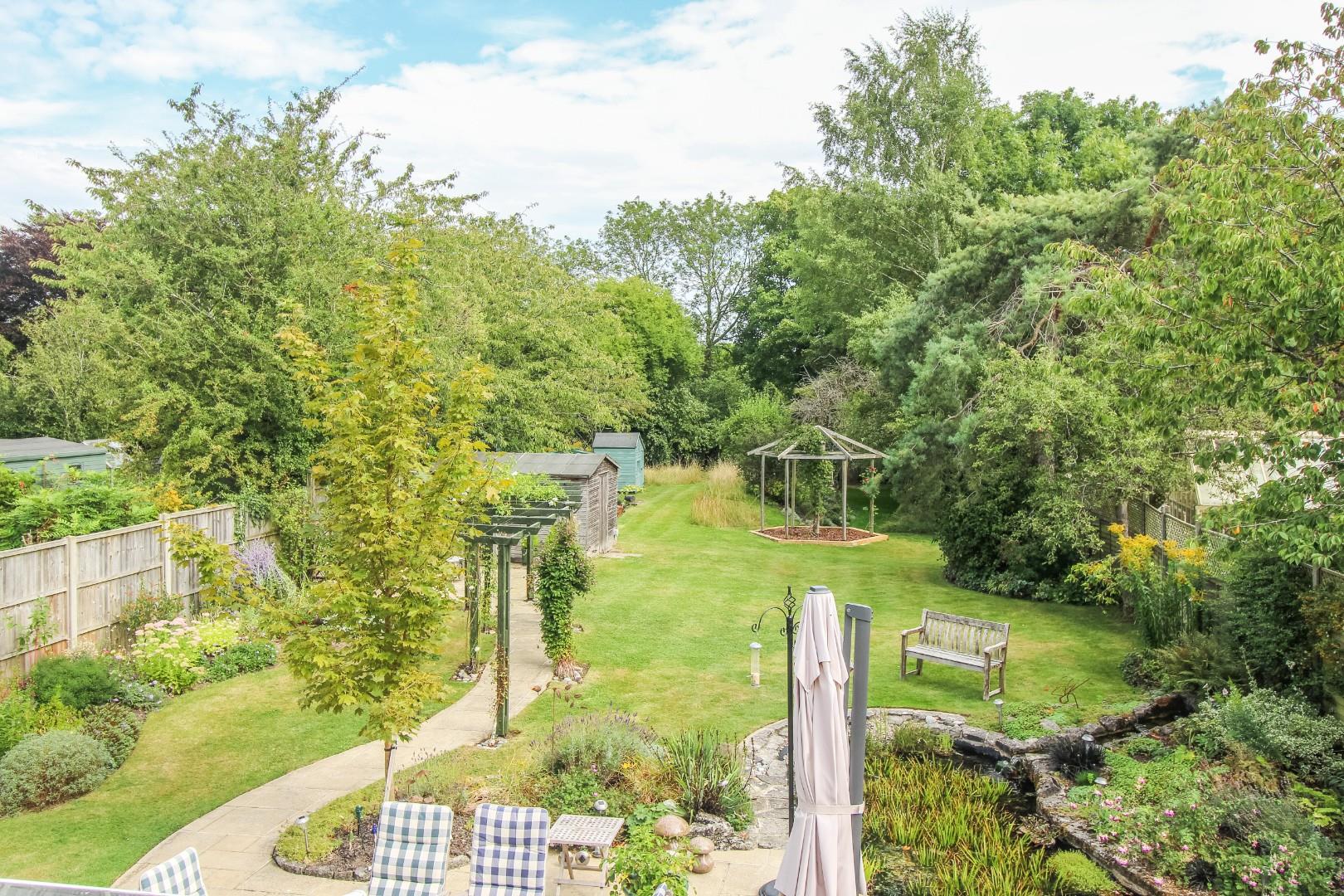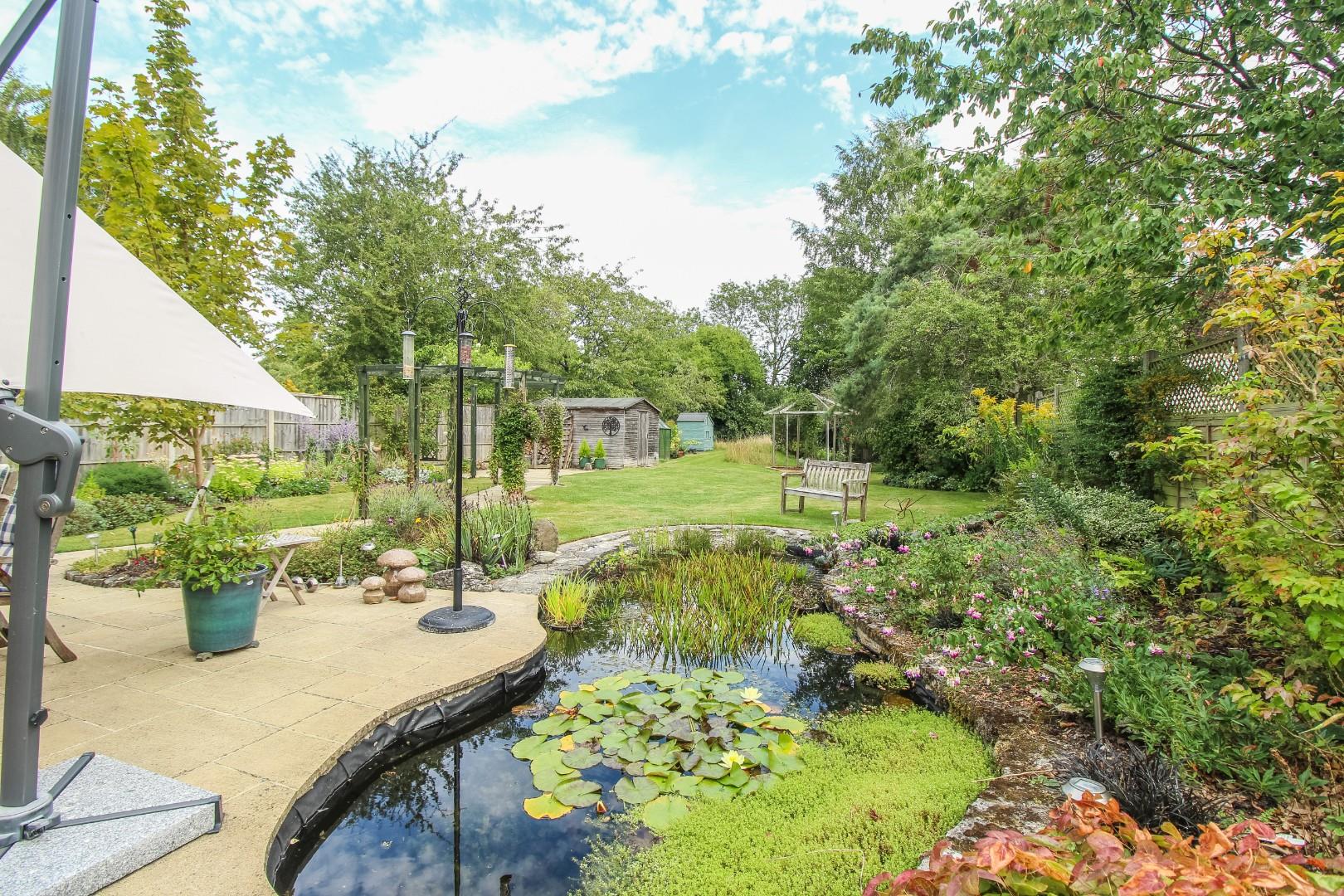 Outside, the property is set back and screened from the road with a generous block-paved and shingled driveway accommodating several vehicles and leading to the garage with an electric roller door, power and light connected. From the garage, there is a door into the office/playroom. Gated access leads to a covered side walkway to the rear garden, which is mainly laid to manicured and shaped lawns with a generous paved patio terrace, ideal for alfresco dining, a large wildlife pond and a pathway with a pergola over leading to a further terrace. Beyond, is a further expanse of lawn incorporating a meadow with a selection of mature trees and bushes and a vegetable, herb and fruit garden with timber shed and greenhouse. Towards the end of the garden, a portion of the lawned area declines slightly as it was historically part of an ancient moat. At the end, the garden backs on to a spinney and fields beyond. The whole enjoys excellent levels of privacy and seclusion.
