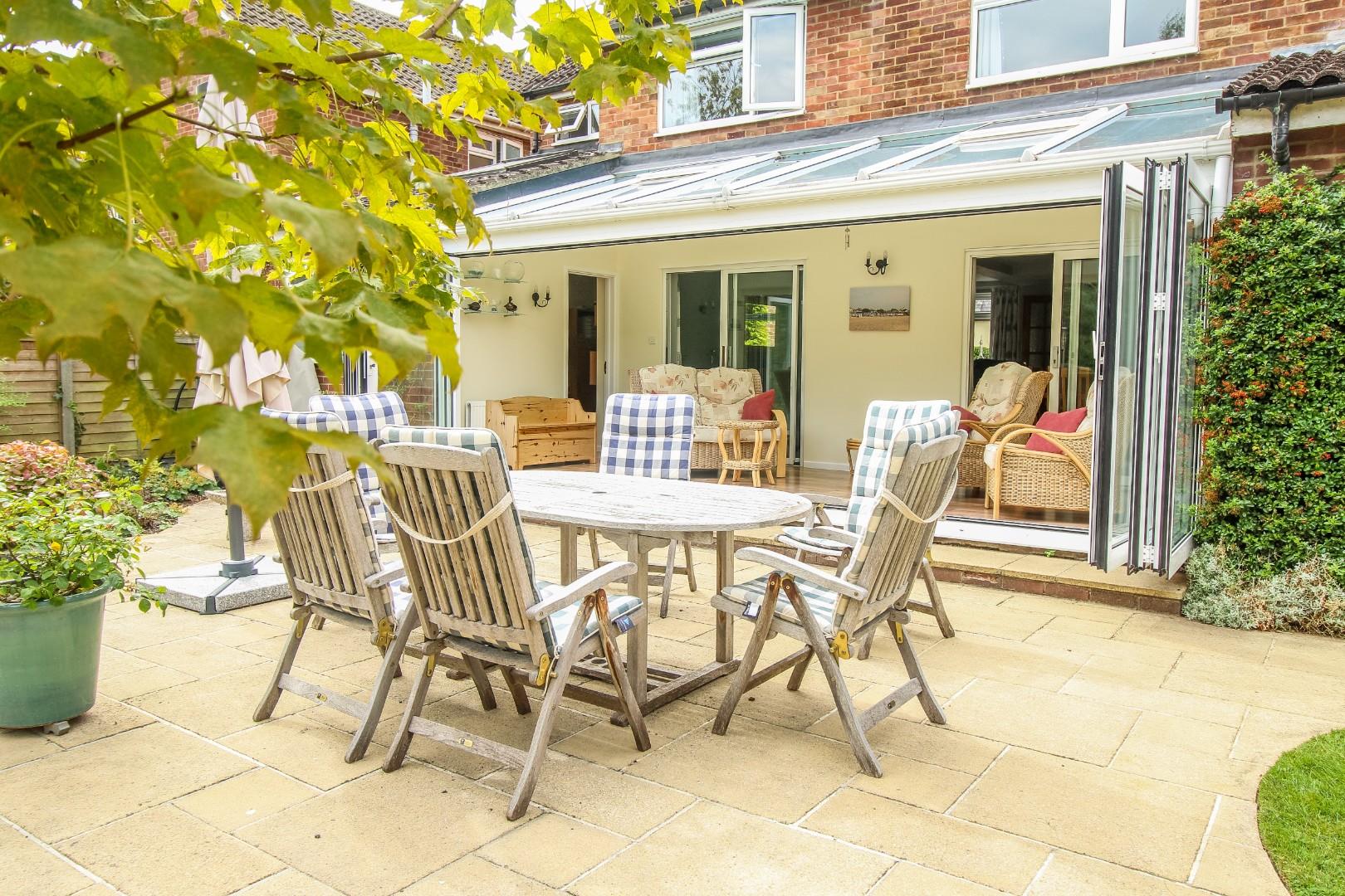 The accommodation comprises an entrance hall to a welcoming reception hall with stairs to the first floor, Karndean flooring and a cloakroom w.c. just off. There is a generous sitting room with a woodburning stove, which opens to a dining area. Both rooms have French doors out to the wonderful garden room extension, with a glazed rear elevation, which bifolds fully, incorporating the garden beyond. There is a further large reception room plus an office / playroom with a vaulted ceiling incorporating Velux rooflights. The kitchen / breakfast room is fitted with attractive cabinetry, ample fitted working surfaces with an inset one and a half sink unit with mixer tap and drainer a range of integral appliances including a four-ring halogen hob, double oven, extractor, dishwasher and space for an American-style fridge-freezer. The kitchen incorporates a utility corner with a fitted worksurface and below there is space for a washing machine and tumble dryer plus a door out to a covered side walkway area.