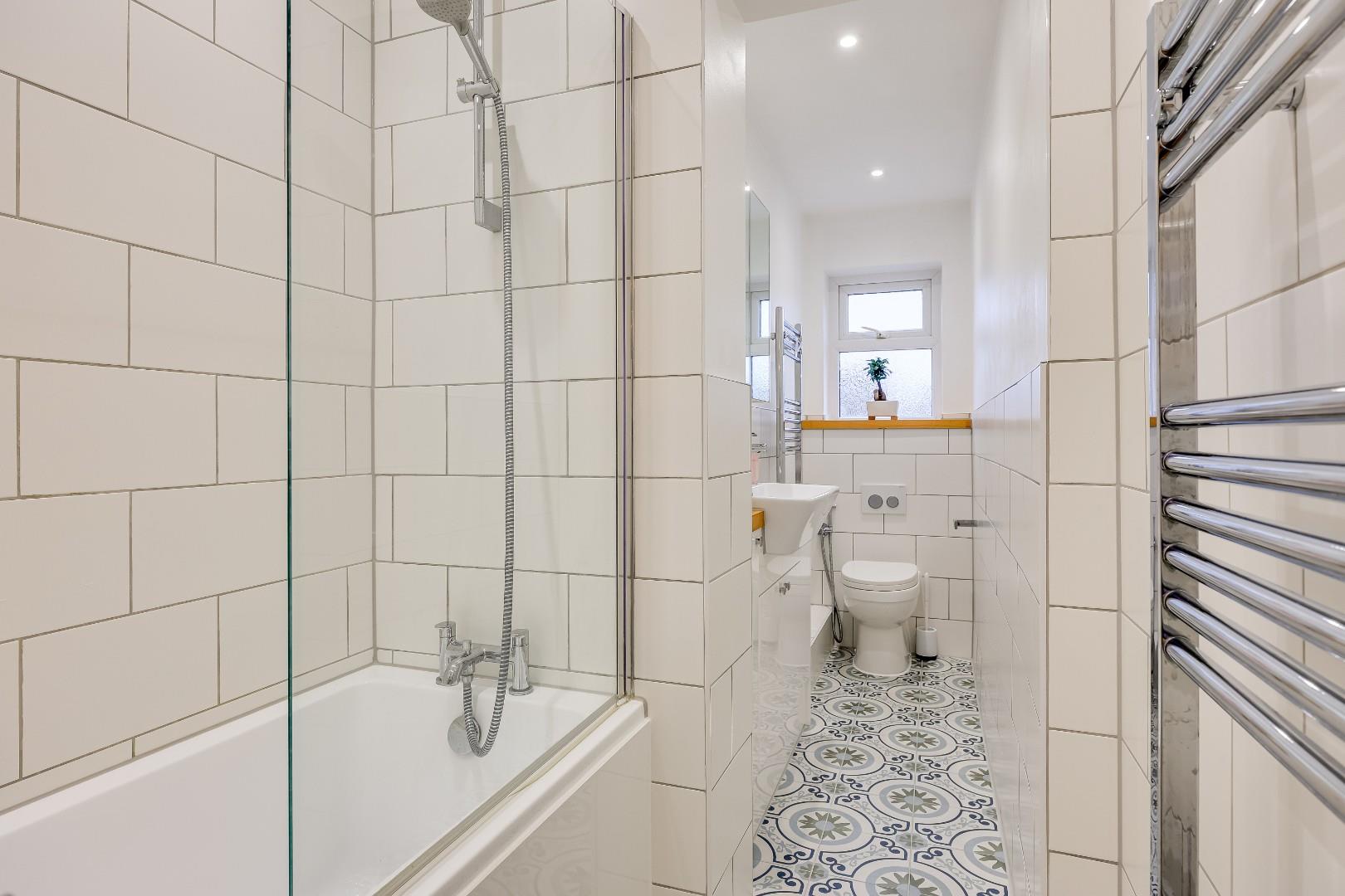 On the first floor there are three good-sized bedrooms, two of which are double bedrooms and bedroom two benefits from built-in storage. The family bathroom is fitted with a three-piece white suite, bath with an overhead shower.