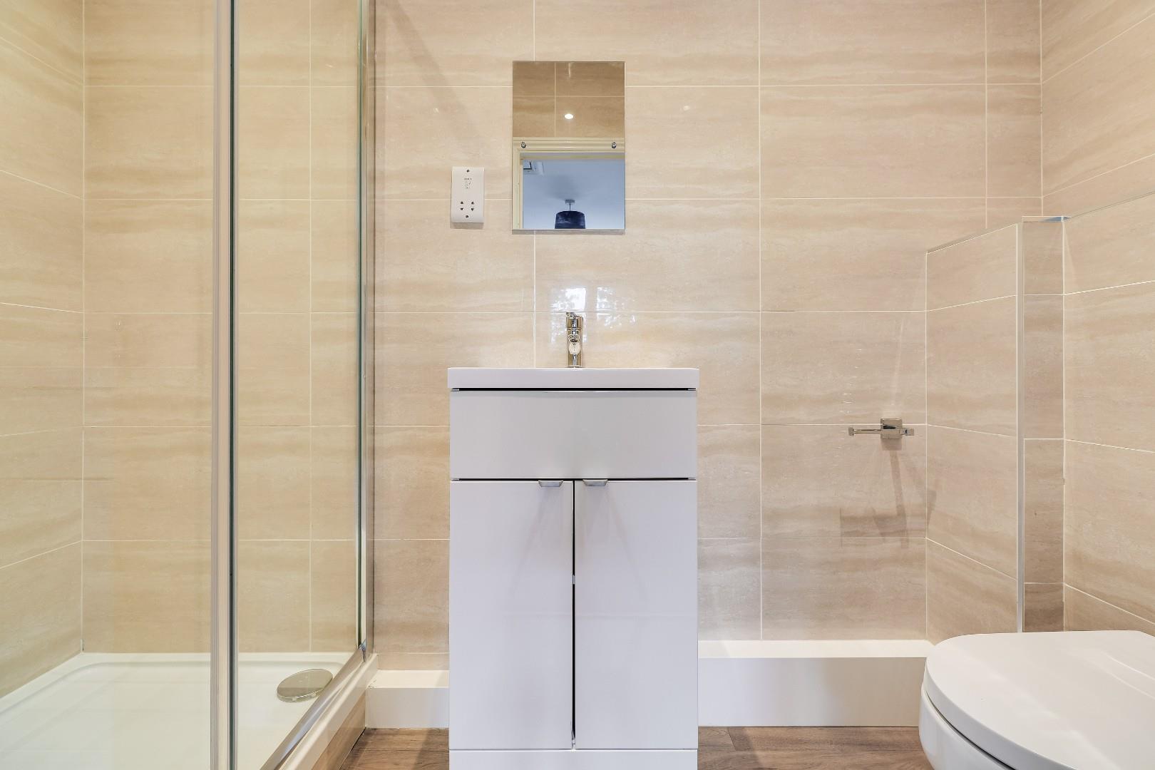Upstairs, there are three bedrooms, including a main bedroom with a recently replaced en-suite shower room. The en-suite is fully tiled and features an enclosed shower, WC and a wall-mounted sink with vanity unit below. The family bathroom serves the remaining bedrooms and includes a panelled bath with shower over, WC and wall-mounted sink with vanity unit.