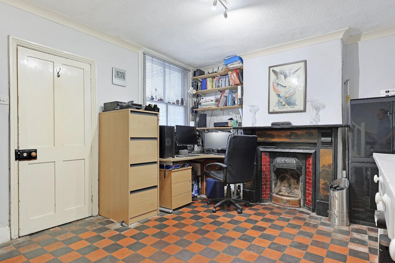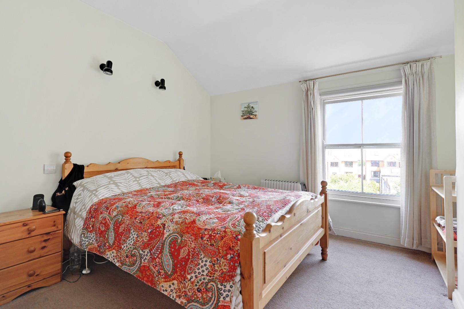 On the first floor, there is an impressive living room/bedroom with three large windows to the front aspect, exposed wooden floorboards and a charming period fireplace. There is a further double bedroom with a fitted wardrobe and a family bathroom with a freestanding bath, wash basin, WC and Velux window.
