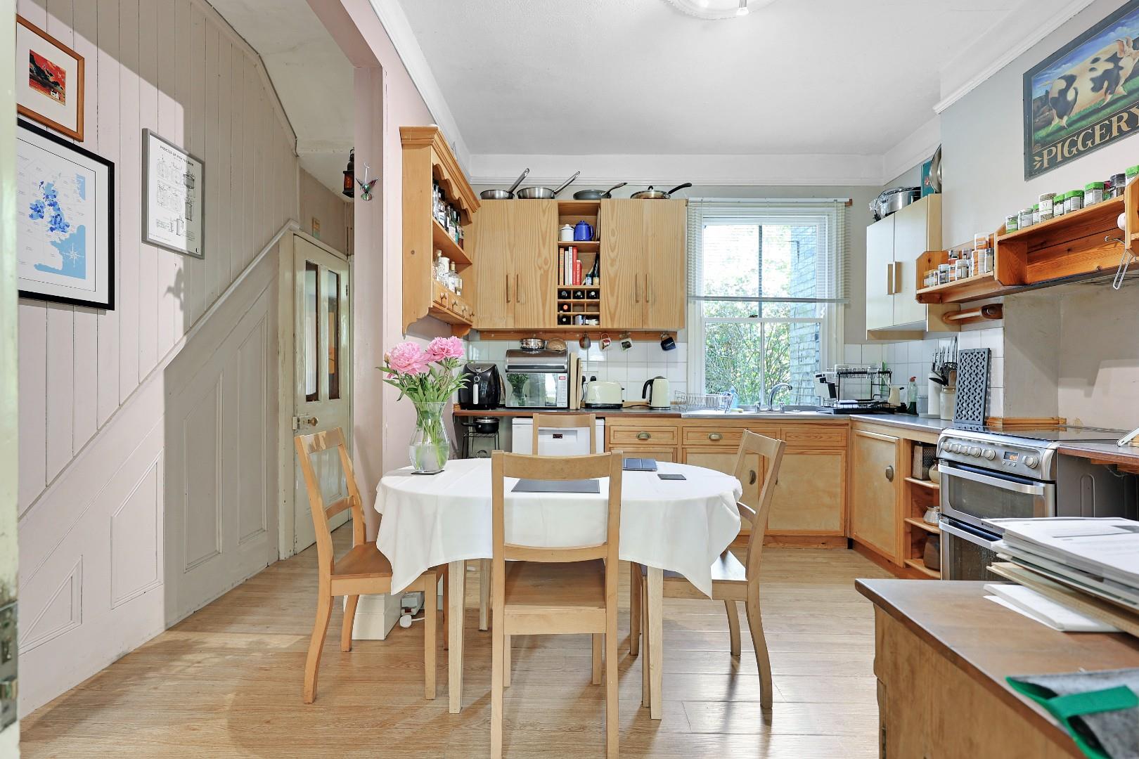 A sheltered entrance porch with attractive mosaic floor tiles leads to the entrance hall, which is accessed via a stained-glass effect door and has stairs to the first floor. The kitchen/breakfast room has a range of fitted units and space for fridge/freezer, oven, dishwasher and a free-standing gas cooker with a vent to a chimney. A single door with stained glass opens into the front sitting room, which features a working fireplace and a bay window. At the rear of the property, there is a dining room, which also has a bay window, with this one including French doors and steps down to the garden.