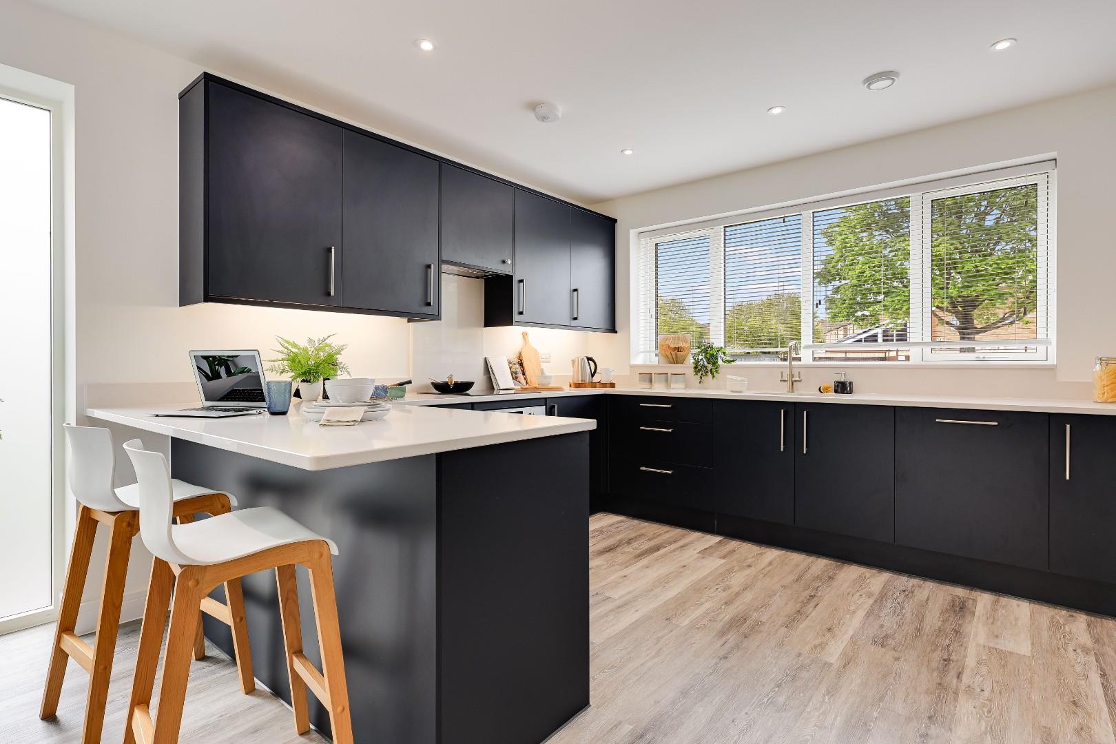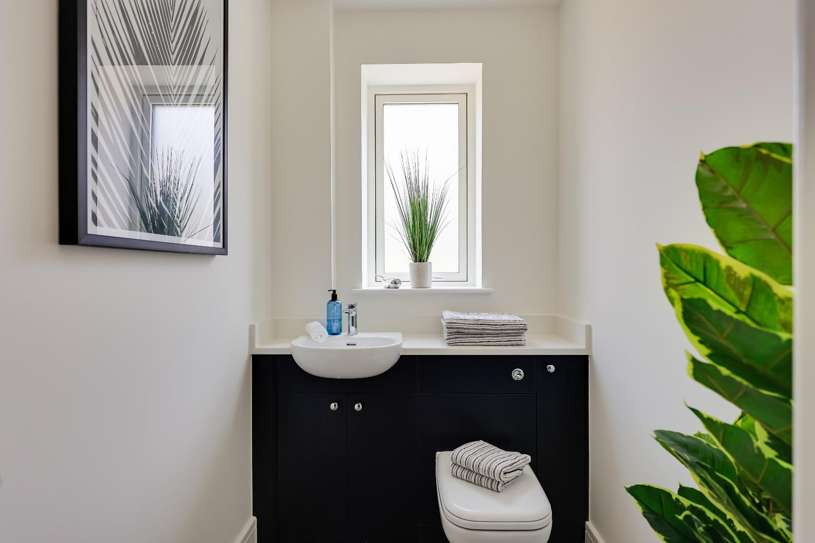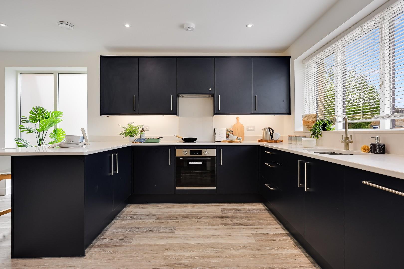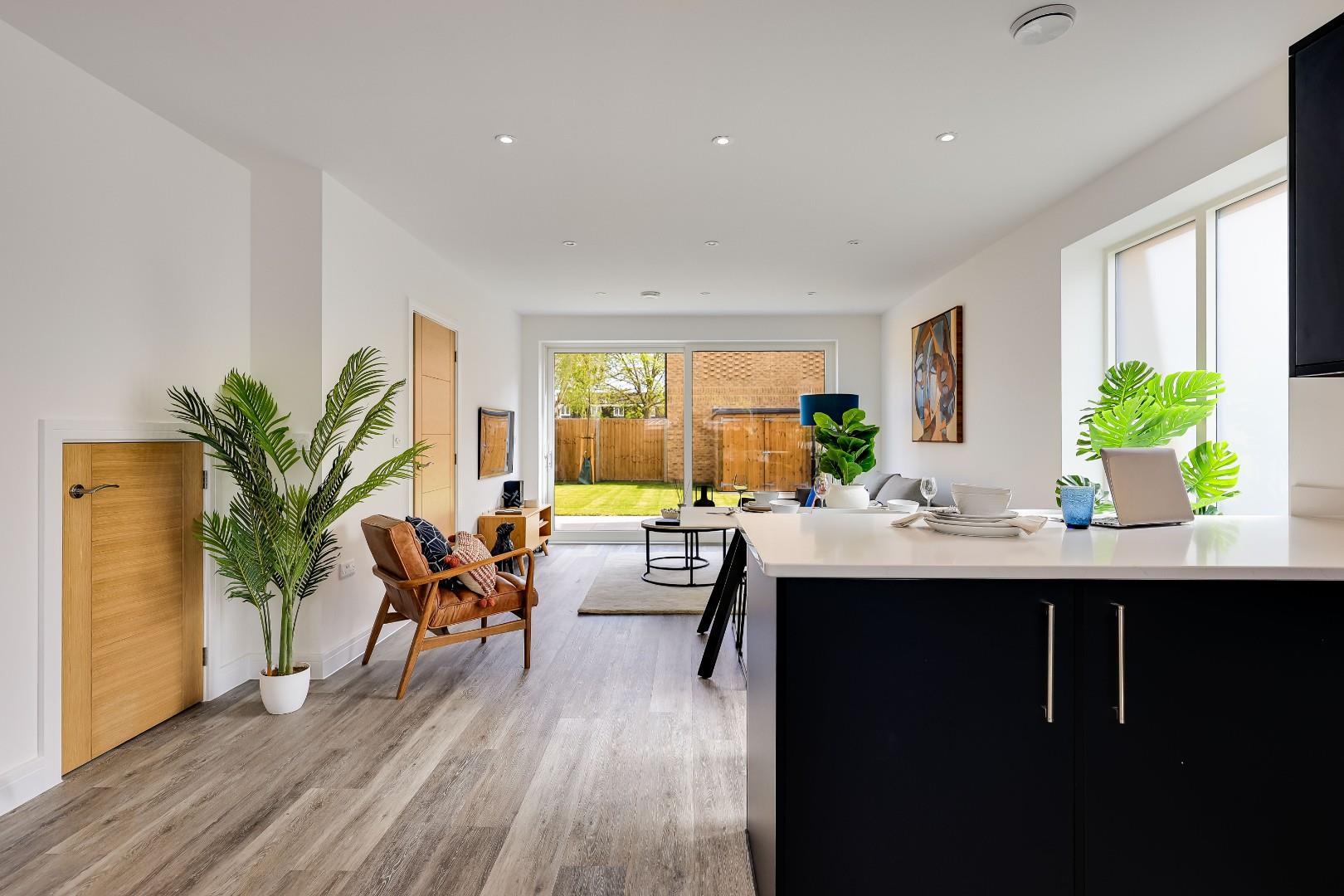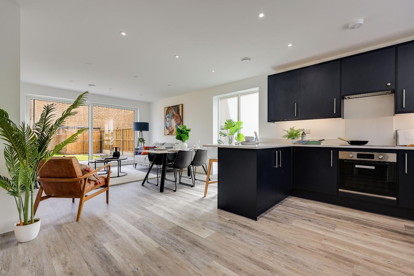 The ground floor features a welcoming entrance hall leading into spacious open-plan kitchen, dining and living area. The contemporary kitchen is designed in a sleek U-shaped layout with peninsula ideal for informal dining, with Quartz worktops, 1.5 bowl sink with mixer tap, a range of base and eye level cabinetry, integrated appliances to include oven, induction hob with overhead extractor, dishwasher, fridge and freezer. The kitchen is complemented with a useful utility room off the living space, which is a continuation of the same finishes, with space for a washer-dryer and leading to a separate downstairs WC.