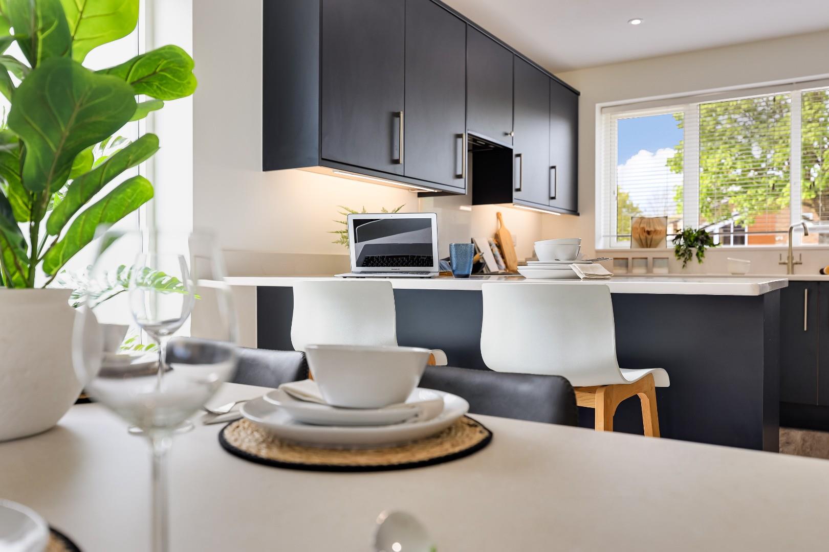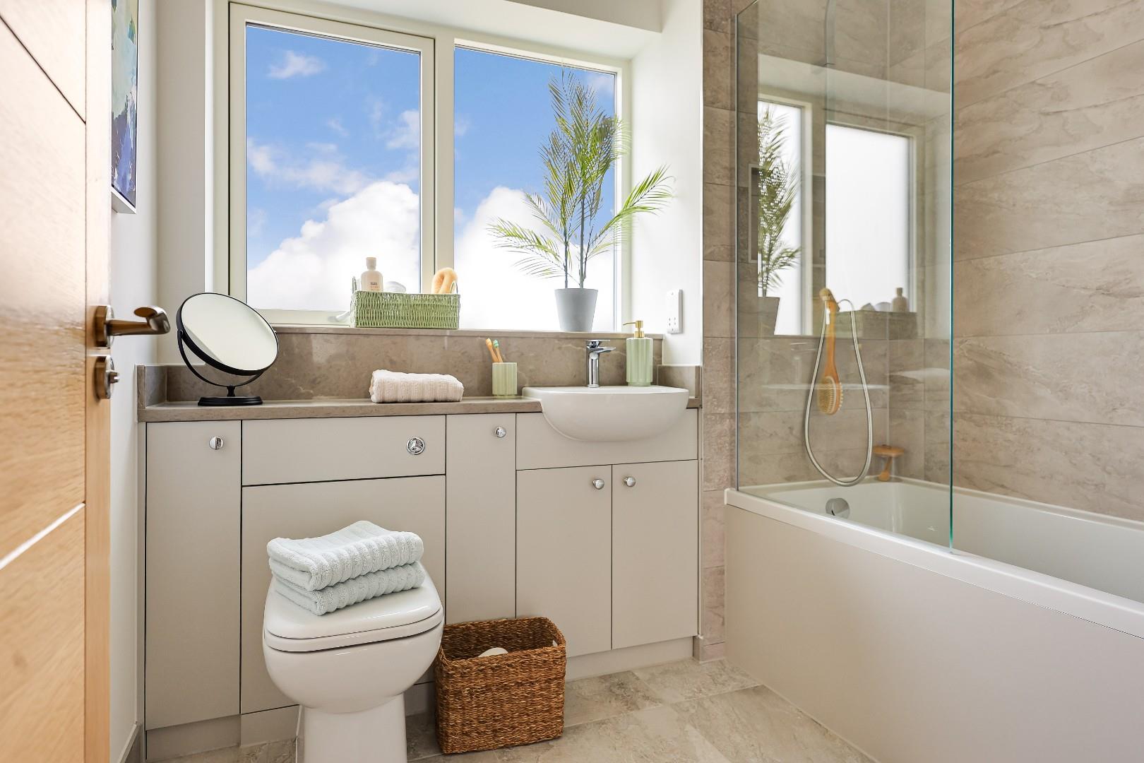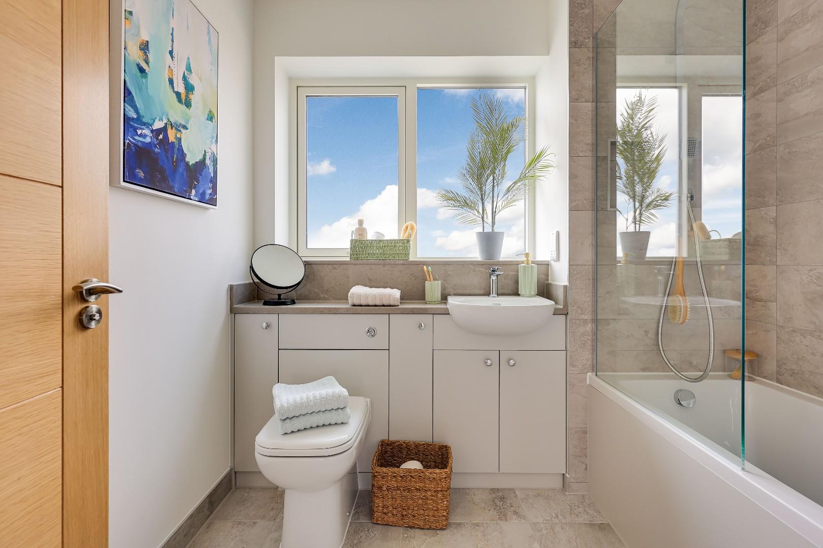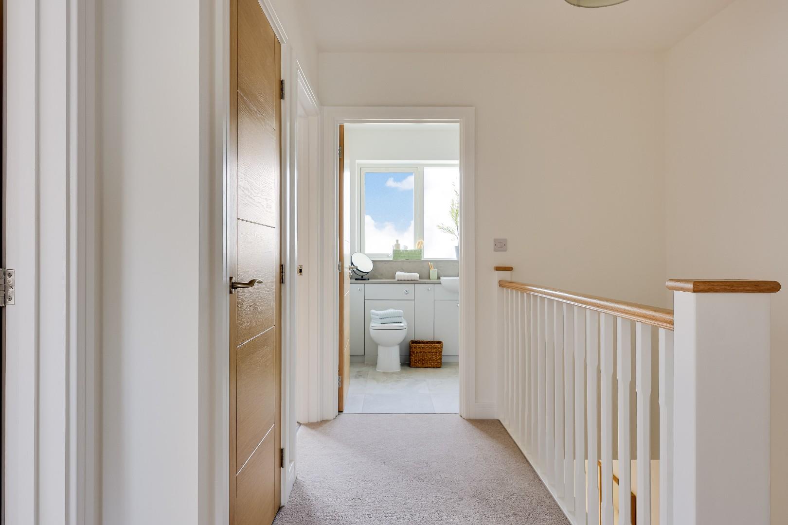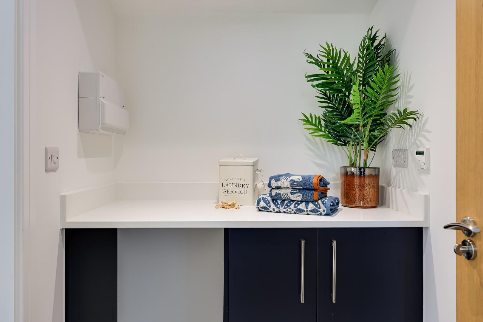 The ground floor features a welcoming entrance hall leading into spacious open-plan kitchen, dining and living area. The contemporary kitchen is designed in a sleek U-shaped layout with peninsula ideal for informal dining, with Quartz worktops, 1.5 bowl sink with mixer tap, a range of base and eye level cabinetry, integrated appliances to include oven, induction hob with overhead extractor, dishwasher, fridge and freezer. The kitchen is complemented with a useful utility room off the living space, which is a continuation of the same finishes, with space for a washer-dryer and leading to a separate downstairs WC.