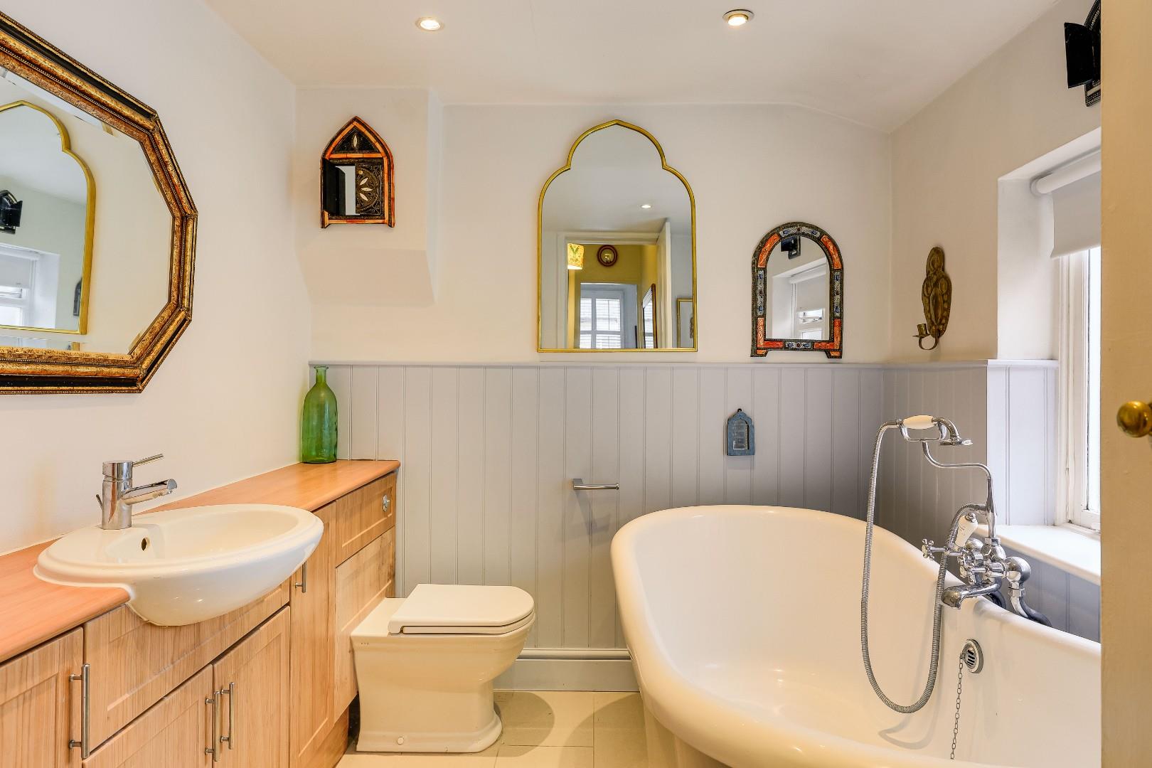 Upstairs, the first-floor landing leads to two spacious double bedrooms and a fully fitted bathroom suite with a rolltop bath and attractive panelling.