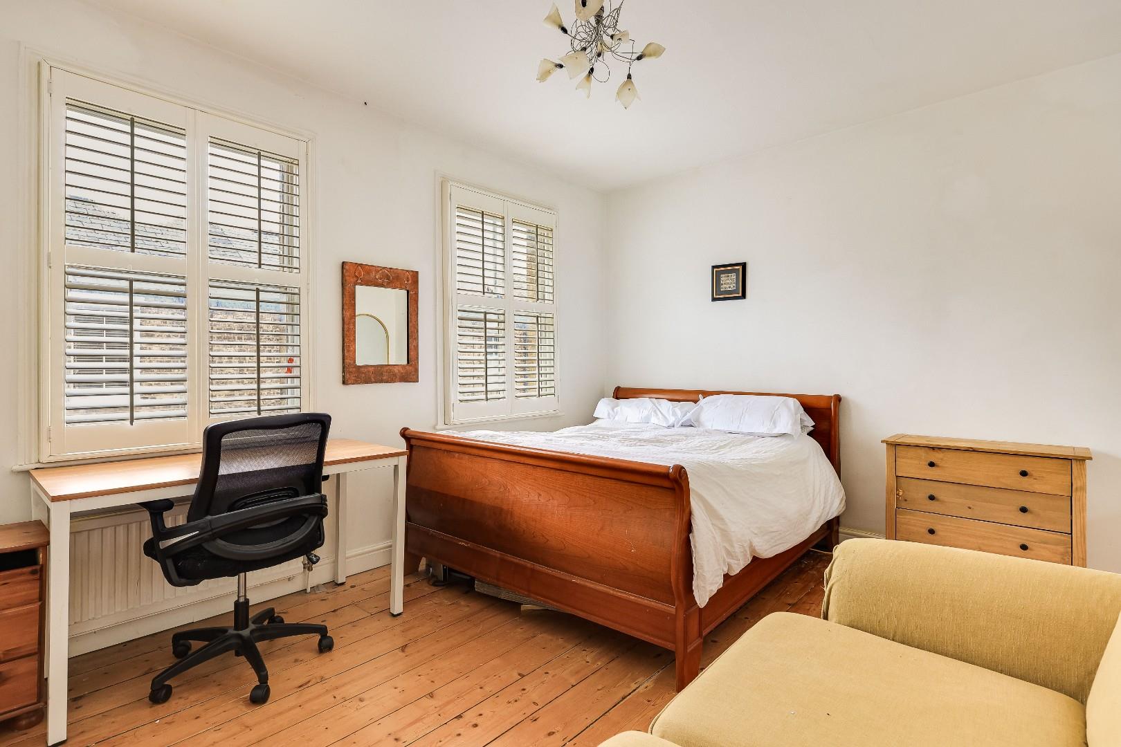 The accommodation comprises a small, enclosed entrance lobby, a well-proportioned and broad sitting/dining room with a woodburning stove and an open fireplace, an open staircase with understairs storage solutions, original wood flooring, bespoke shuttering to the front sash window and rear French doors. There is access to the garden from this room. A well-equipped kitchen is off the dining area and provides a range of units and drawers, working surfaces, integrated appliances including a fridge (new) and a second fridge freezer, and space for freestanding appliances.