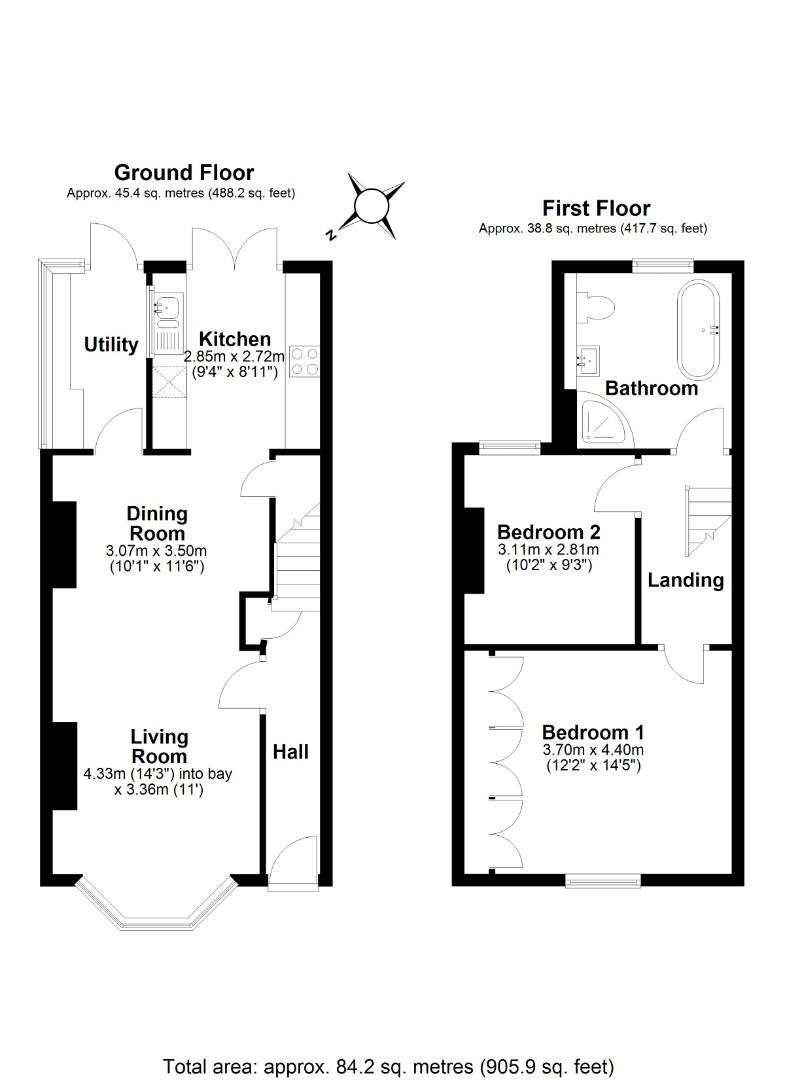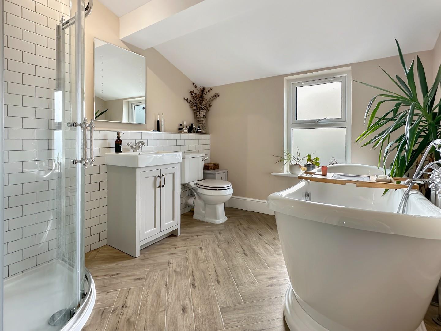 Upstairs, the first-floor landing leads to a large, luxurious bathroom suite with a roll-top bathtub and a separate shower cubicle, and two double bedrooms, the principal bedroom benefitting from built in wardrobes.