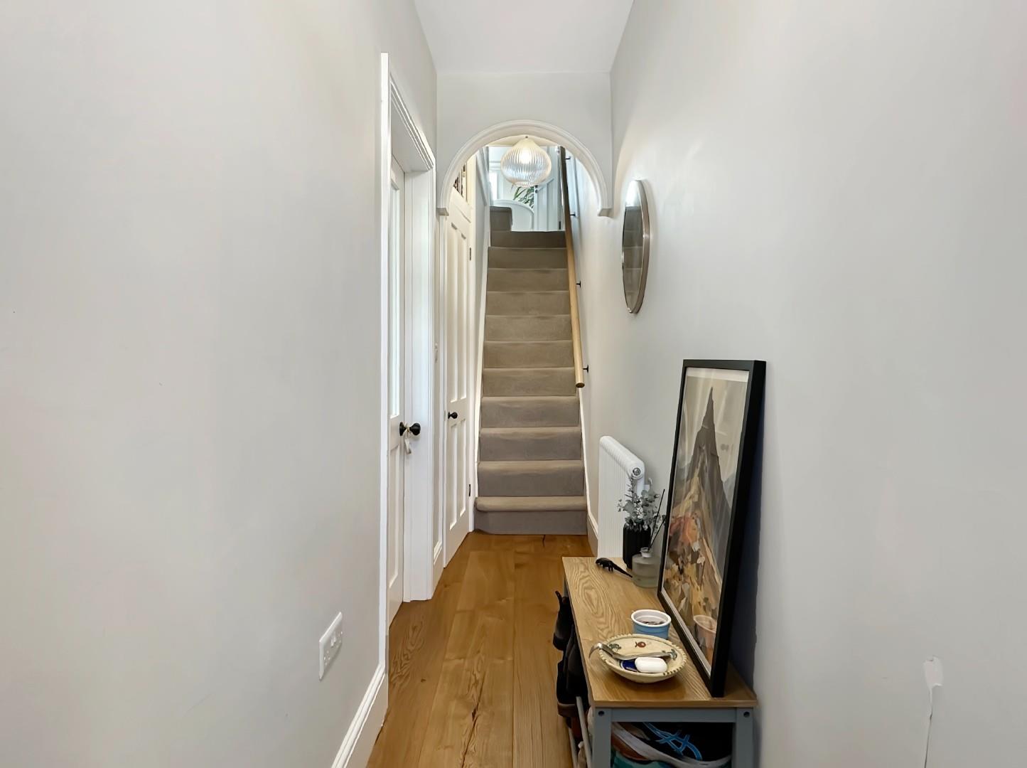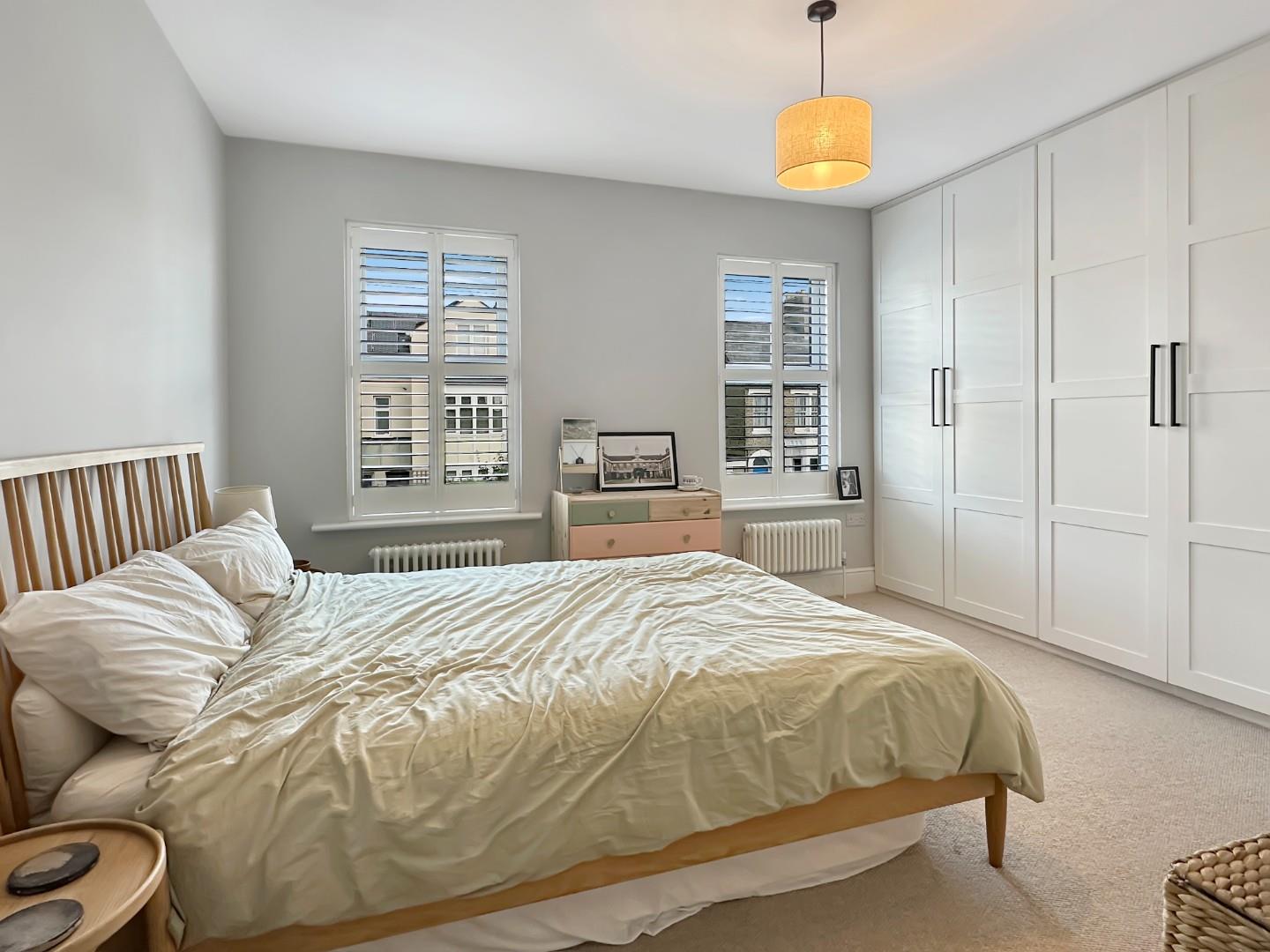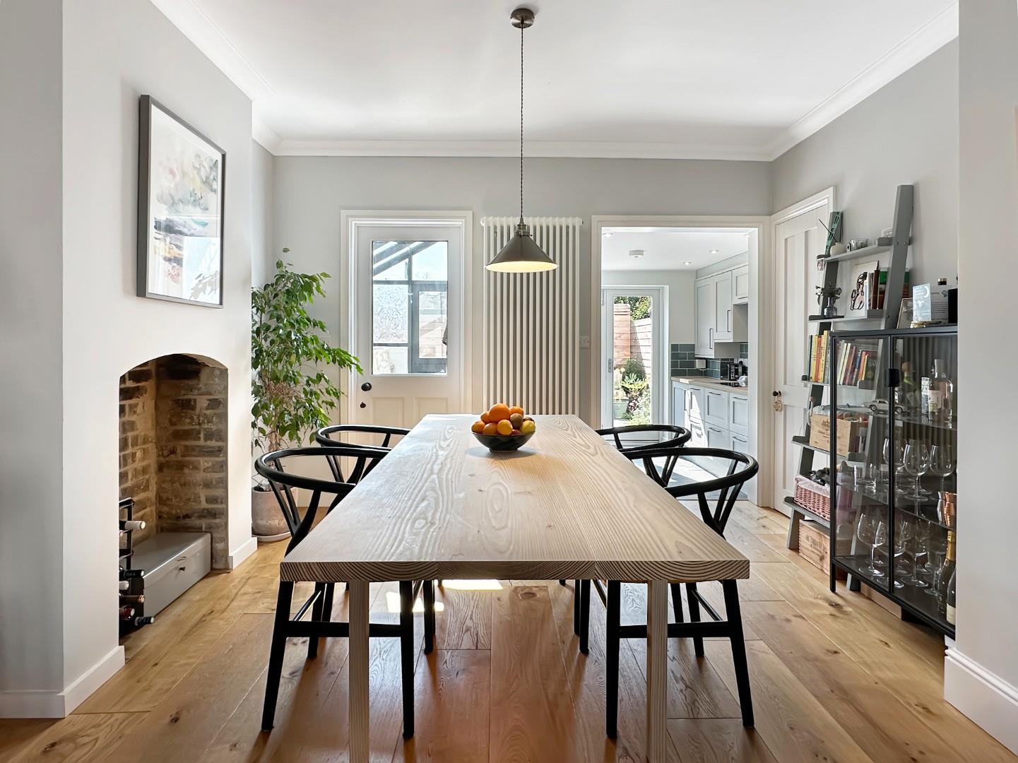 A bright, airy and elegant reception room provides a comfortable sitting area, which has a large bay-window with made-to-measure shutters, a plastered chimney breast with exposed brick fireplace, bespoke recess cabinetry and coving. The dining area is equally impressive and connects to a useful utility/storage room with access to the garden and an impressive and well-equipped kitchen with ample storage units and drawers, worksurfaces with tiled splashback and a range of integrated appliances. There is access to the garden from the kitchen and an understairs storage cupboard in the dining area.