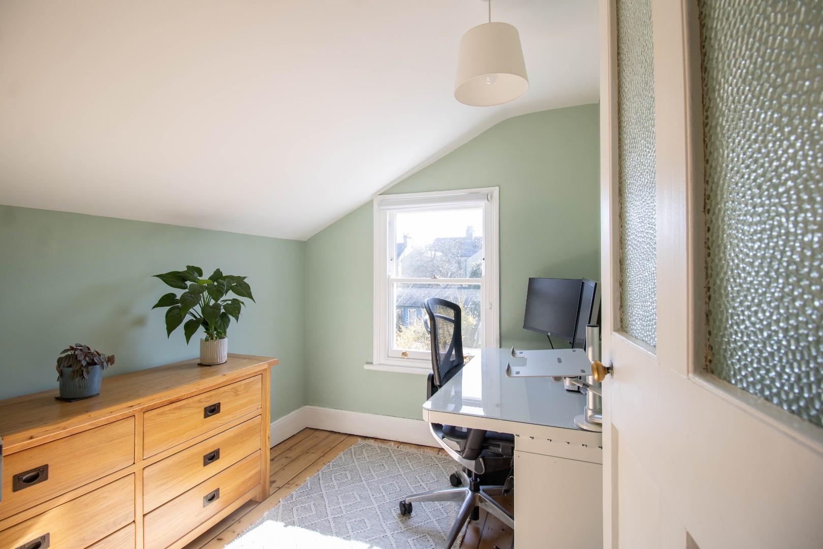 Upstairs are three bedrooms, all with original wood flooring and two with feature fireplaces. The principal bedroom is particularly spacious and faces north-west over the front of the property. The landing provides access to a useful loft, which is boarded and insulated.