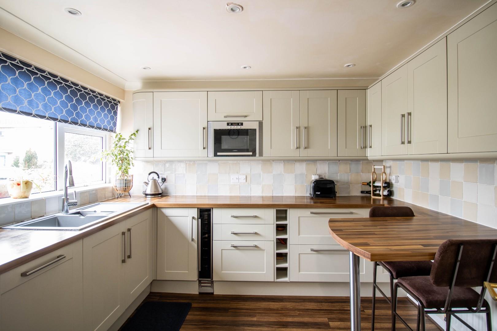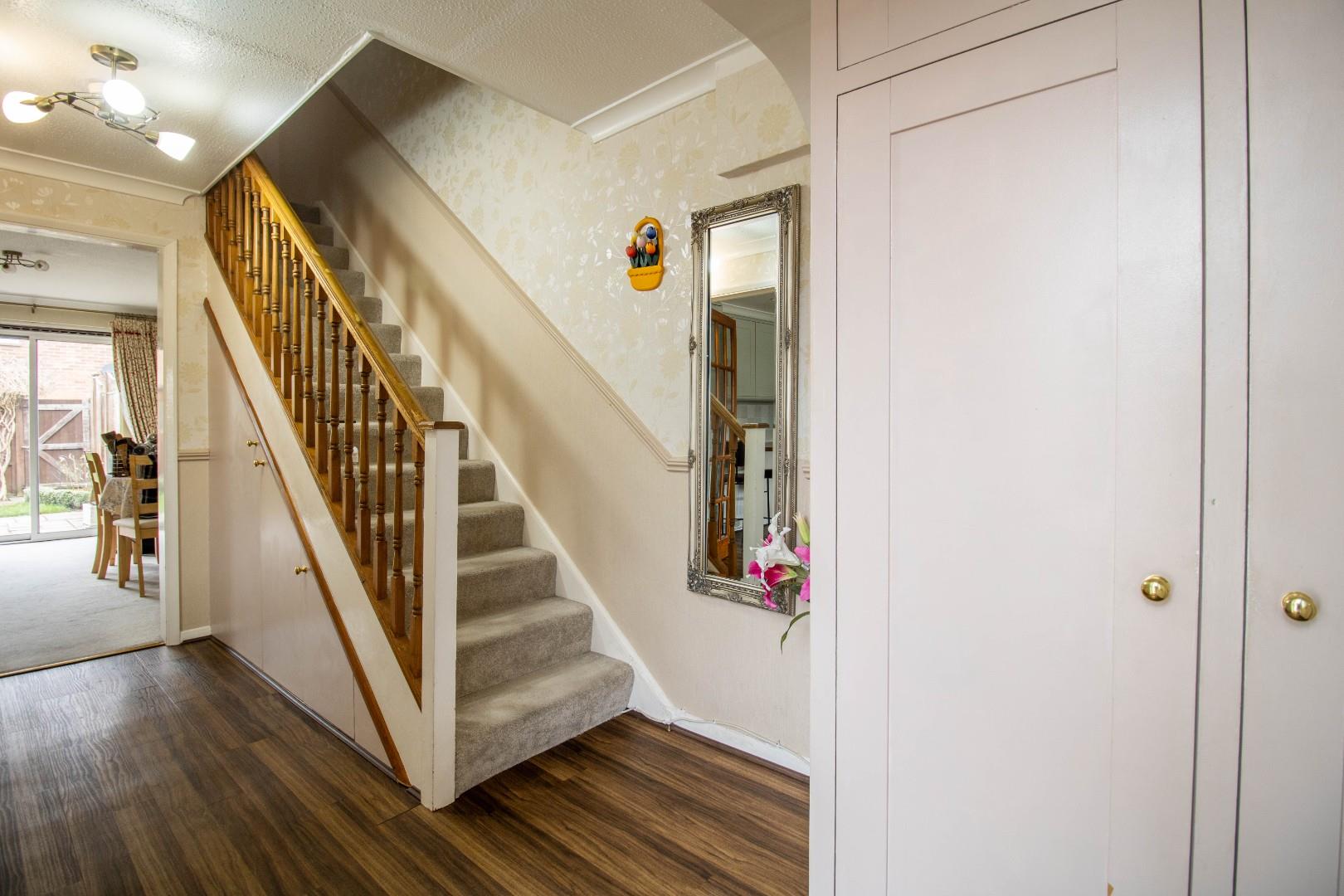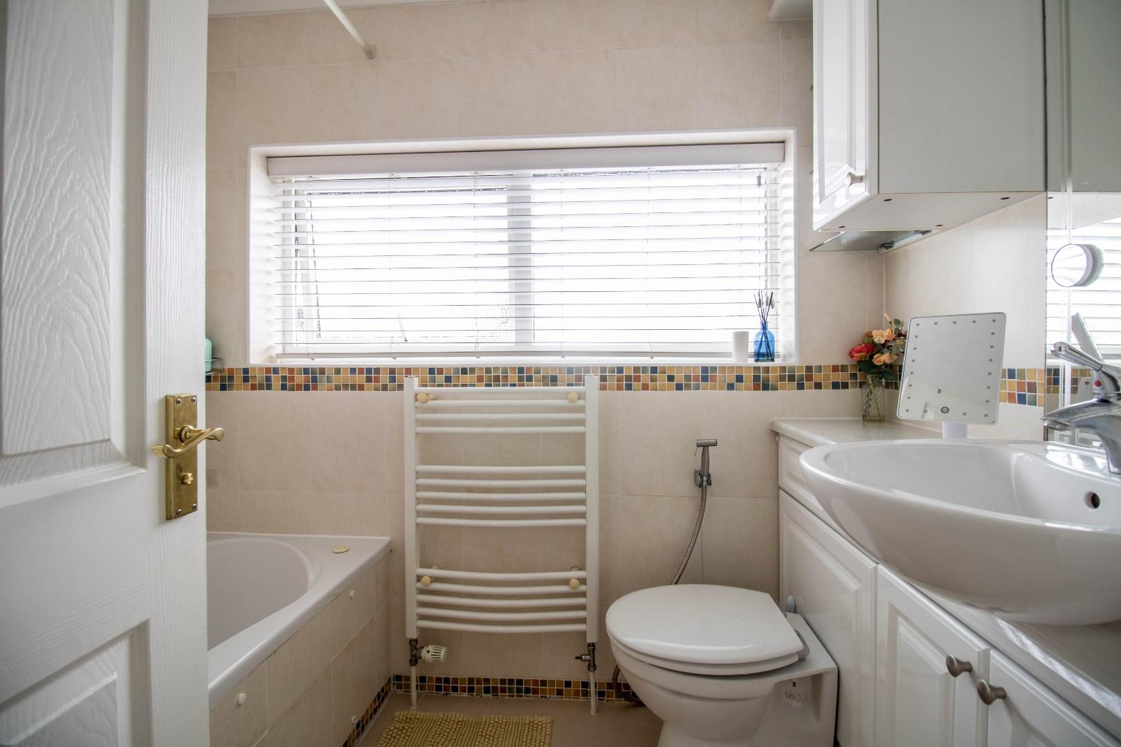 Upstairs are three good-sized bedrooms, two of which are fitted with built-in Hammonds wardrobes, installed around five years ago. The bathroom has a modern white suite including a shower over the bath, complemented by vanity furniture and a heated towel rail. The landing provides access to the boarded loft, which has lighting and a pull-down ladder.