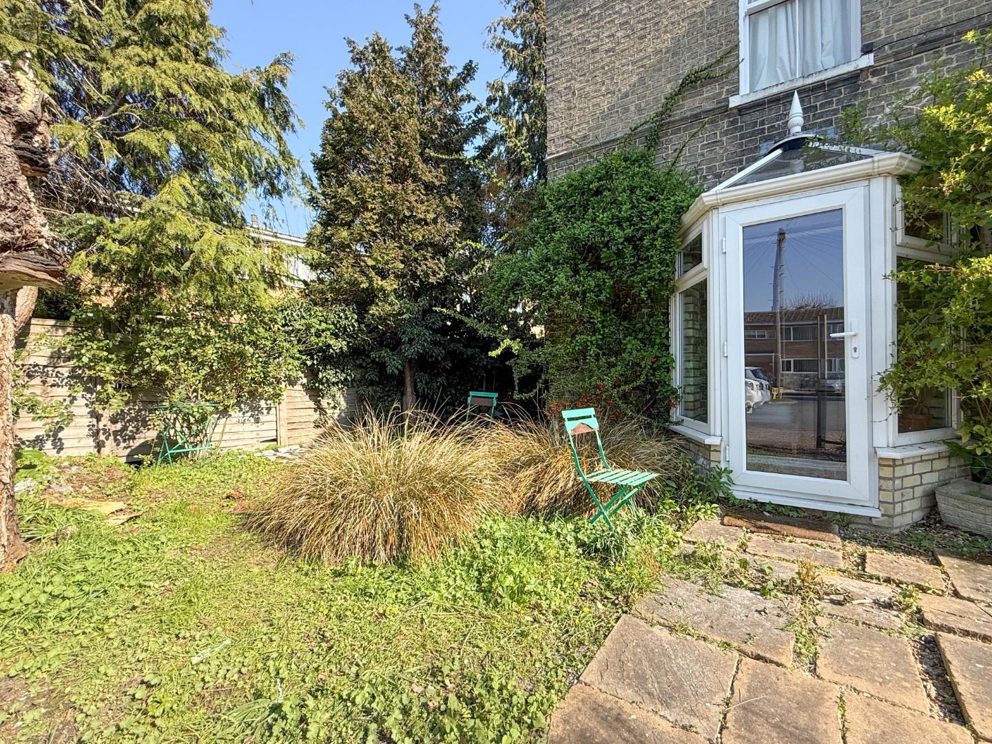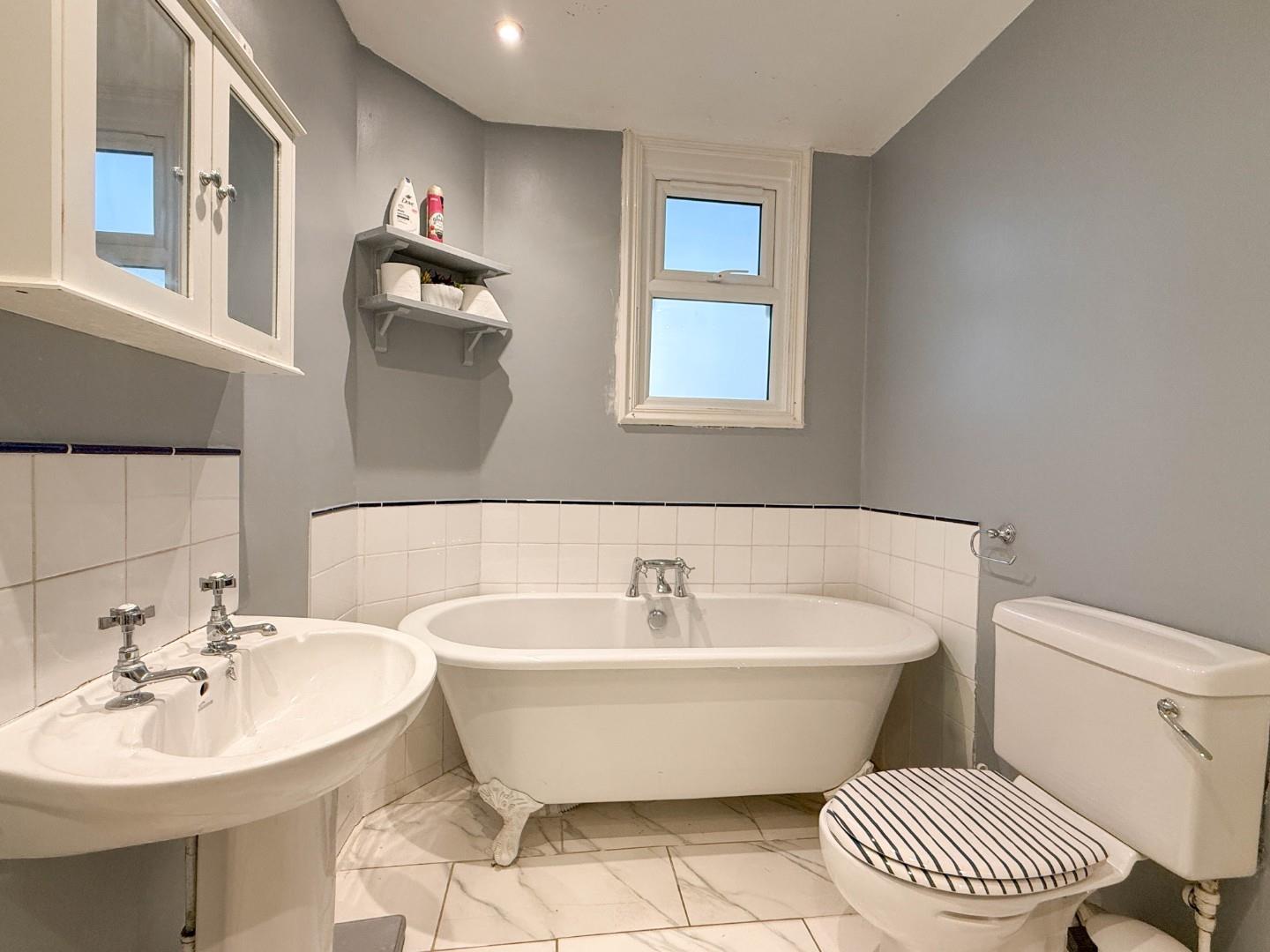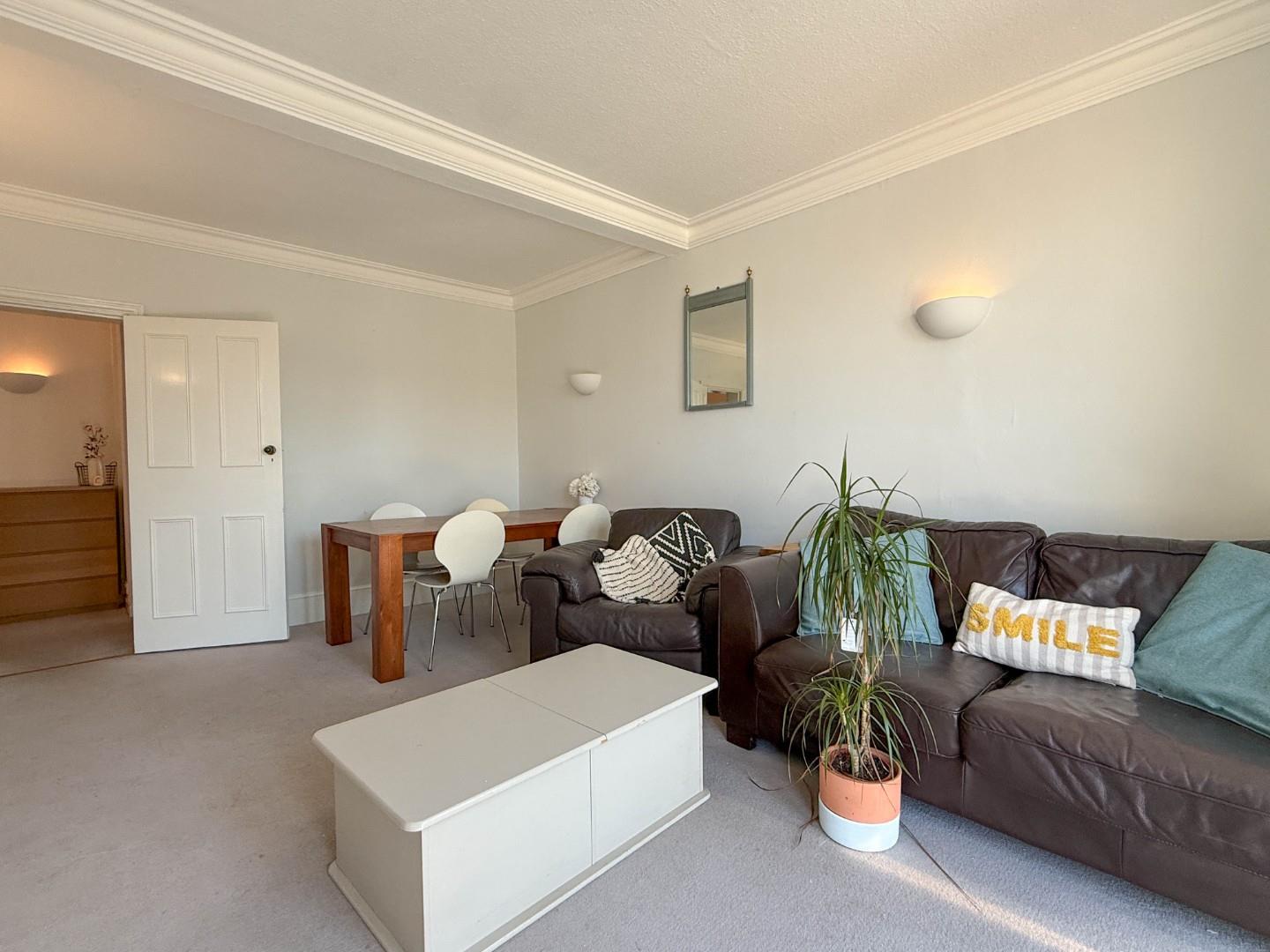 The property briefly comprises a spacious entrance hall with a storage cupboard for coats and shoes, an open-plan living/dining room enjoying a floor to ceiling bay window overlooking the communal gardens and separate kitchen fitted with a range of floor and eye-level cabinetry, a sink with a mixer tap and space for several freestanding appliances. To complete the accommodation there are two generous double bedrooms, with the larger of the two befitting from a second floor to ceiling window and access to the communal gardens through a glass porch. The family bathroom is equipped with a toilet, basin, shower and a roll top bath.