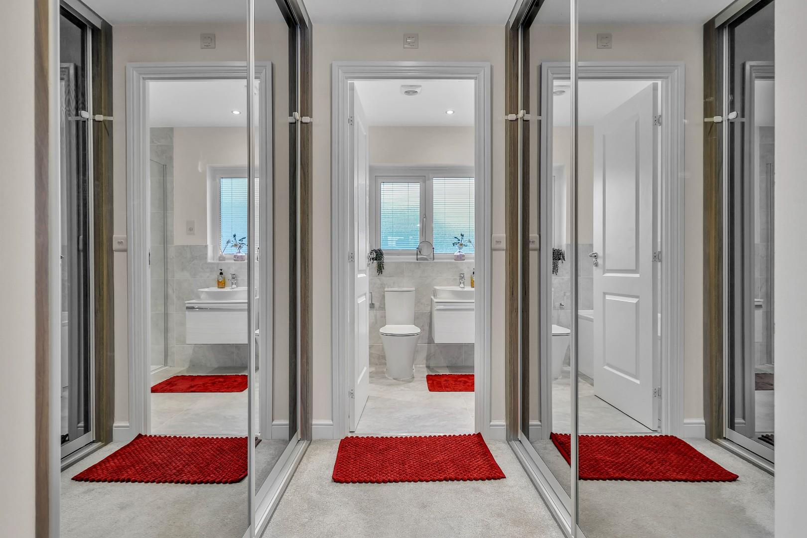 To the first floor are three double bedrooms with each bedroom benefitting from an en-suite. Bedroom one has a delightful bay window, a walk in dressing area and an ensuite bathroom with both a bath and a double enclosed shower. Bedrooms two and three each have fitted wardrobes and an en-suite shower rooms.