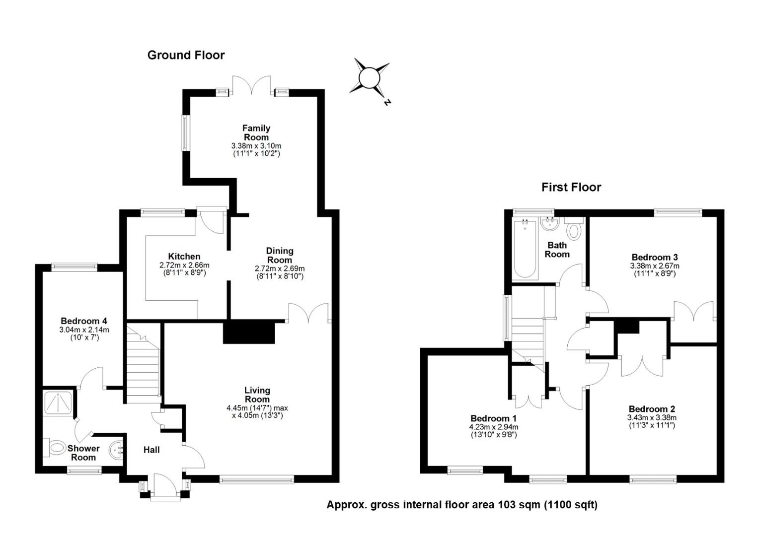 With the original part of the property being constructed in the 1970’s this family home measures 1100 Sqft/ 103 Sqm and provides generous living accommodation over two floors. The ground floor of the property comprises of three reception rooms which include a living room with an Ivett and Reed fireplace, a dining room off the kitchen and a family room with double doors opening onto the rear garden.