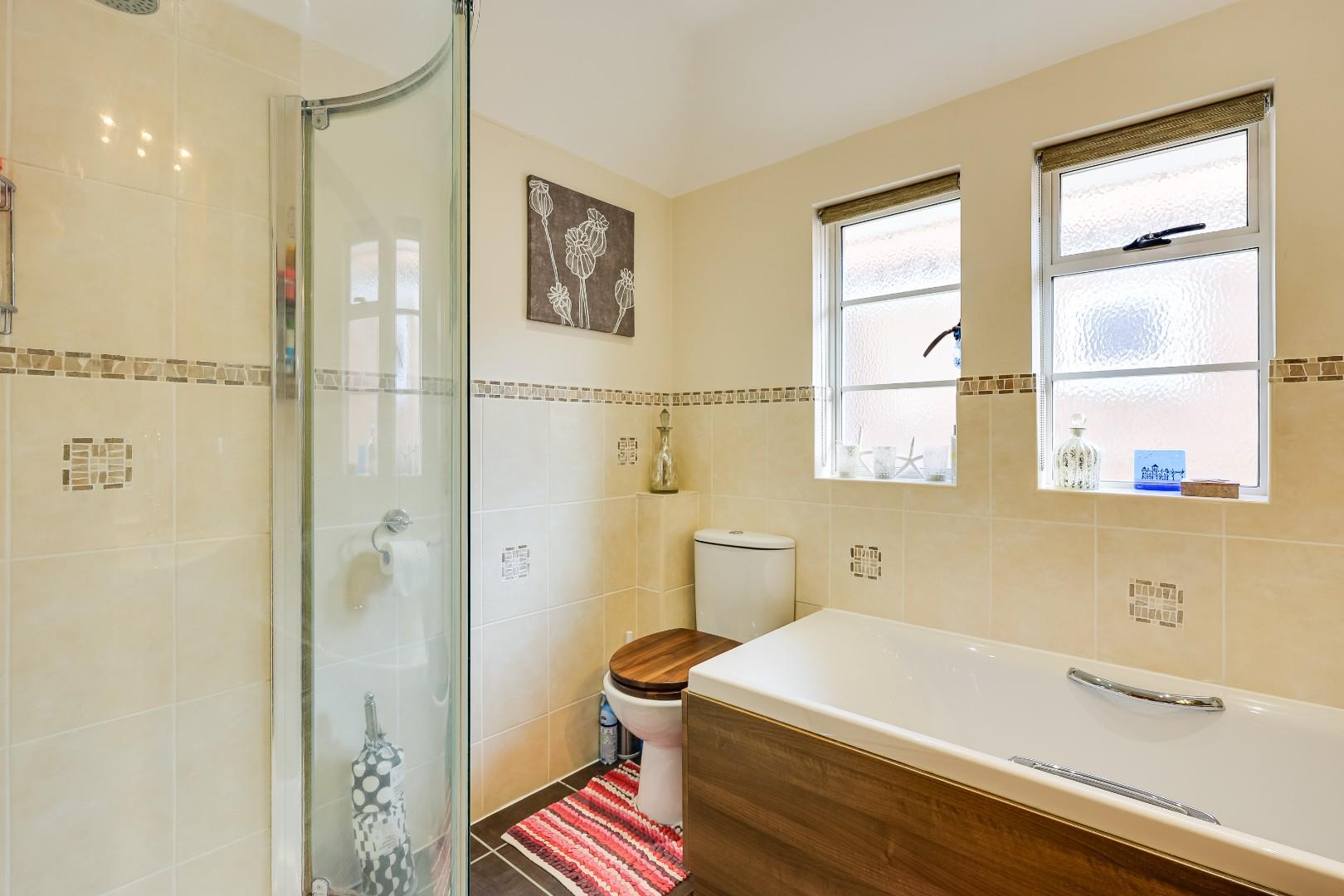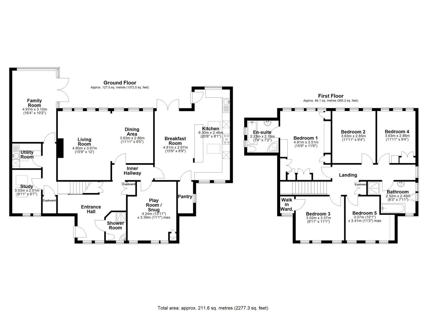 Upstairs, a long landing area provides useful built-in storage and leads to a family bathroom suite with a separate shower cubicle and five double bedrooms. The generous principal suite provides built-in wardrobes and a bathroom with a separate shower.