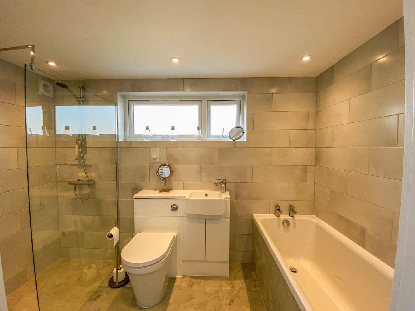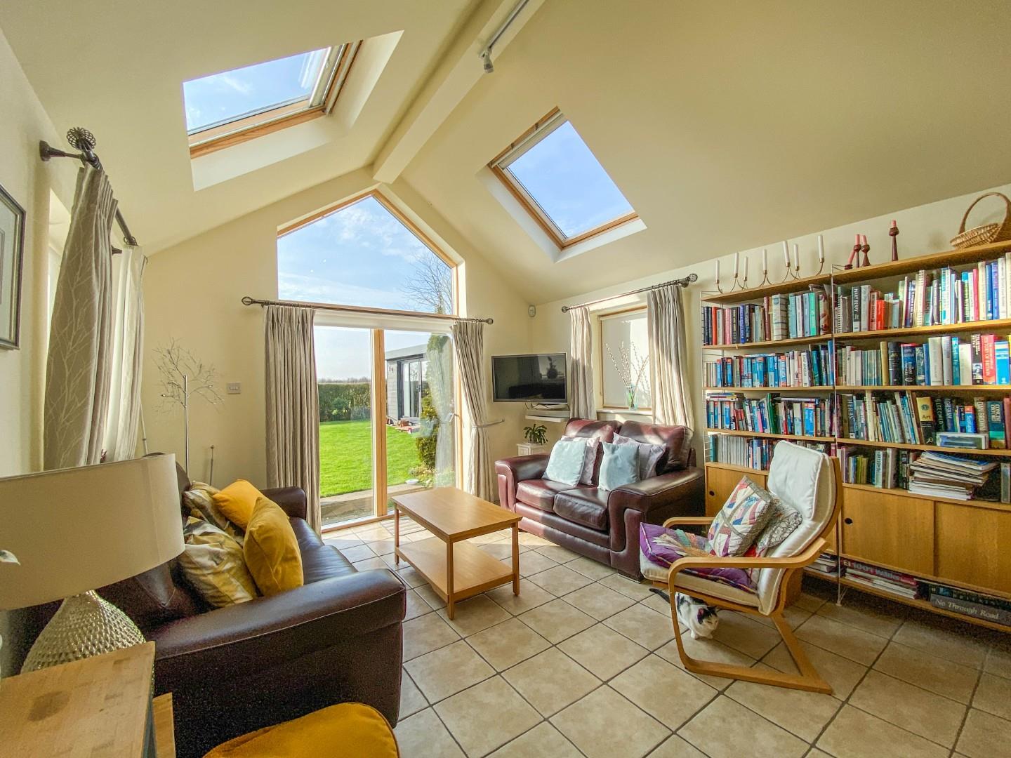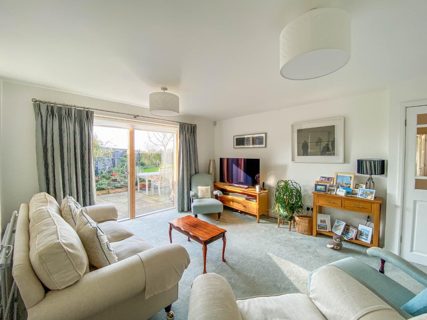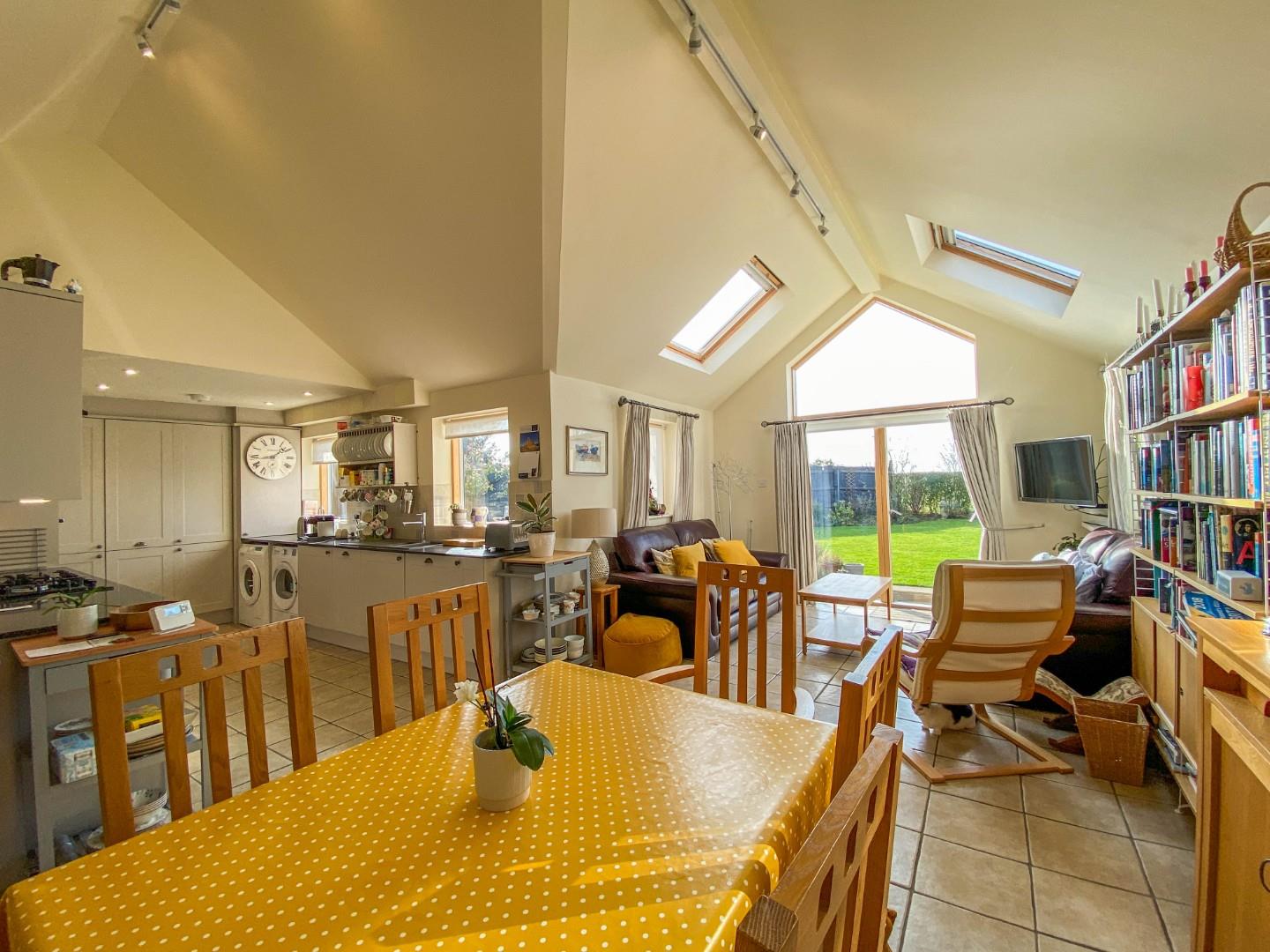 The accommodation comprises a generous welcoming reception hall with bespoke staircase to first floor accommodation and walk-in cupboard. The sitting room has patio doors to the garden and has also been utilised as a bedroom. There are two further ground floor bedrooms and a re-fitted luxury shower room with walk-in shower and travertine wall and floor tiles. Particularly impressive is the T-shaped open-planned living/kitchen/ dining room's striking vaulted ceiling with a superb degree of natural light. The kitchen has been finished beautifully with attractive cabinetry complemented by granite work surfaces. There are a number of integrated appliances which include a gas hob, oven, microwave, dishwasher, fridge/freezer. The living/dining room is generous in size with space being emphasized by the vaulted ceiling. There are patio doors that lead to the rear garden and attractive tile flooring with heating under.