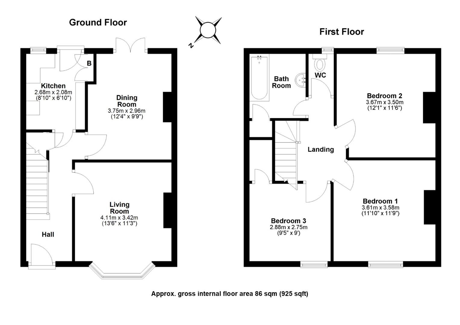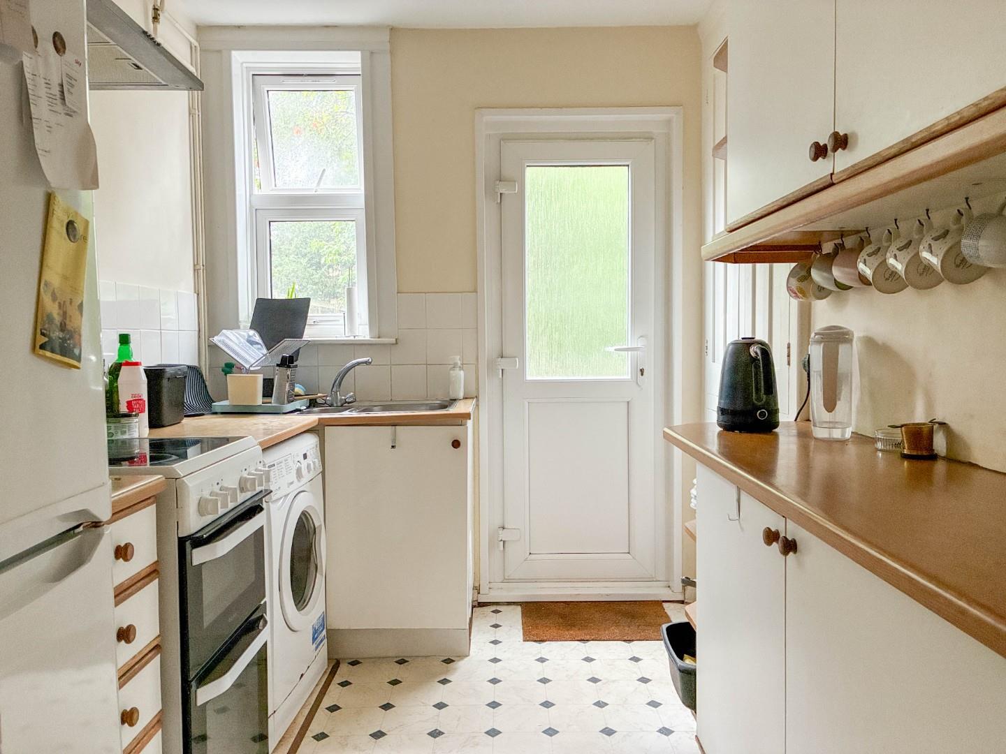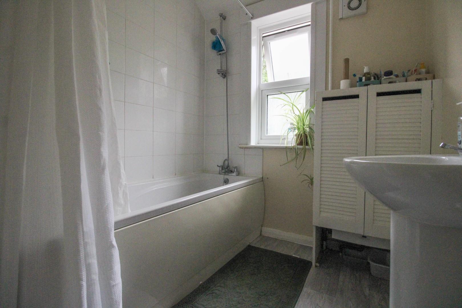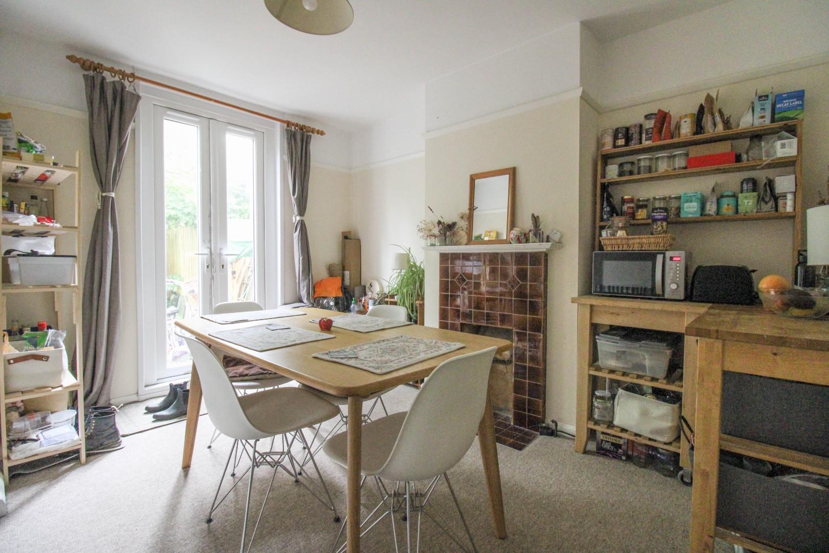 On the ground floor, the entrance hall has stairs to the first floor with storage under and access to the principal rooms. The front living room features a bay window and an attractive fireplace (not currently used). At the rear, the dining room also includes a fireplace and has French doors providing views of and access to the rear garden. With a range of fitted base and wall units, the kitchen has wood-effect worktops with tiled splashbacks, space for cooker with extractor hood over, space for fridge/freezer, plumbing for washing machine and a glazed door to the rear garden.