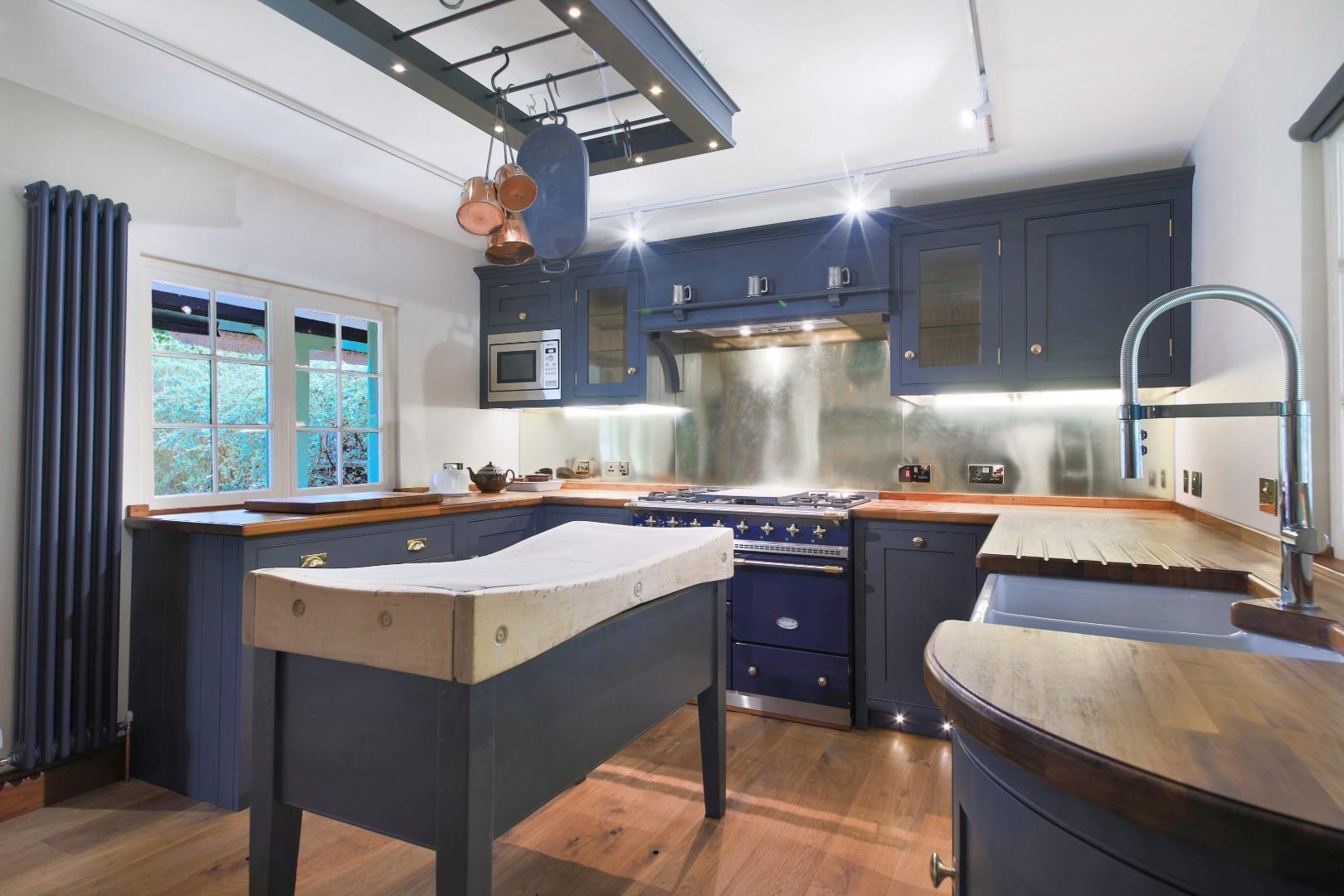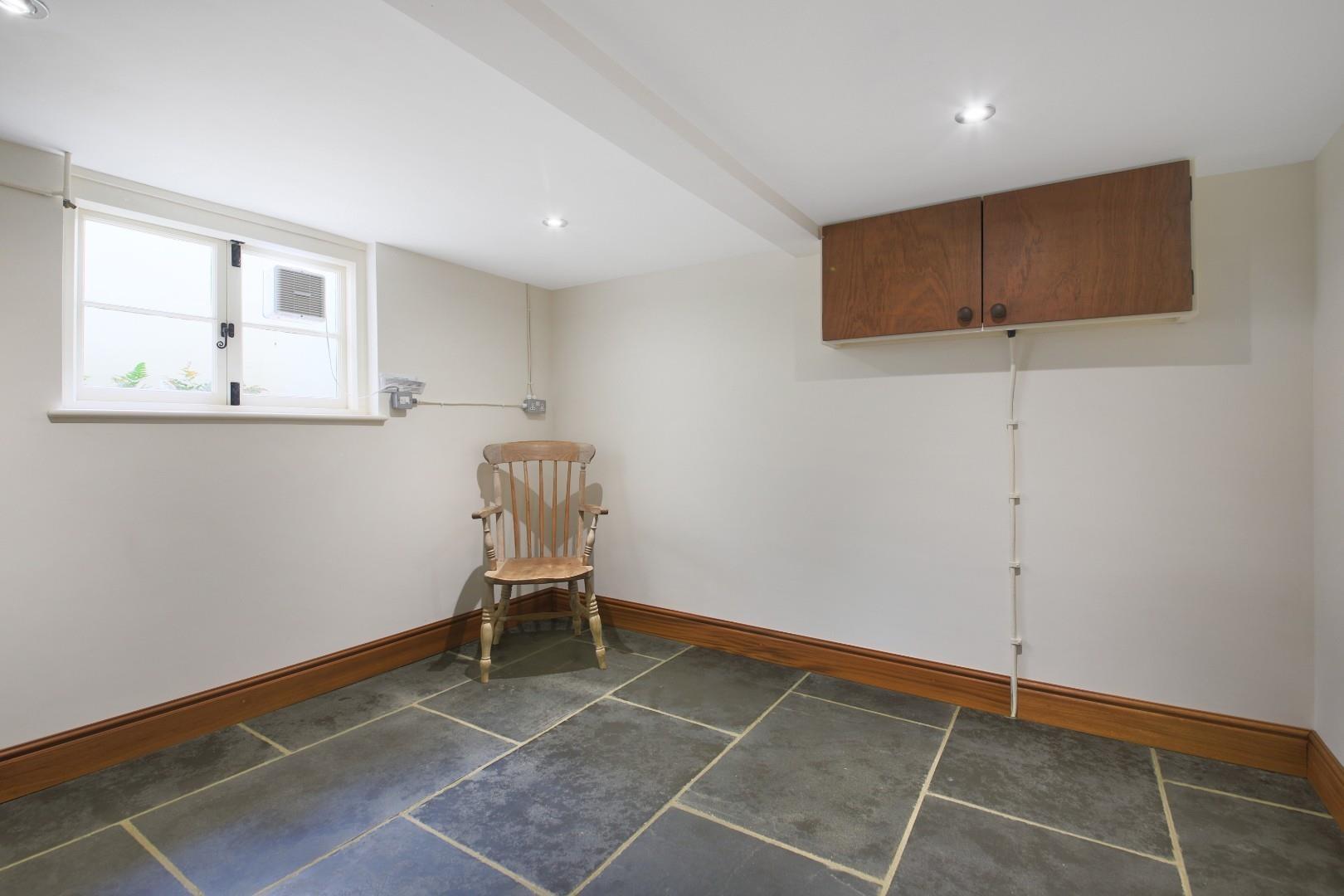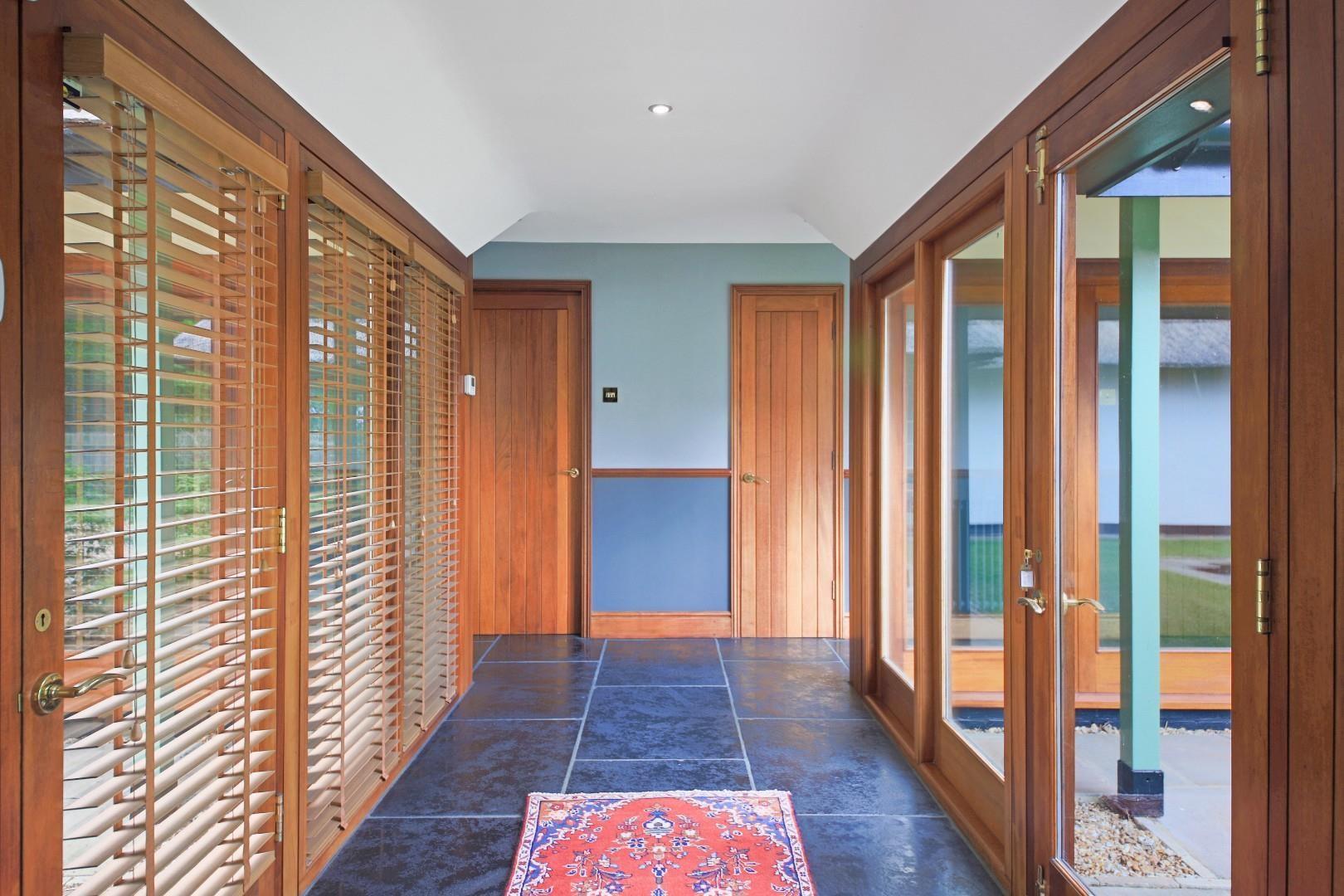 The accommodation comprises a part glazed, part timber ‘T’ shaped reception hall with views over the rear garden and a most attractive black limestone floor with a contemporary vertical radiator and a cupboard housing the gas-fired central heating boiler. This central glazed section of the house separates the living/sleeping and bathing quarters beautifully. The hand-crafted designer kitchen is fitted with beautiful cabinetry with brass fitments and ample African solid oak Iroko work surfaces with an integrated double sink unit with beveled drainer plus a further preparation sink. There is a range of integral appliances including dishwasher, fridge/freezer, larder fridge and a full freezer and all complemented by a classic stove with extractor over. The kitchen/dining area is cleverly divided by a central double-fronted fireplace with inset cast iron gas stove and exposed brick chimney breast and hearth. There is access from the kitchen to the cellar . The dual aspect sitting room boasts French doors with views and access over the garden, and a feature fireplace with inset cast iron gas stove. Off the inner hallway, there are four good-sized bedrooms including en suite facilities to the master bedroom and guest bedroom, and a family bathroom.