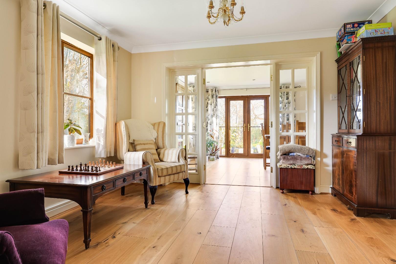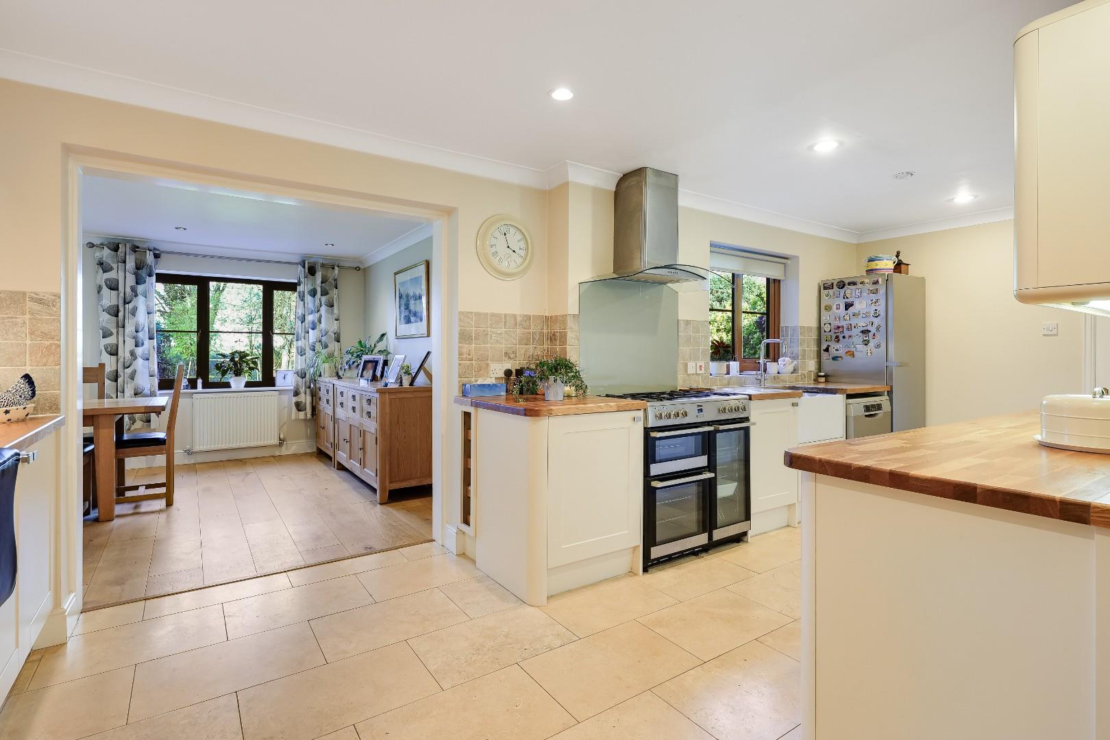 The accommodation comprises a large welcoming reception hall with stairs to first floor accommodation, coat cupboard, oak flooring and a cloakroom/WC just off. The dual aspect lounge boasts a feature gas fire and opens to the family room. Beyond is a substantial dual aspect dining/sitting room with oak flooring and French doors to the garden. The kitchen/breakfast room is fitted with attractive cabinetry, solid oak work surfaces/breakfast bar within inset ceramic butler sink, gas range style cooker with extractor over and space for a fridge/freezer and dishwasher. Just off is a handy utility room with a stable door to outside, door to garage and fitted with a range of base level and wall mounted storage cupboards, fitted work surfaces with inset single sink drainer plus space for a washing machine and a wall mounted gas fired central heating boiler.