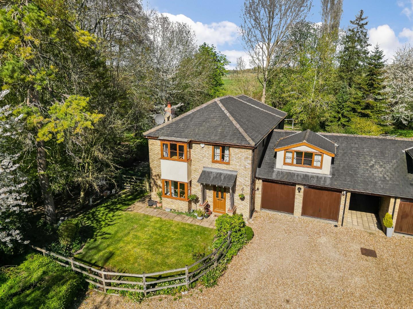 Outside, the property is approached via a video entry system through double gates and a shared gravelled driveway leading to the property which has both a gravel drive and a block paved area providing ample parking for several vehicles and leading to the double garage with two up and over doors, power and light connected and a small neat lawned front garden. Gated access leads to the side and rear gardens which are predominately laid to lawn with well stocked flower and shrub borders and beds, a selection of mature trees and hedging, vegetable and herb garden, a generous paved patio and gated access to the adjoining woodland. The front of the property has wonderful far-reaching views over the lake making this the most idyllic of settings yet so conveniently placed for Cambridge and Royston with both Shepreth railway station and Foxton railway station just a fifteen minute walk away.