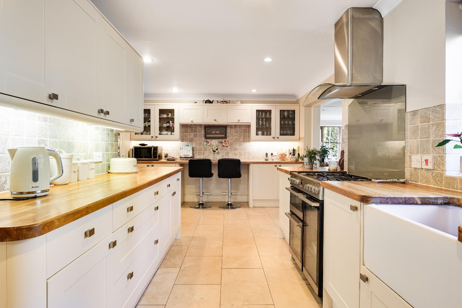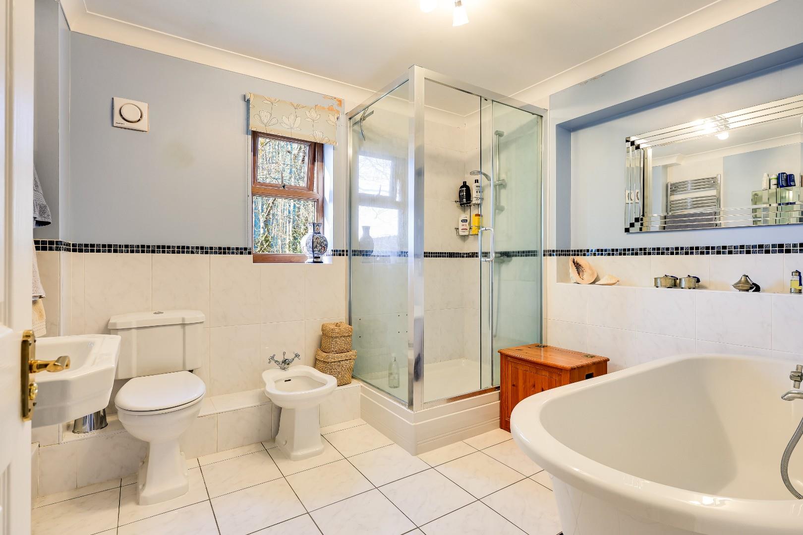 Upstairs, off the galleried split level landing are five good sized bedrooms, two of which have en suite bathrooms and a family bathroom with both a tiled shower cubicle and a roll-top claw foot bath.