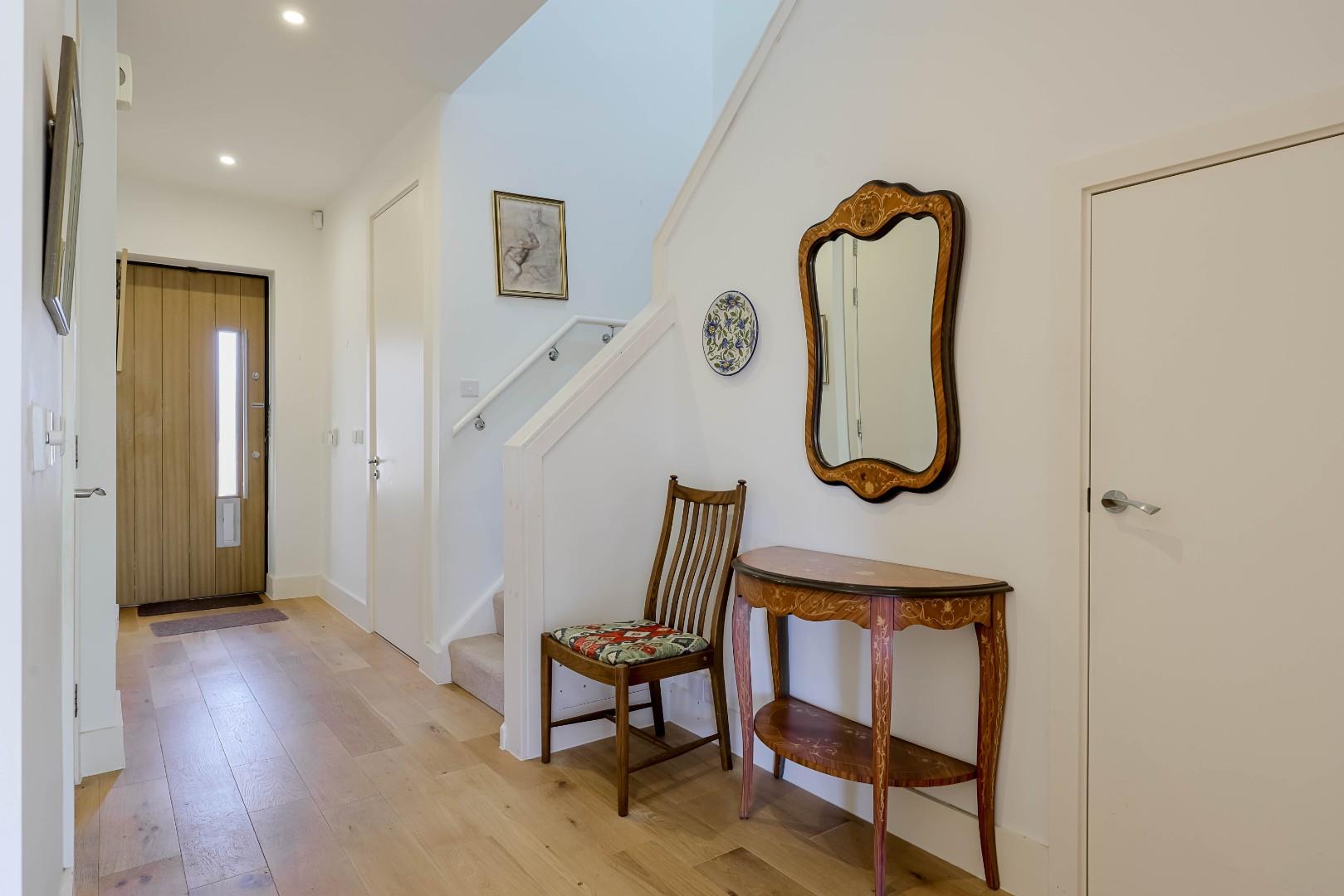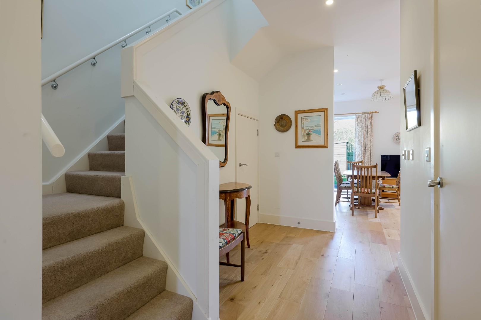 On the ground floor is an entrance hall, a large cloakroom and the utility room, which houses the mechanical ventilation system for the property and also has space for a fridge/freezer, washing machine and tumble dryer. The open plan kitchen/dining/family room makes up the rest of the ground floor accommodation, fitted with a stylish well-equipped kitchen and two sets of French doors, which open onto the garden.