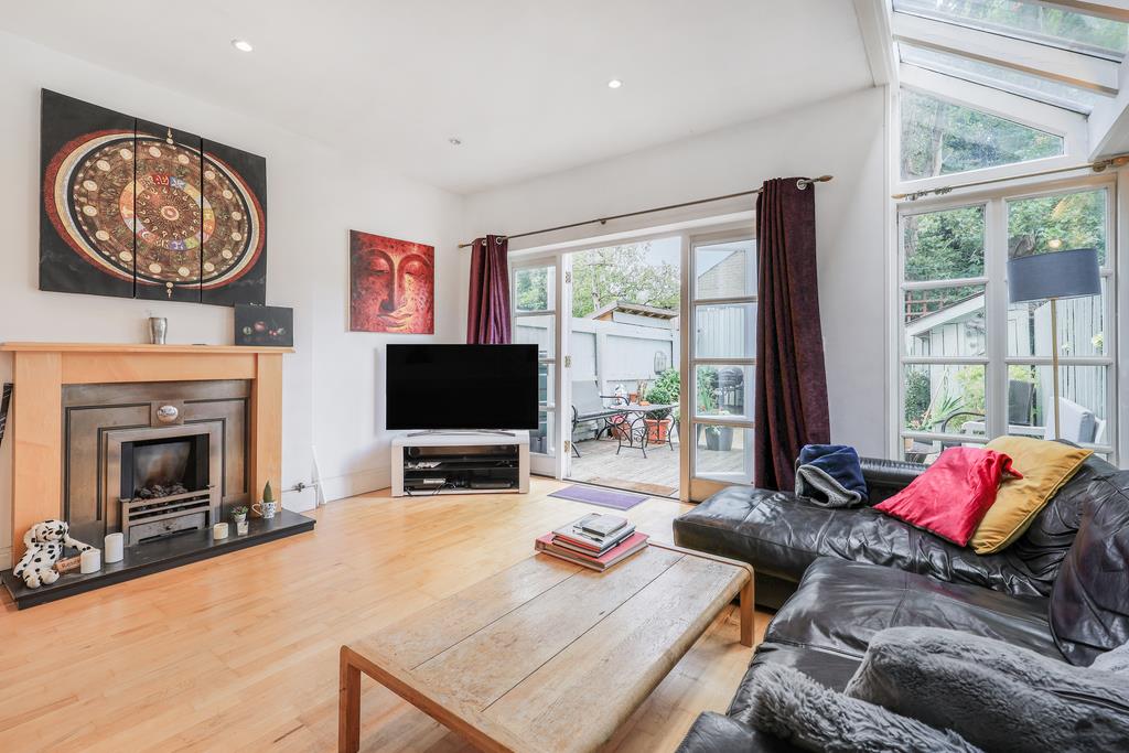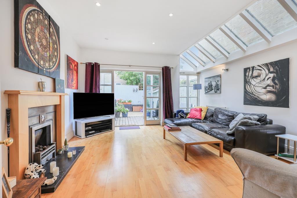 On the ground floor, the property enters into a spacious entrance hall which has stairs to the first floor with storage under and access to a cloakroom with WC. With a tiled floor and a range of fitted base and wall units, the kitchen/breakfast room has contrasting granite worktops, gas hob with stainless splashback, extractor chimney over and electric oven under, integrated fridge/freezer, dishwasher and washing machine. The impressive living room is sizeable and bright, with a part-glazed roof, French doors opening onto the rear garden and a feature gas fireplace.