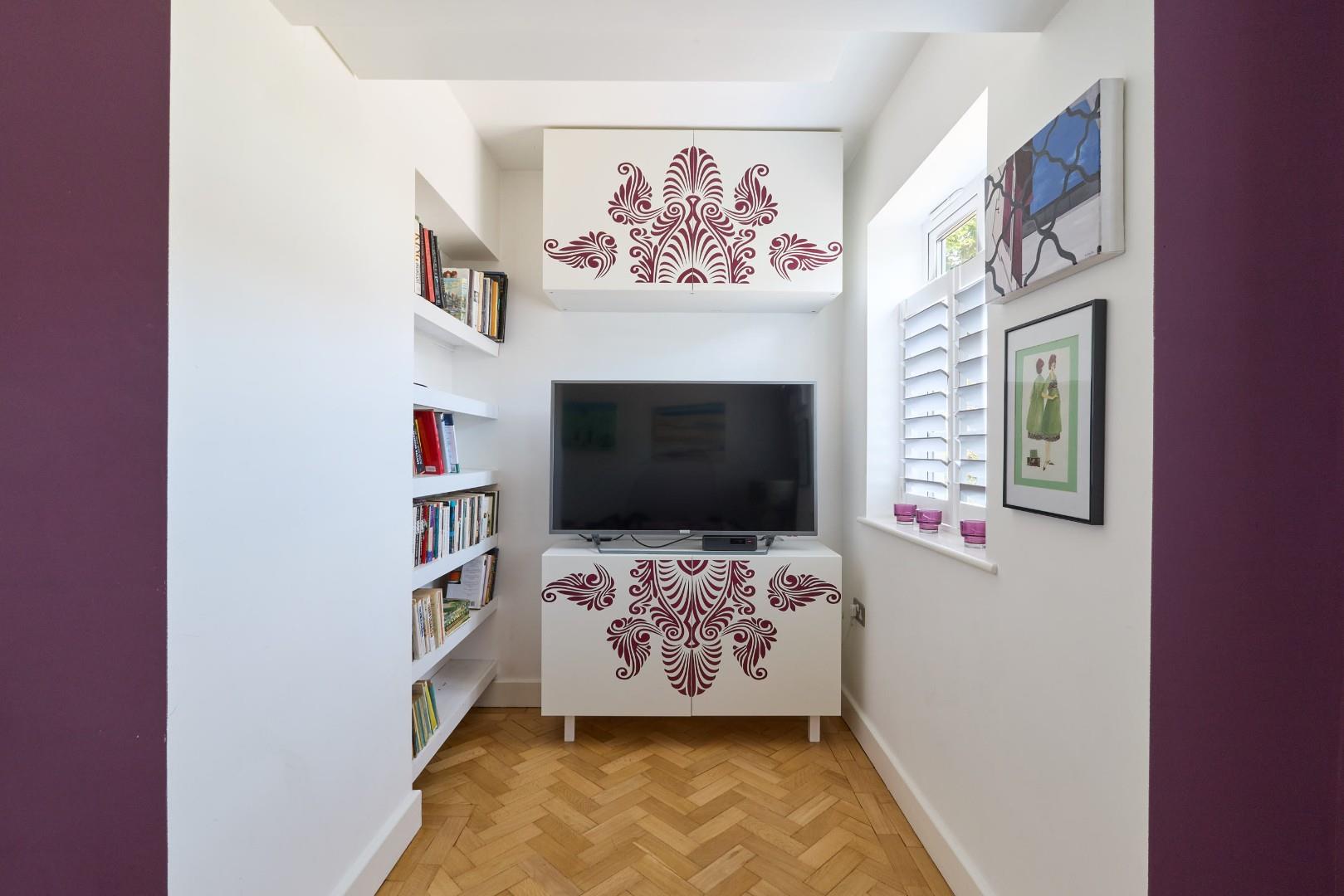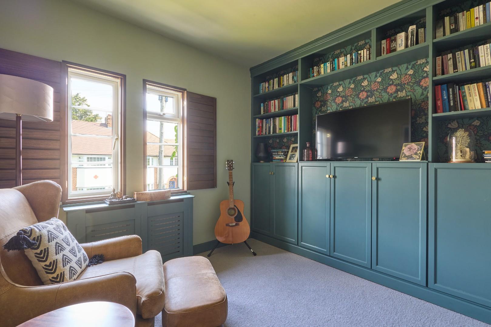 A large dual aspect sitting room opens onto a private patio area. Bespoke cabinetry and book shelving has been added and there is a feature fireplace with an inset wood effect stove (gas).