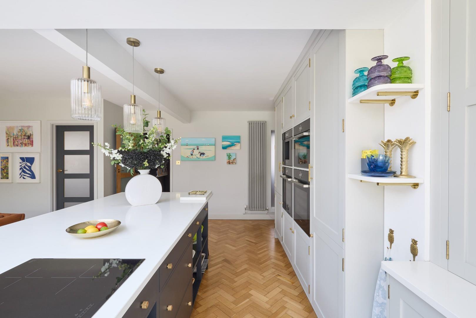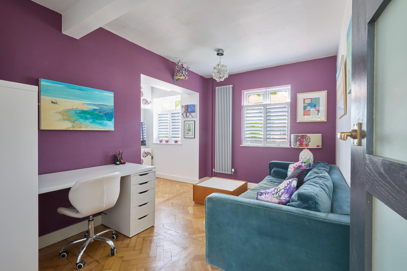 A snug/study with original parquet flooring and made to measure shutters, and a large utility room providing additional storage, a second fridge/freezer and wash hand basin, complete the ground floor level.
