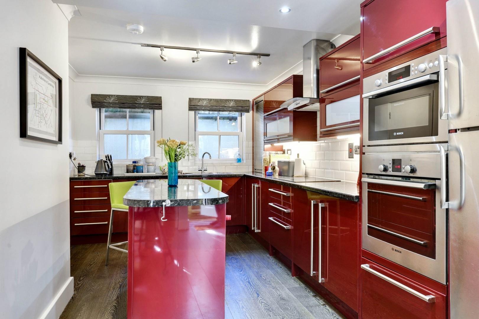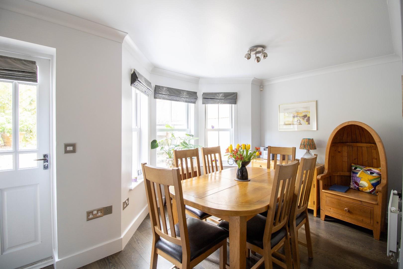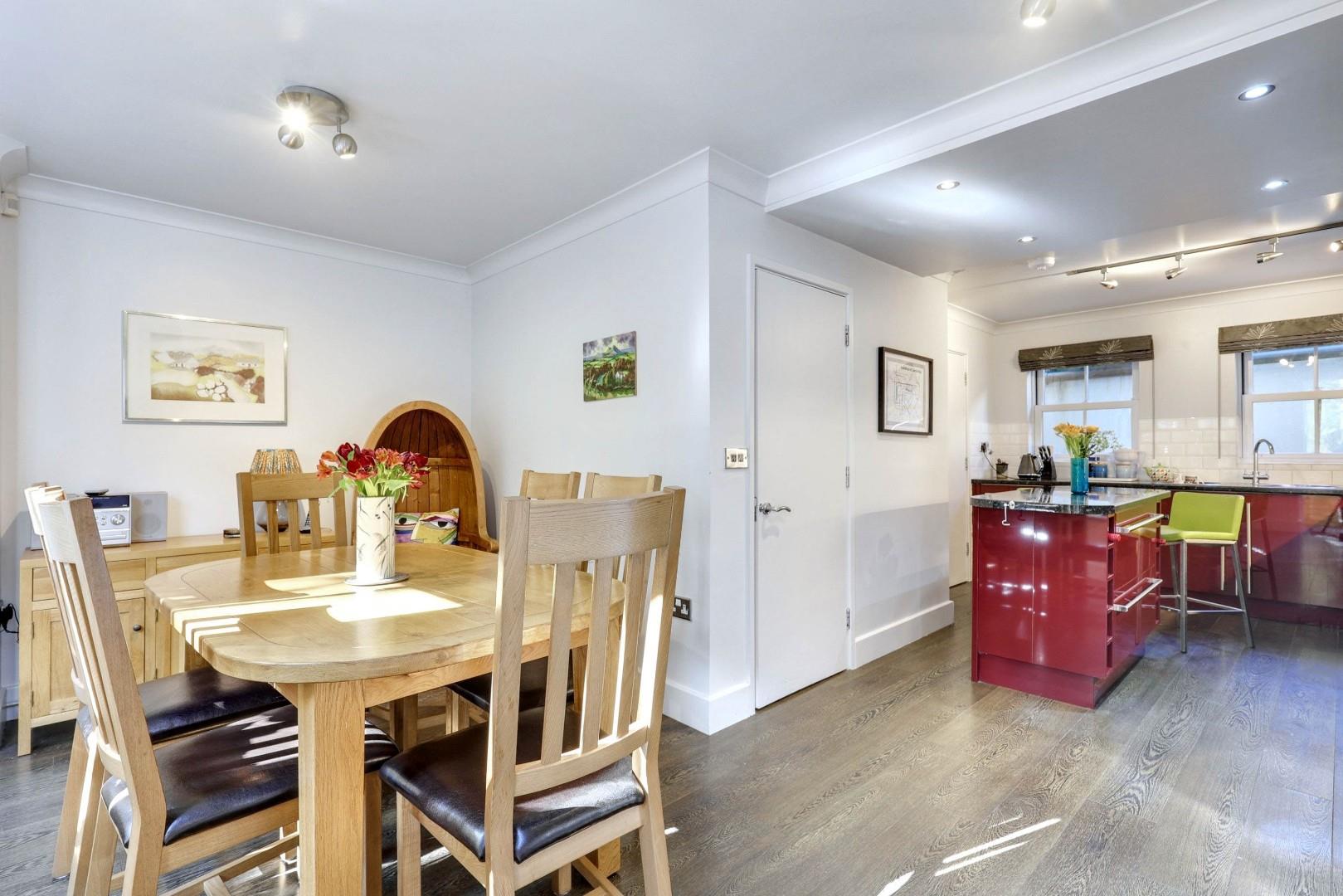 The lower ground floor has been altered, opened and refitted to create a light and generous kitchen/dining room with access to front and rear outside areas. The kitchen is well-equipped and has a range of matching contemporary units and drawers, a central island, extensive working surfaces and a range of integrated appliances. The dining area has an attractive bay with views of and access to the garden. A useful utility room leads to a secure front courtyard area, ideal for additional storage.