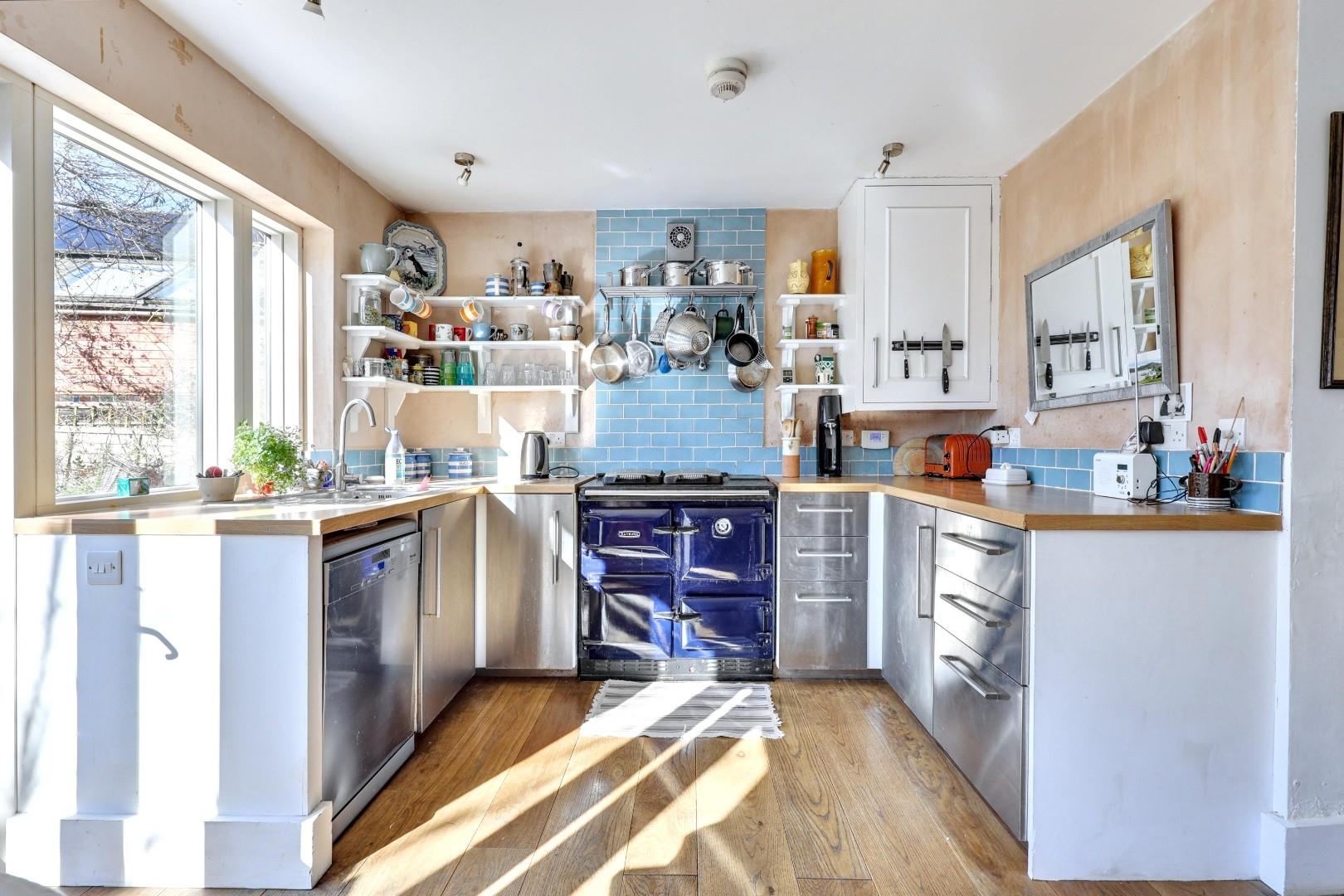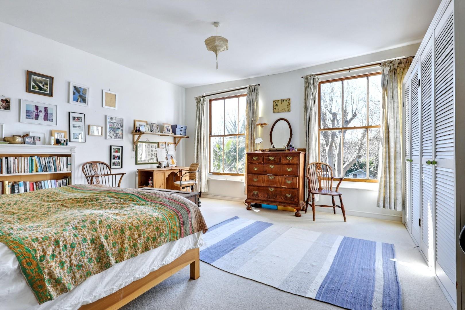 A charming and characterful sitting room of fine proportions with attractive period features and a woodburning stove leads to an impressive and broad kitchen/dining/living space with complete views of and access to the garden. A well-equipped kitchen provides a range of units with stainless steel doors, working surfaces, a Rayburn range stove and large, walk-in pantry with shelving and plumbing. The extensive dining area with a fitted window seat links to a seating area with a glazed roof (inspired by Kettle’s Yard). A second reception room with an inset woodburning stove is currently used as a studio and sitting room. A generous and well-designed wet room is off the second reception room and has access to the rear garden. A cloaks cupboard off the hallway completes the ground floor accommodation.