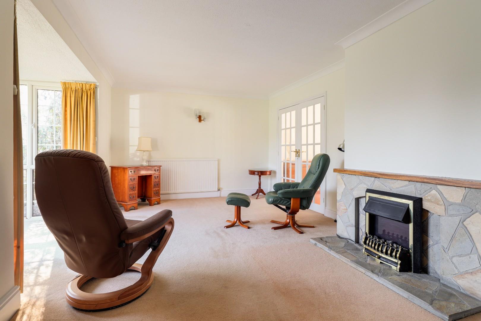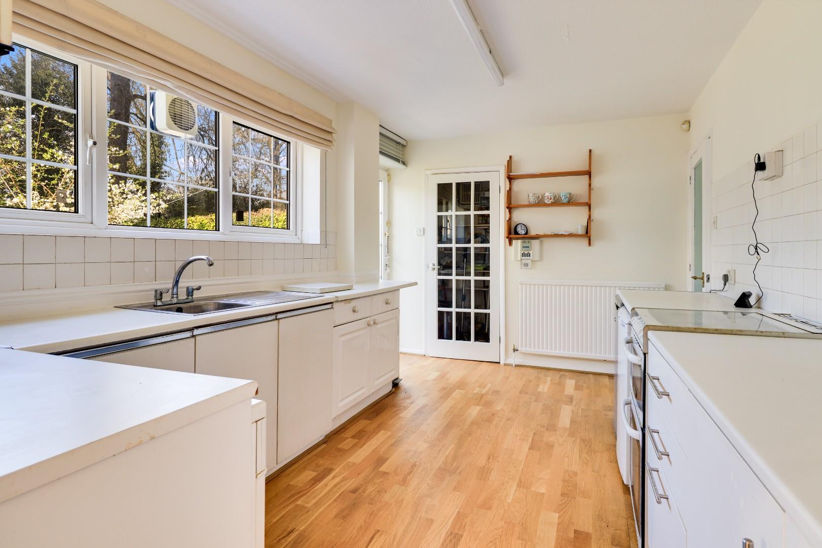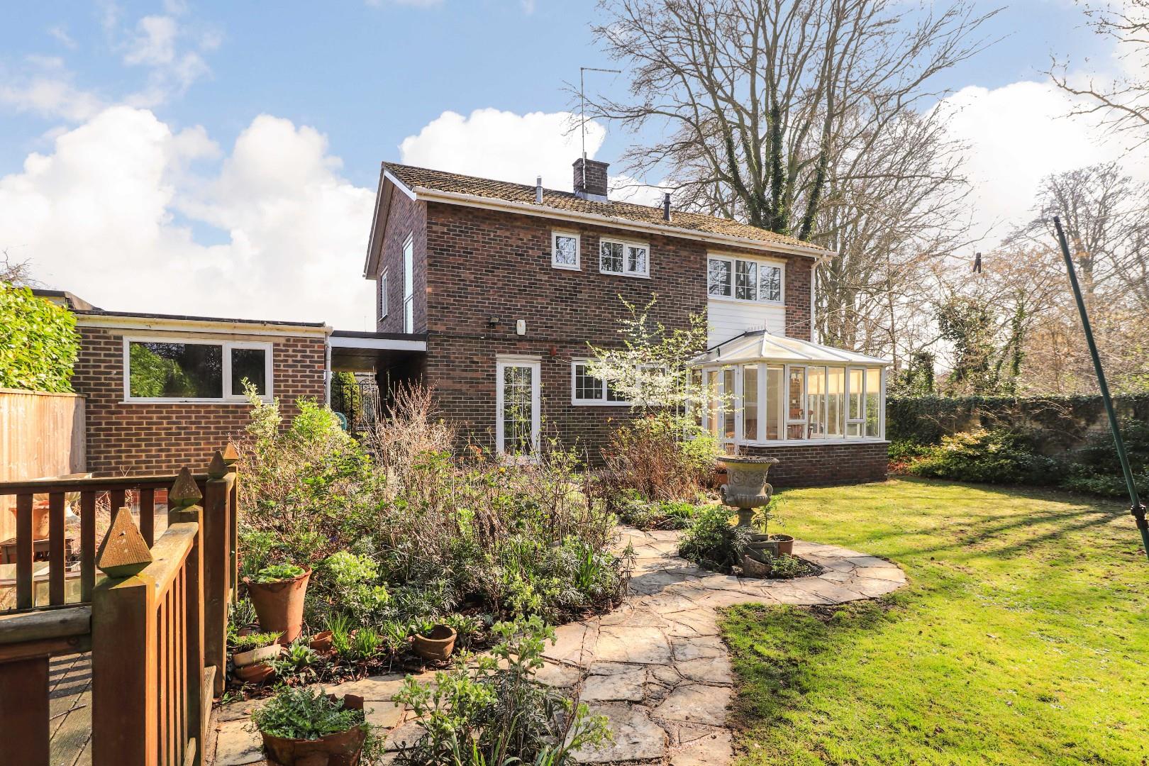 To the ground floor is a welcoming hallway with a WC adjoining and stairs leading up to the first floor. The property benefits from three reception rooms which includes a large living room with floor to ceiling bay window, a formal dining room with a set of double doors opening into the living area and a conservatory overlooking the rear garden and wooded area to the rear. In need of sympathetic improvement, the kitchen has plenty of storage and worktop space and benefits from a large pantry beneath the stairs.