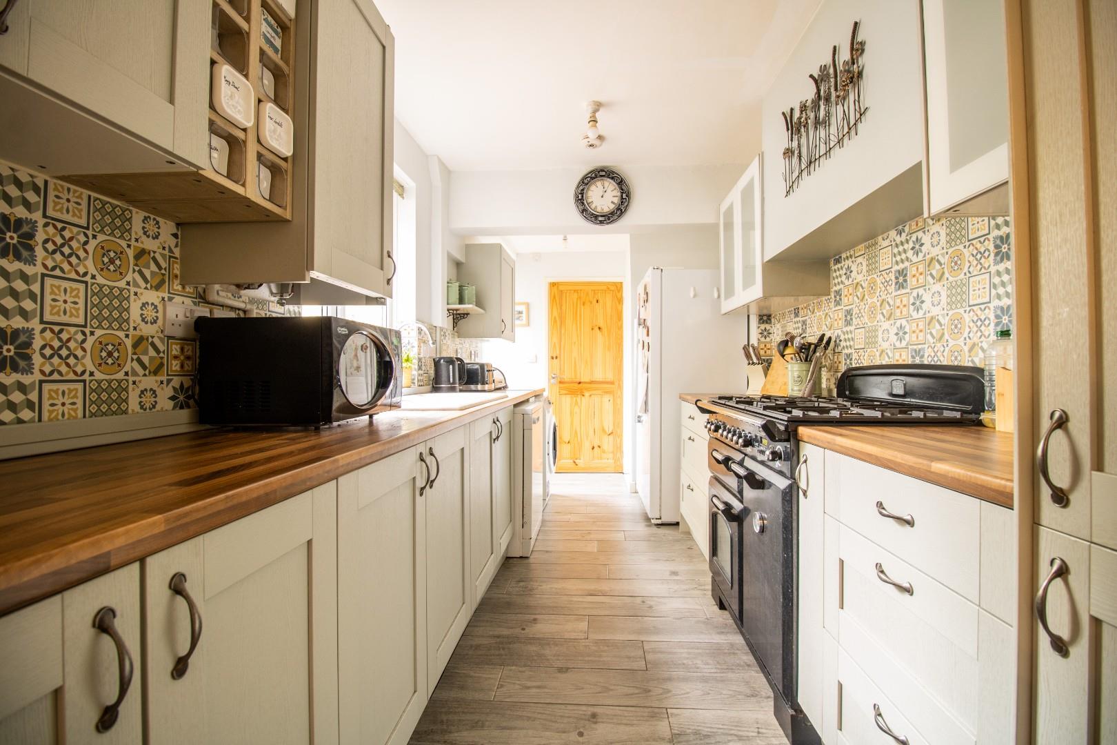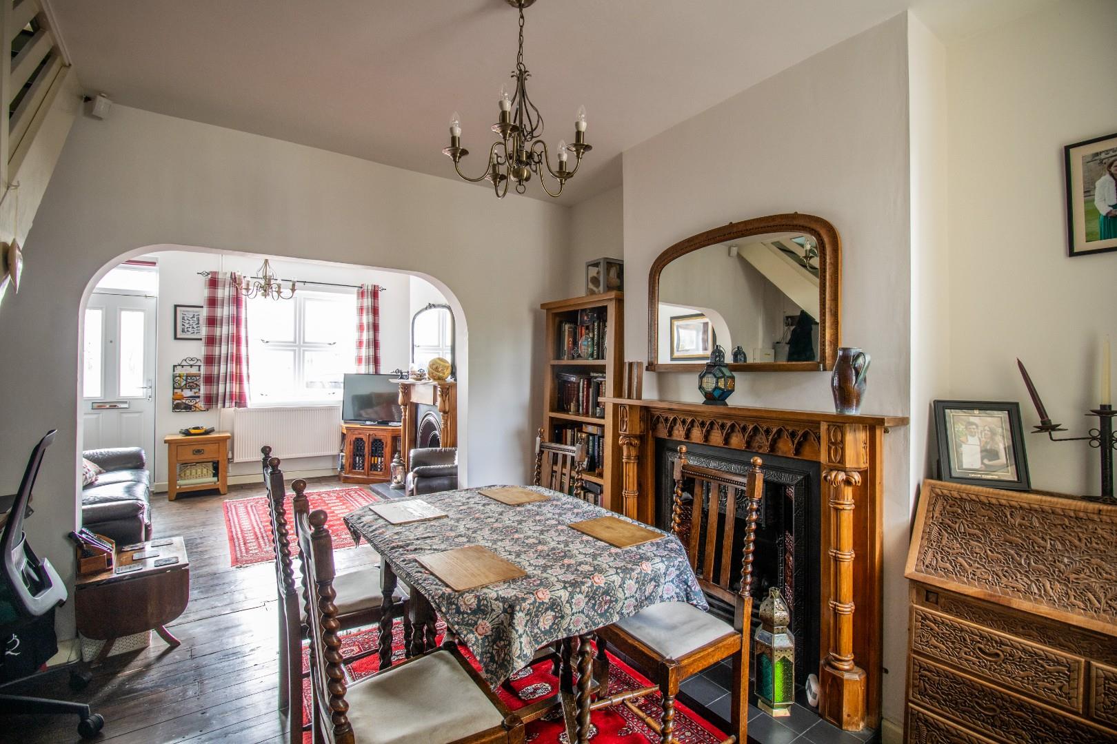 The accommodation briefly comprises a living room with a feature fireplace, finished with original wood flooring, which continues through to a dining room with a living-flame gas fire, contrasted by attractive tiled inserts and a carved hardwood surround. Stairs from the dining area lead up to the first floor. The kitchen has been fitted with a comprehensive range of units with space for a range-style cooker and additional space and plumbing for various freestanding appliances. A side door from the kitchen leads to the garden. The ground floor bathroom has been fitted with a modern white suite, including a shower over the bath, a wash hand basin with storage below and a W.C., finished with part tiled walls.