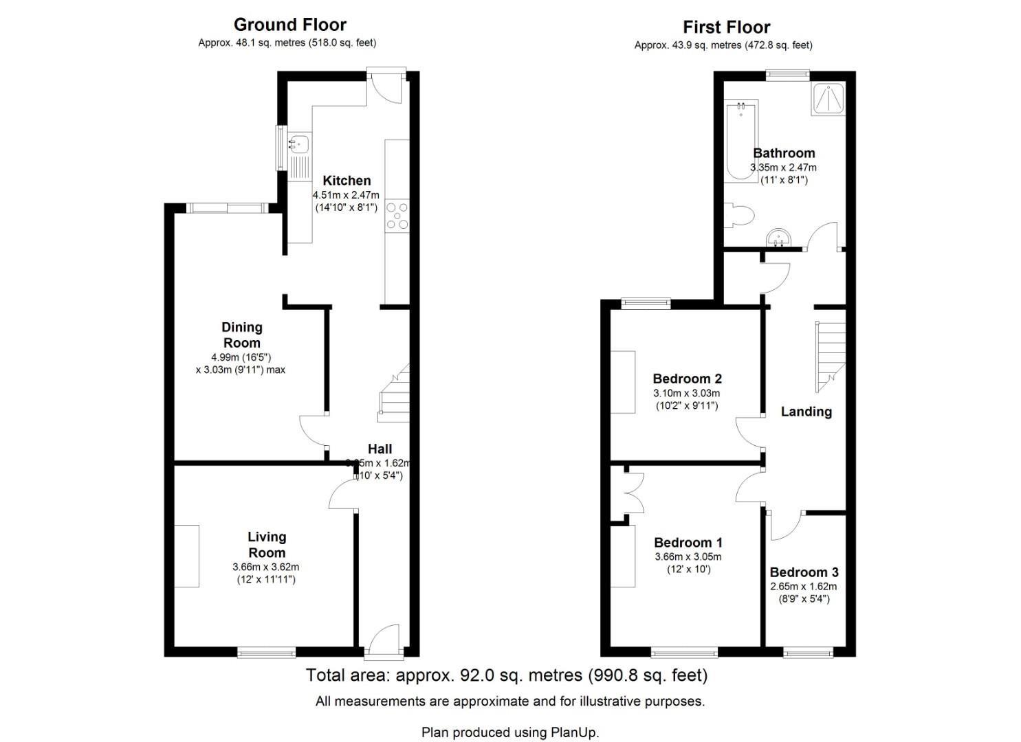 Upstairs, the first-floor landing leads to a storage area connecting to the family bathroom and three bedrooms.