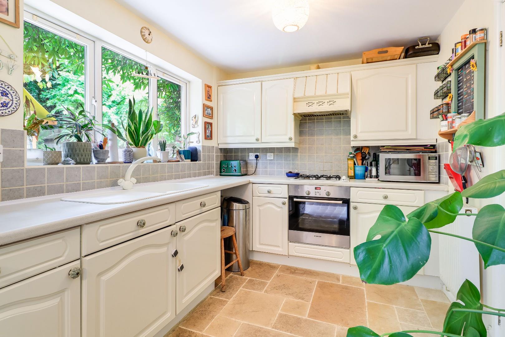 Upstairs, there are three bedrooms and two bathrooms, both of which were replaced in 2020. The master bedroom suite benefits from fitted wardrobes as well as an en-suite shower room with feature green tiles and a double enclosed shower. The further two bedrooms are each served by the family bathroom, which has feature blue tiles, and a panelled bath with an overhead shower.