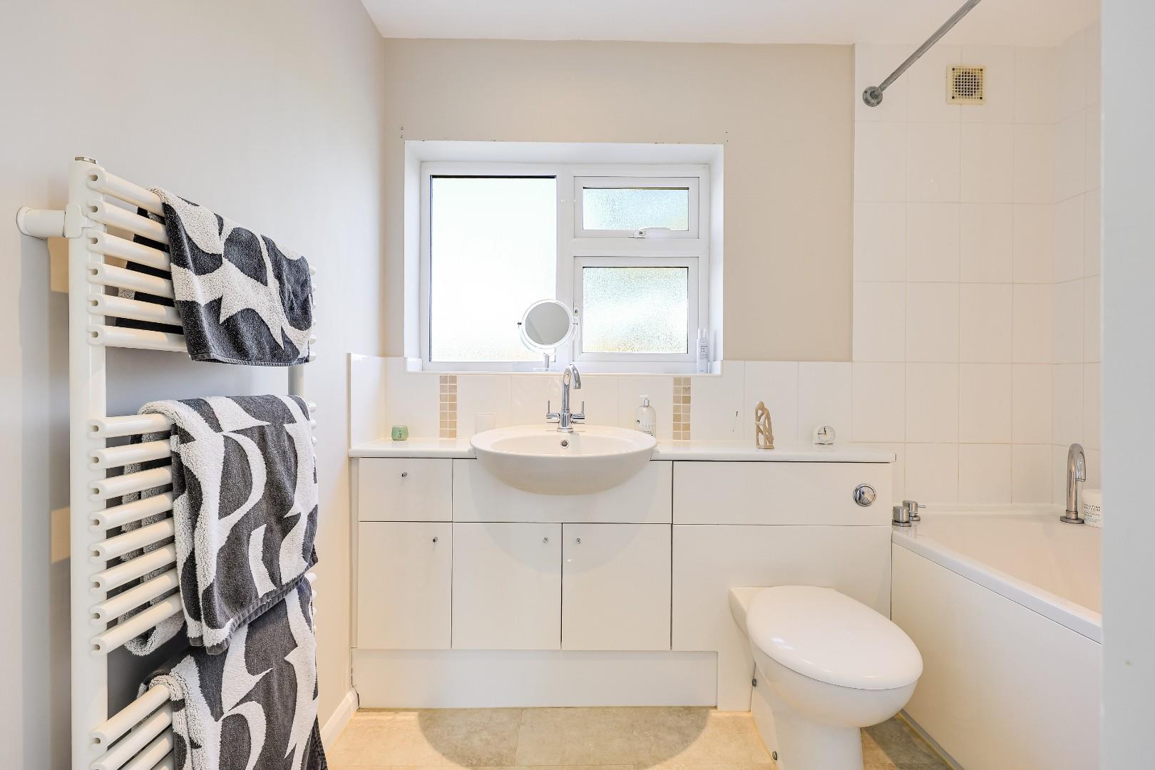 The first-floor accommodation comprises of three bedrooms, all with built in wardrobes/storage, two of which are double bedrooms. The family bathroom is fitted with a three-piece white suite, with bath and overhead shower and heated towel radiator.