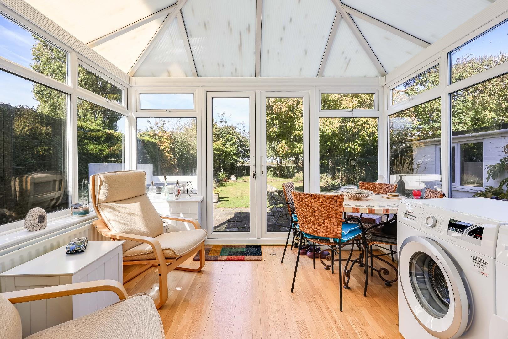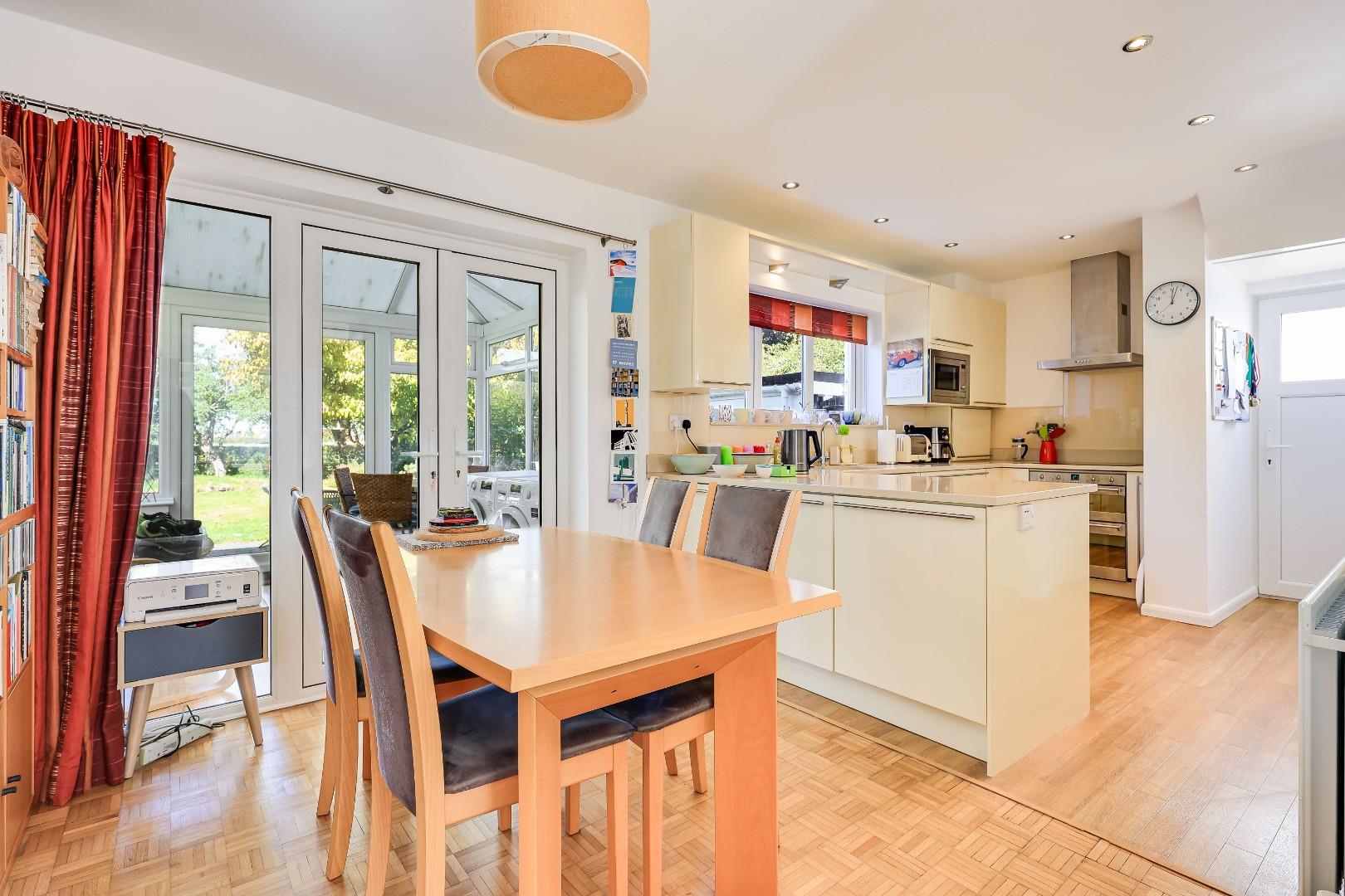 Upon entering the property you have a light welcoming entrance hall, with WC and stairs leading to the first floor. Most of the ground floor accommodation is made up of a mostly open plan, kitchen/dining/living room, with feature fireplace breaking the space up, enabling the living room to remain separate and private from the kitchen. The living room is flooded with natural light from large glazing, and offers ample living space, flowing through to the dining room. With French doors into the conservatory and further French doors to the garden. The kitchen is fitted with a range of base and eye level modern cabinetry, integrated fridge freezer, induction hob, ovens, microwave oven, inset stainless steel sink and dishwasher.