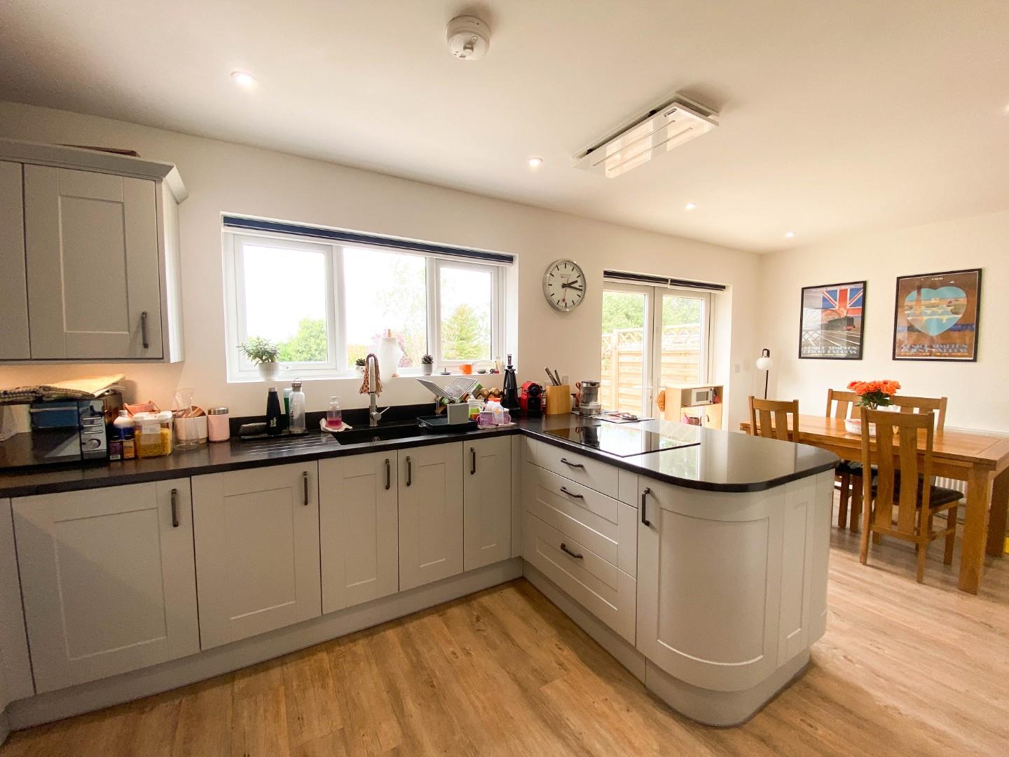 The property enjoys a tranquil position tucked-away towards the end of this highly sought-after, no through road with views over fields to the rear. The current owners have transformed the property with a program of full refurbishment including a new heating system, windows, doors including most attractive solid oak internal doors, a new kitchen and bathroom. The accommodation comprises a welcoming reception hall with karndean flooring, stairs to first floor accommodation and a re-fitted cloakroom/WC just off. The sitting rom, again with karndean flooring opens to a dining area with French doors to the garden. The kitchen has been re-fitted with attractive modern cabinetry, ample quartz working surfaces with inset single sink unit with bevel drainer, induction hob, extractor plus space for a fridge/freezer. off the side lobby there is a door to outside and a fitted cupboard with plumbing for a washing machine.