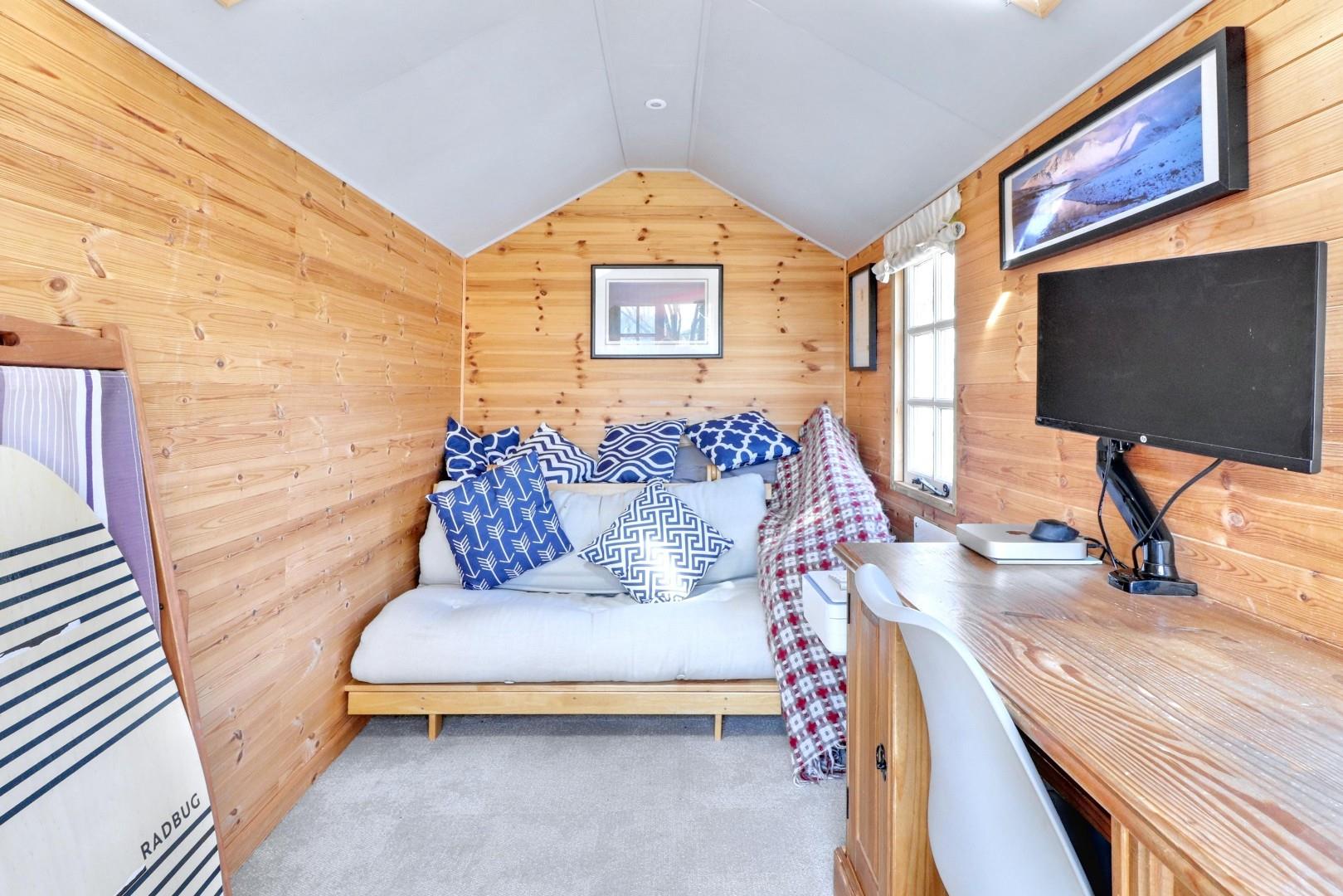 Externally – The property has a generous rear garden which has had a detached, timber-built garden studio erected which is ideal as a home office or gym. The remainder of the garden is enclosed, laid predominantly to lawn and has a courtyard area directly off the rear patio door.