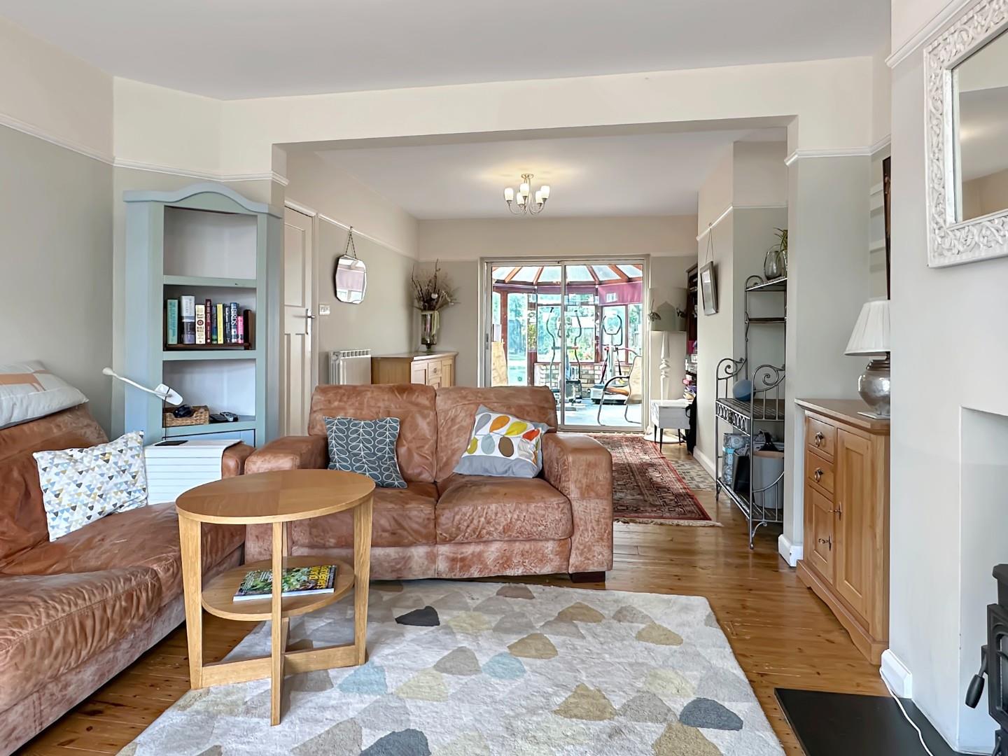 The accommodation comprises an entrance hall, a well-equipped kitchen providing dual aspects and access to a paved patio area, a generous bay-fronted sitting/dining room with attractive wood flooring and inset gas stove. A conservatory off the main reception room completes the ground floor accommodation.
