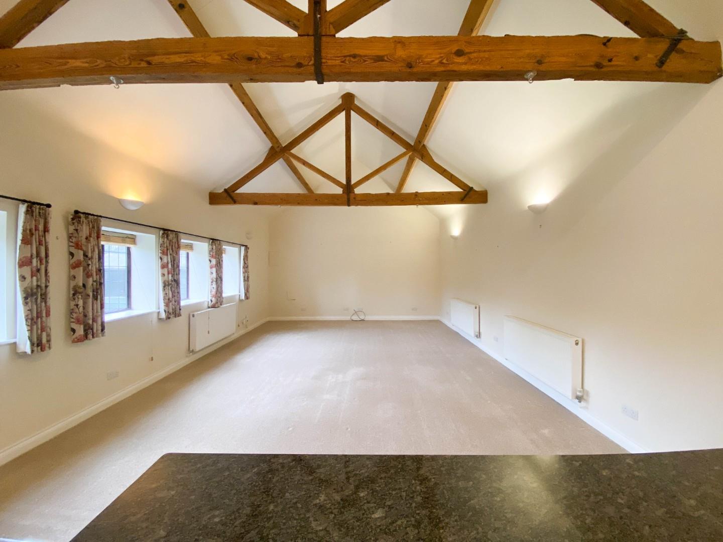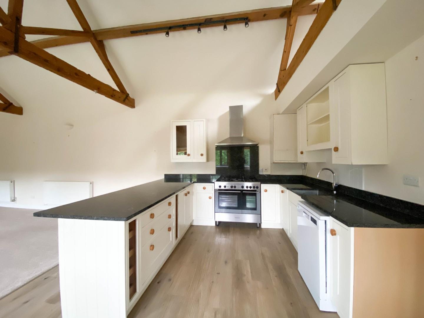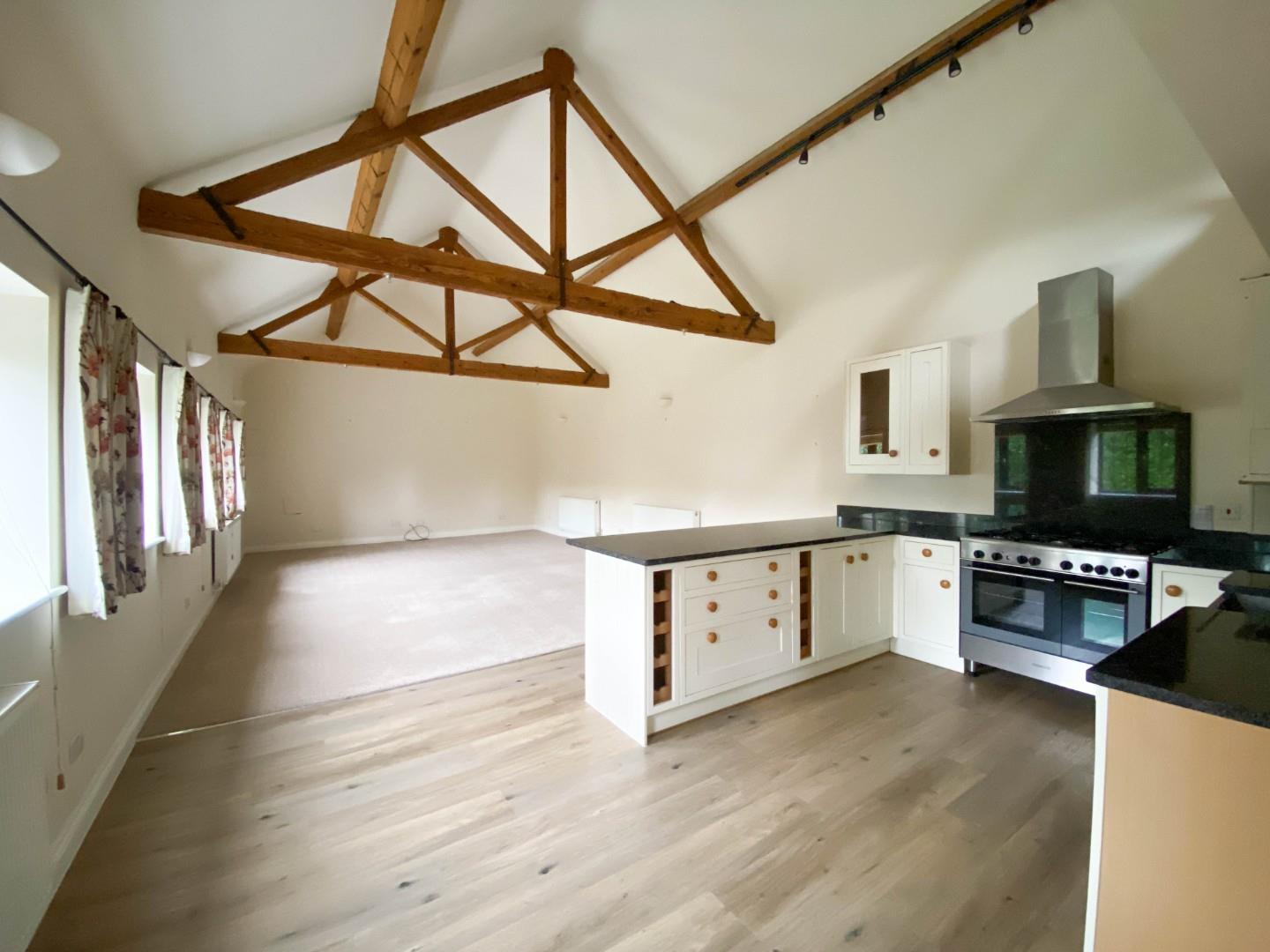 The accommodation comprises a welcoming reception hall with slate flooring, stairs to first floor accommodation, storage cupboard under with plumbing for a washing machine and a luxury shower room just off. There is a generous ground floor bedroom with fitted wardrobe cupboards and an ensuite boasting a walk-in shower. The open plan kitchen/dining/sitting room boasts a high vaulted ceiling with exposed timber beams and a number of windows overlooking the garden. The kitchen area is fitted with attractive cabinetry, ample granite working surfaces/breakfast bar with inset single sink unit with bevel drainer. There is a Kenwood five ring gas range style cooker with extractor over plus space for an American style fridge/freezer and dishwasher.